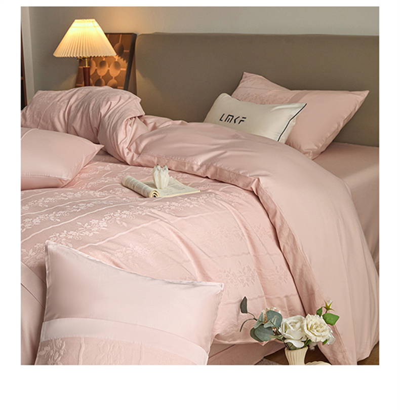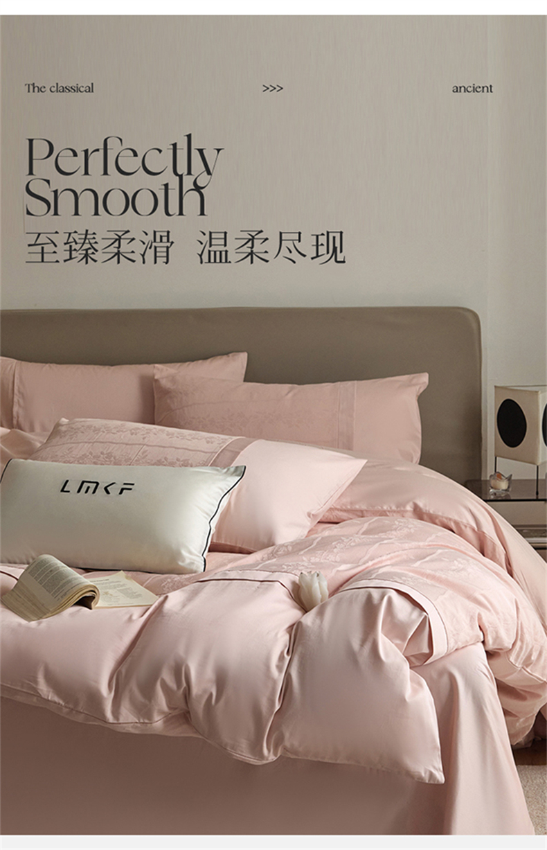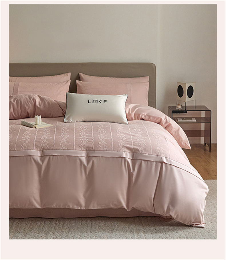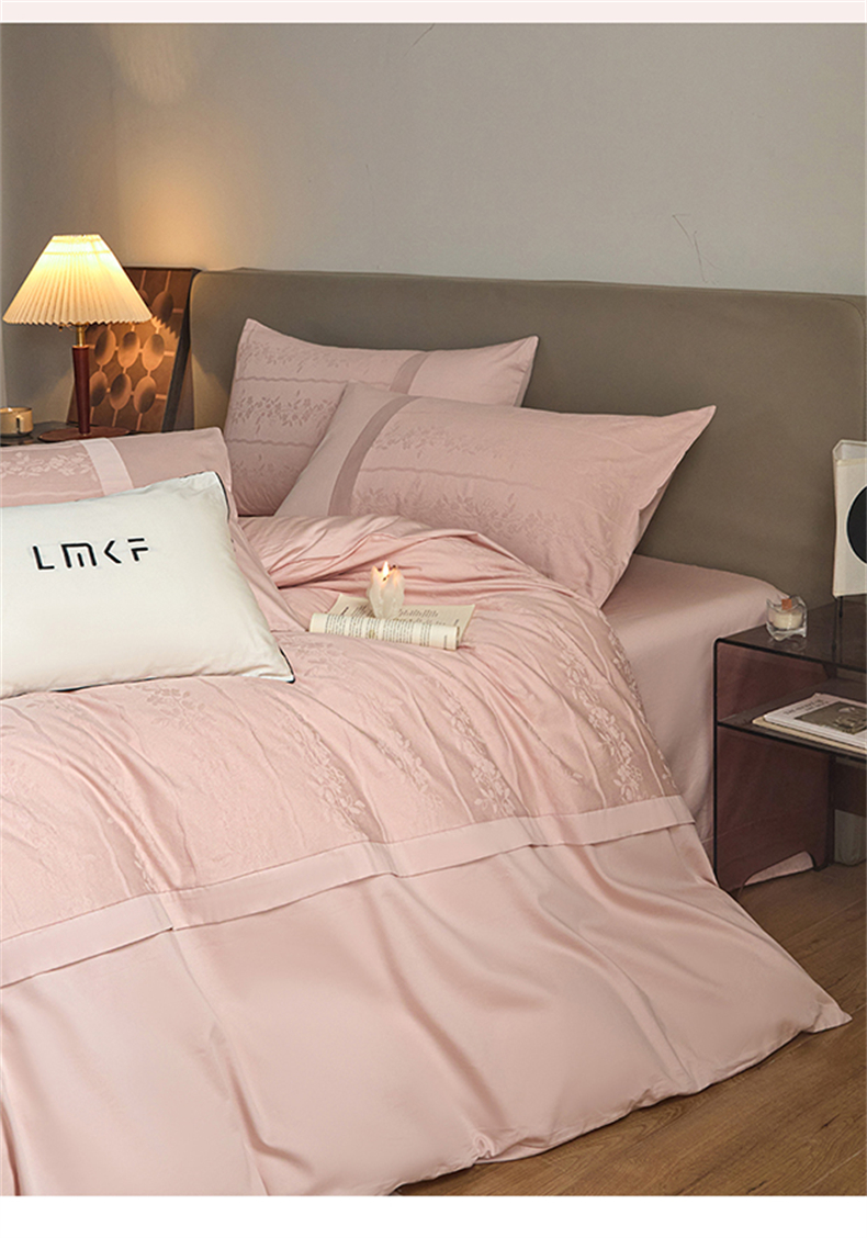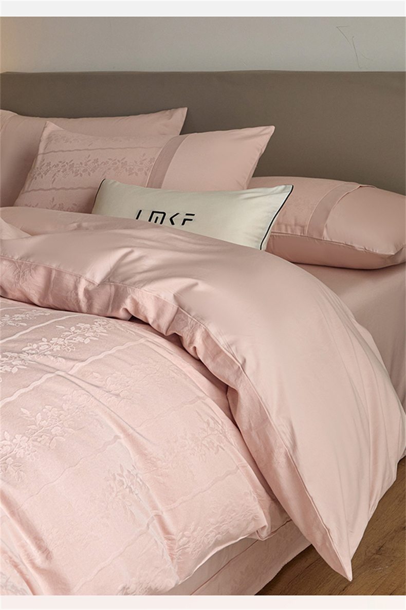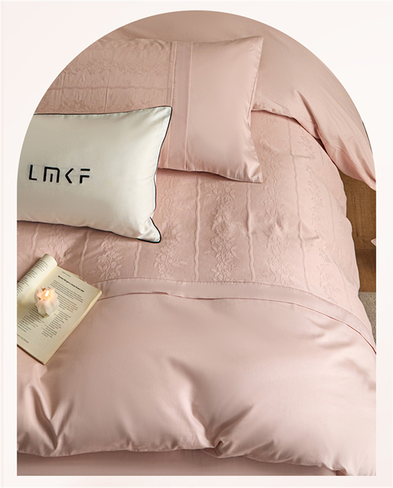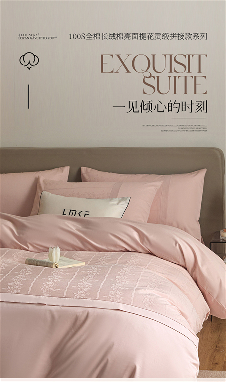 蓝米卡夫 2026春季新款-100S全棉亮面提花贡缎长绒棉拼接款(礼盒) 浪漫情缘-唯美粉