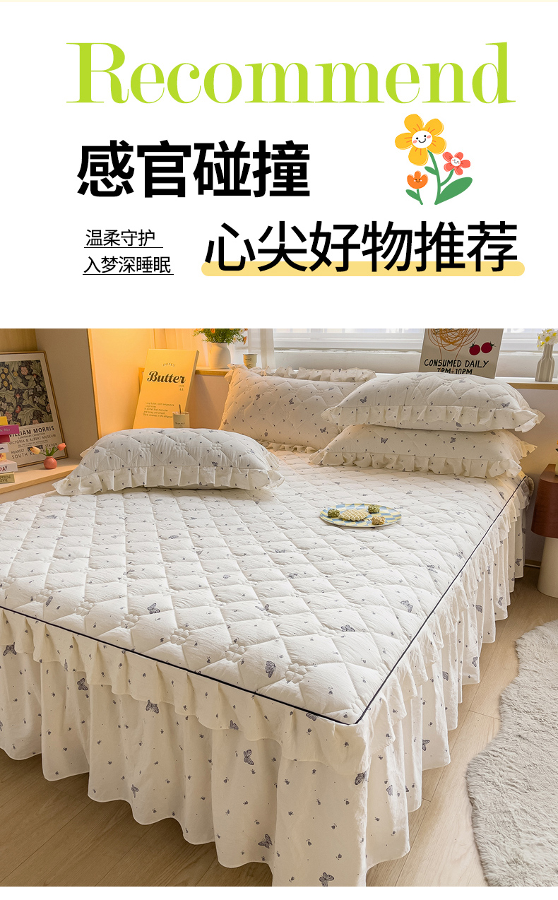优家居 2026新款精仿棉夹棉床裙三件套水洗棉韩版公主风花边床裙直播外贸定制 蝶舞翩翩