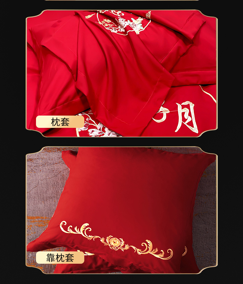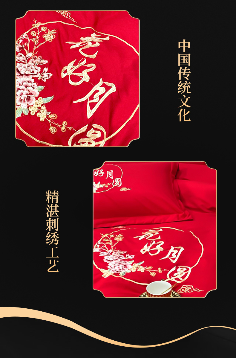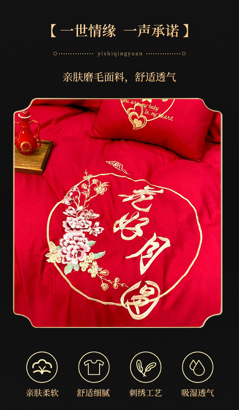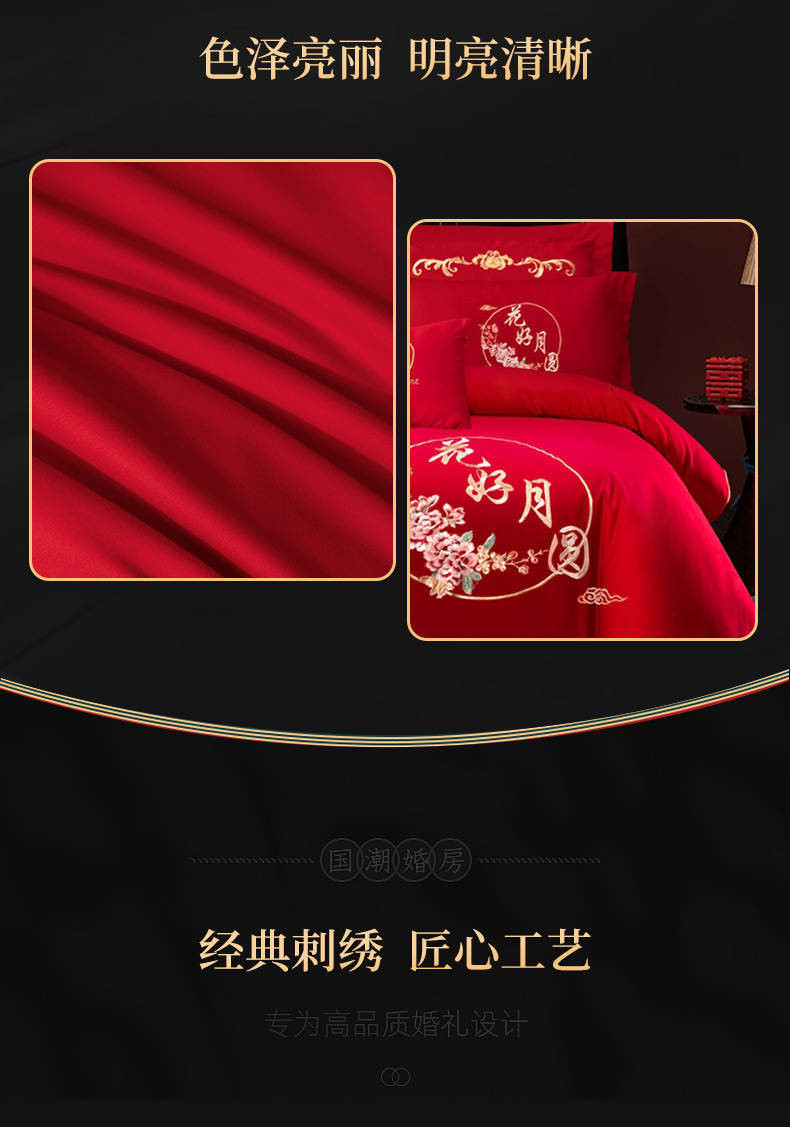 当前位置: 91家纺网 > 商品网购 > 床品套件 > 四件套 > 婚庆四件套 > 慕她家纺 2026年磨毛亲肤棉婚庆四件套大红色刺绣结床上用品 花好月圆