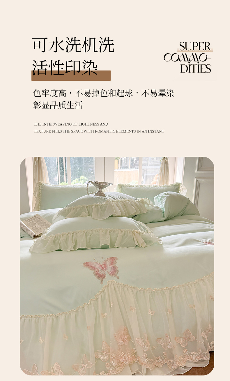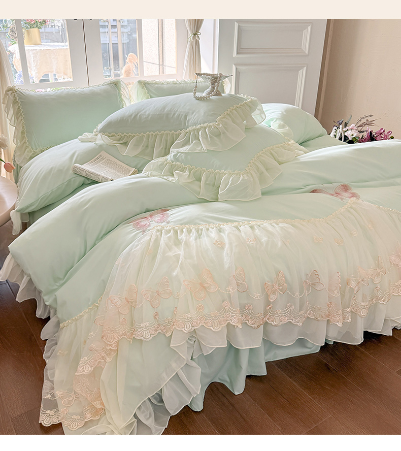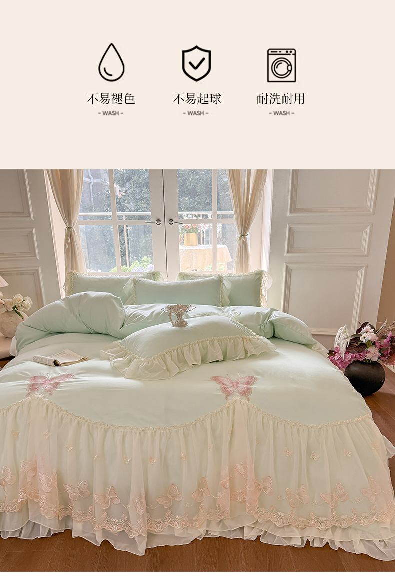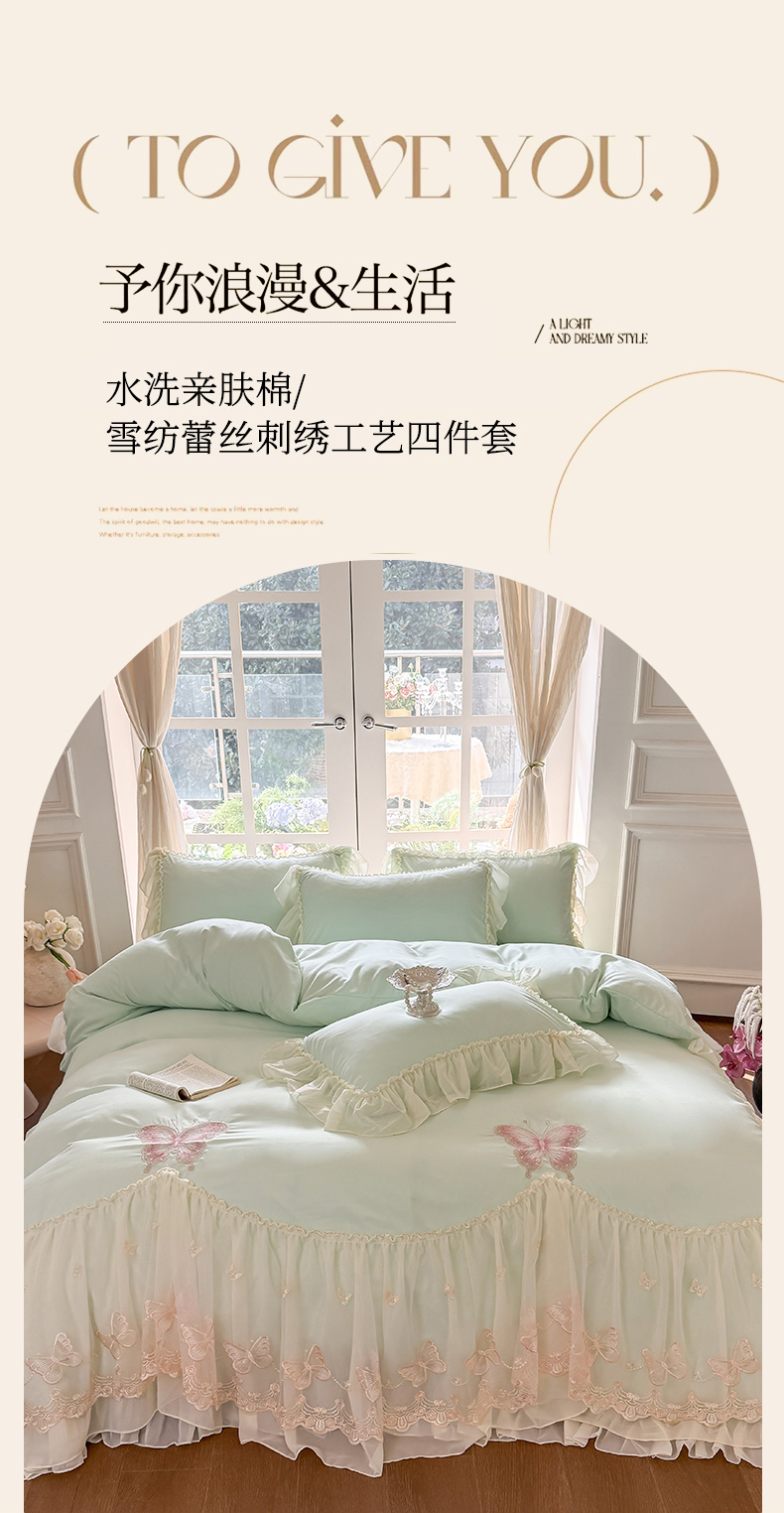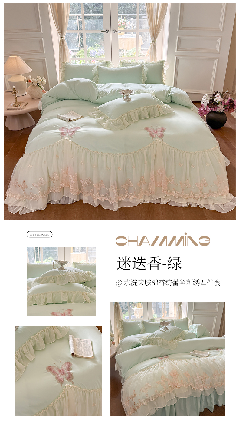 当前位置: 91家纺网 > 商品网购 > 床品套件 > 四件套 > 水洗棉四件套 > 富盛家纺 2026新款水洗亲肤棉雪纺蕾丝刺绣公主风韩版四件套-迷迭香 迷迭香—绿