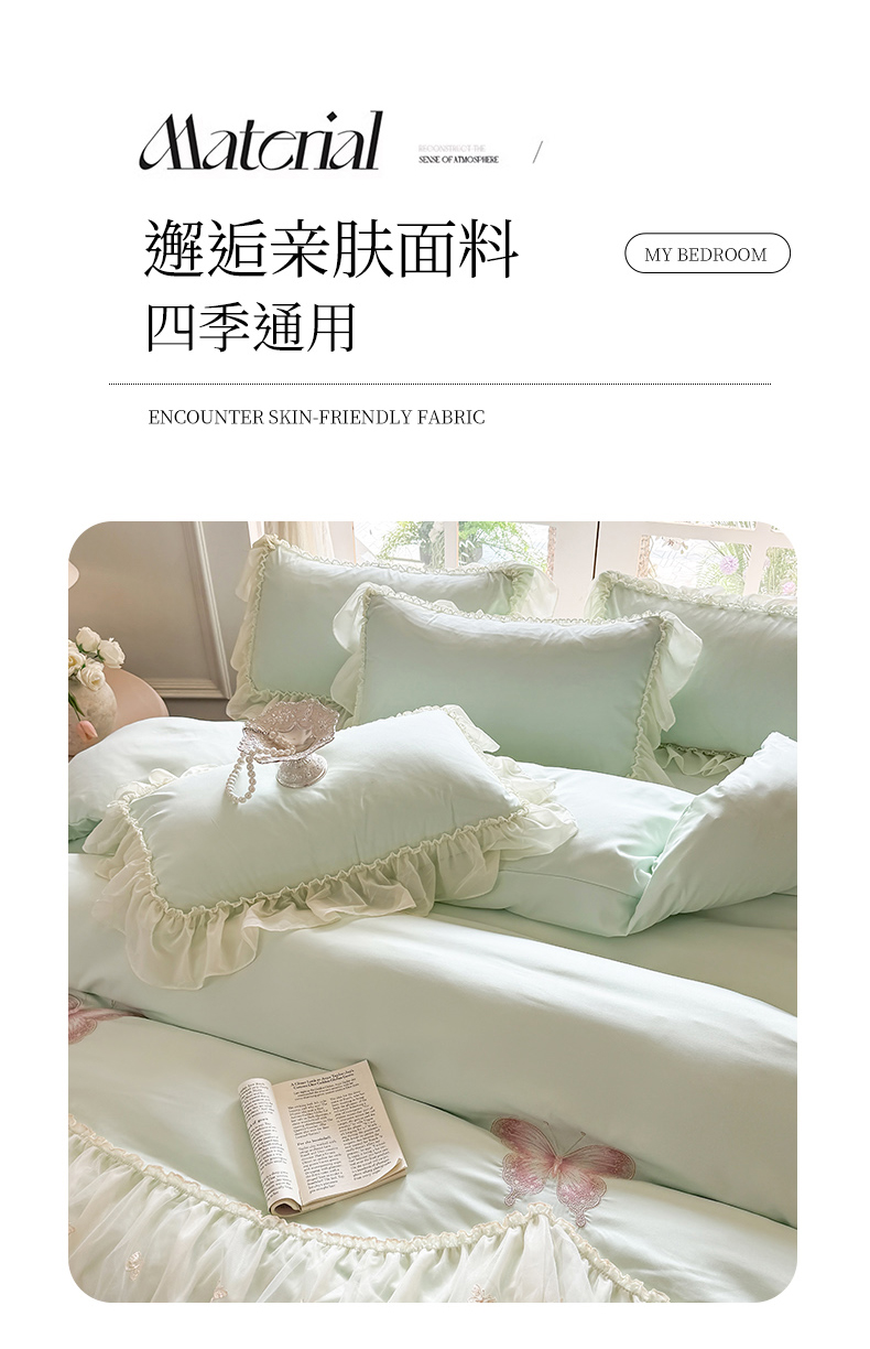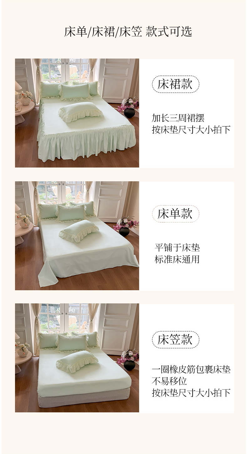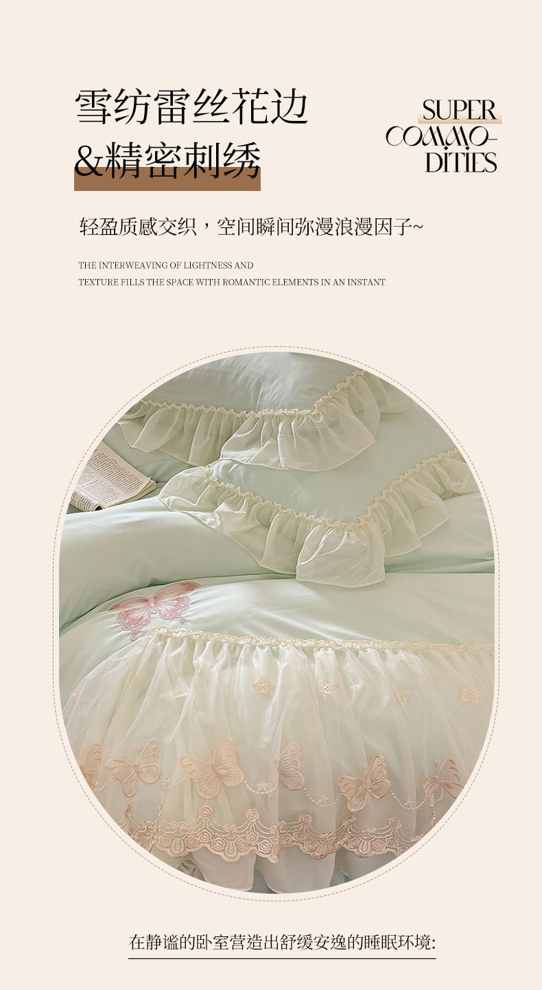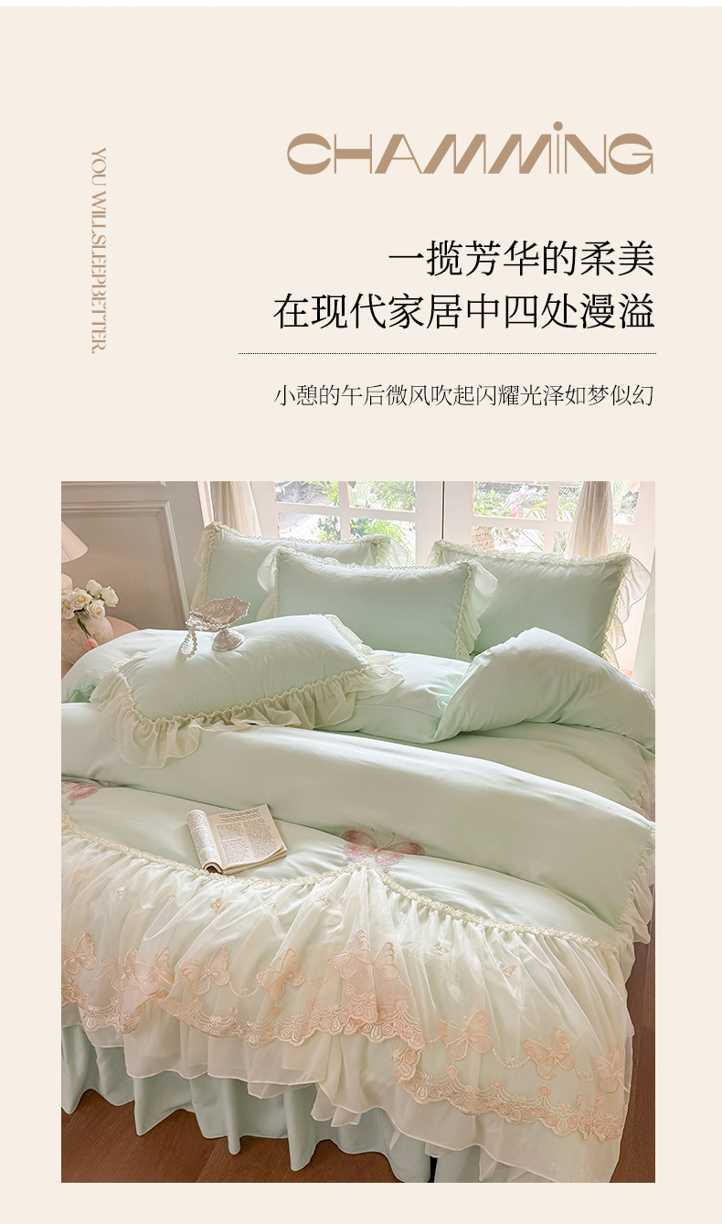 当前位置: 91家纺网 > 商品网购 > 床品套件 > 四件套 > 水洗棉四件套 > 富盛家纺 2026新款水洗亲肤棉雪纺蕾丝刺绣公主风韩版四件套-迷迭香 迷迭香—绿