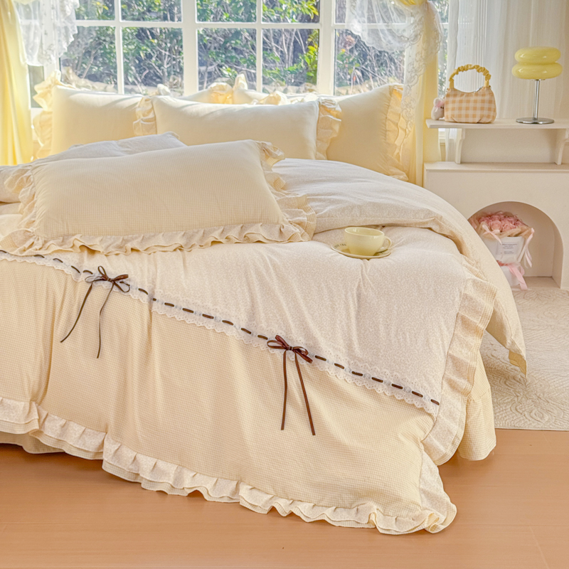 (总)赛丽雅 2026年新款直播爆款双层花边拼接蝴蝶结工艺款四件套床上用品,南法假日-姜黄,南法假日-桃粉,南法假日-天空蓝,南法假日-仙草绿