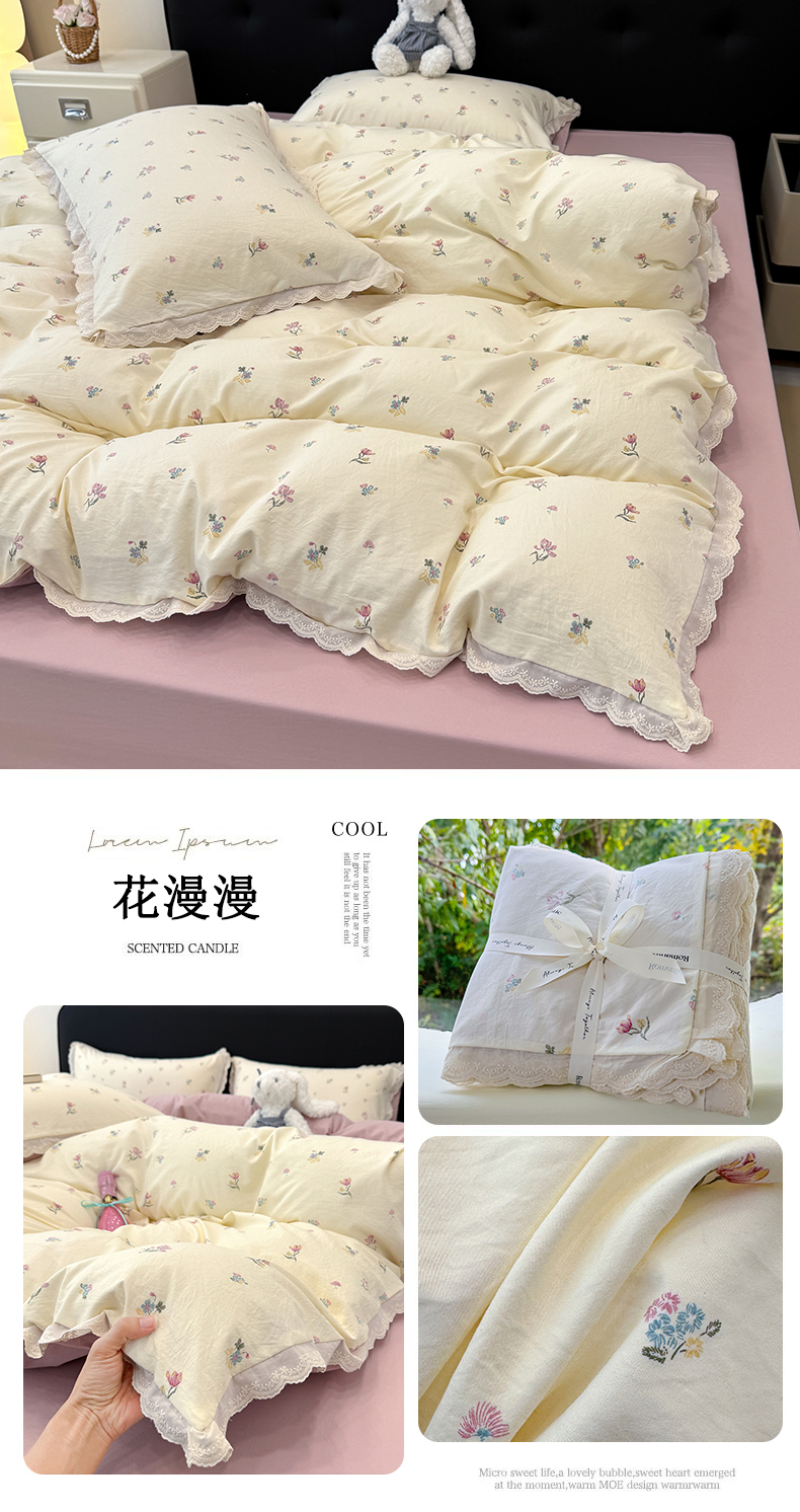 商品名称:铺尚美家纺 2026新款田园韩版花边款小碎花古法水洗仿棉A类云感棉四件套 午后花园粉