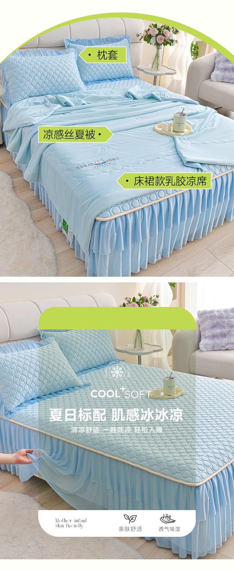 • 91家纺网 家纺一手货源 找家纺 (总)畅畅家纺 2026春夏新款聚乙烯中分子凉感冰感凉豆豆凉席席子床裙三件套幸运草,幸运草-粉,幸运草-灰,幸运草-蓝,幸运草-绿