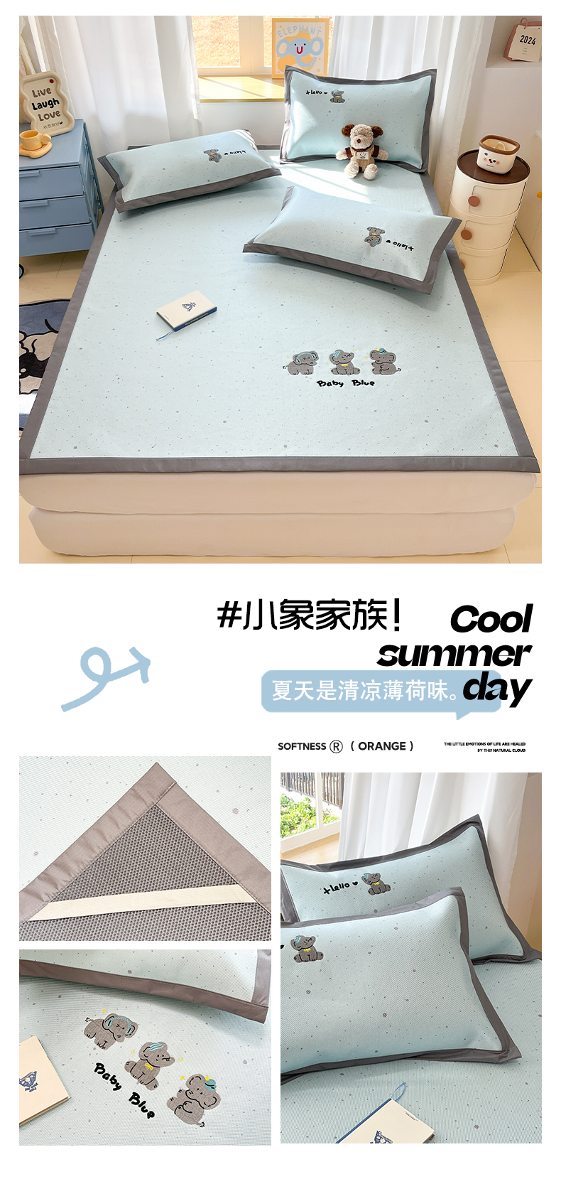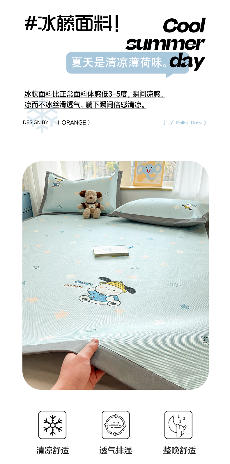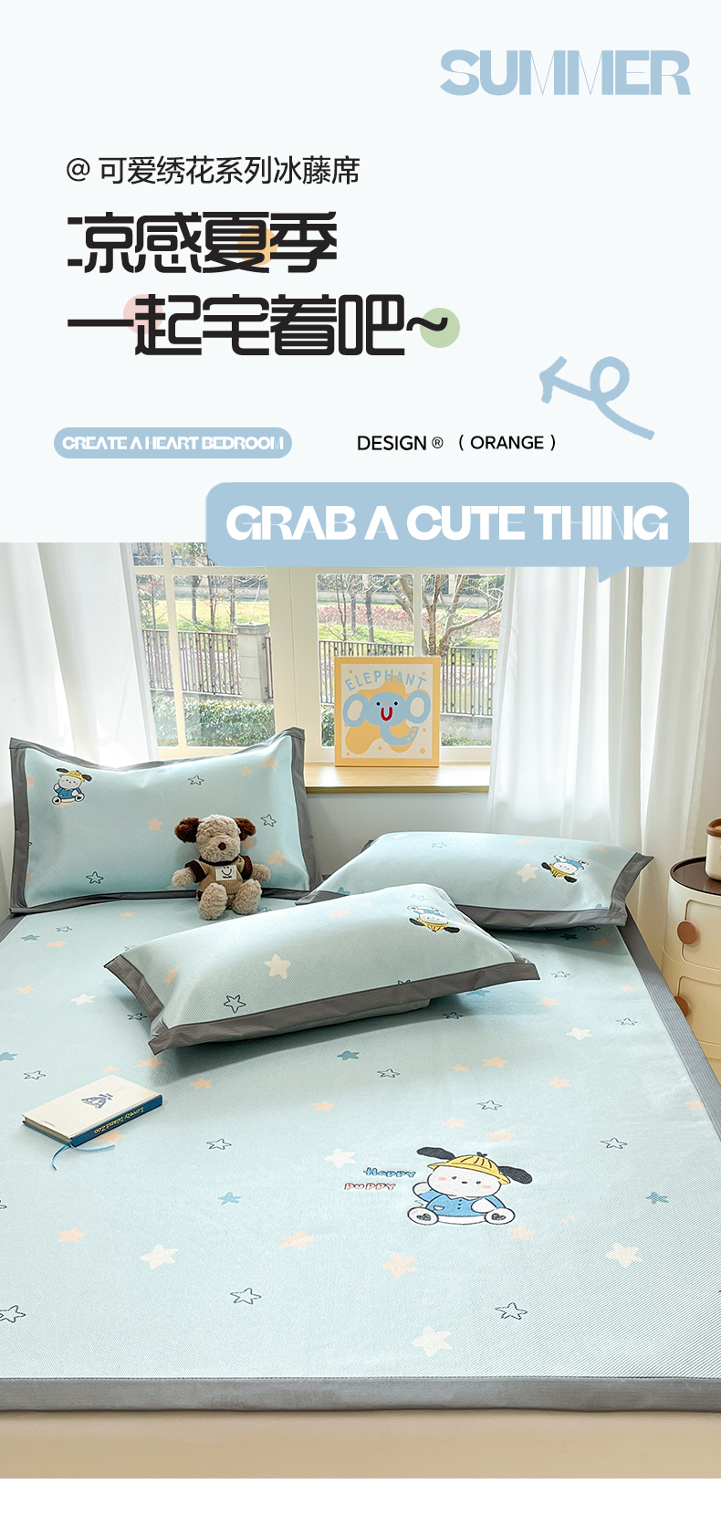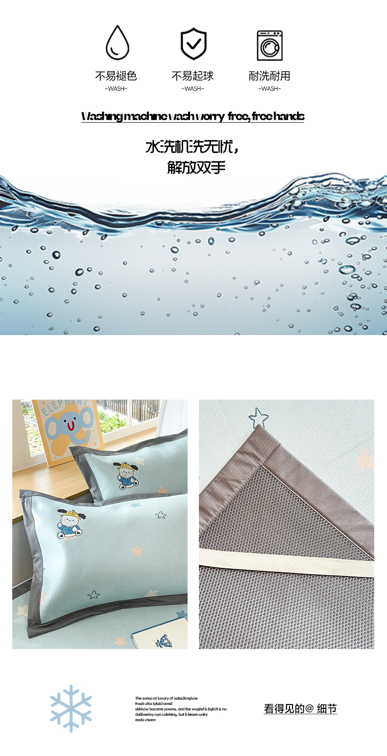 (总)雅居纺家纺 2026新款A类加厚三明治底绣花冰藤席学生宿舍床床单款凉席席子,冰淇淋萌狗,动感小狗,七彩虹,万事不南,小象家族,星星腊肠狗,幸运巴拉
