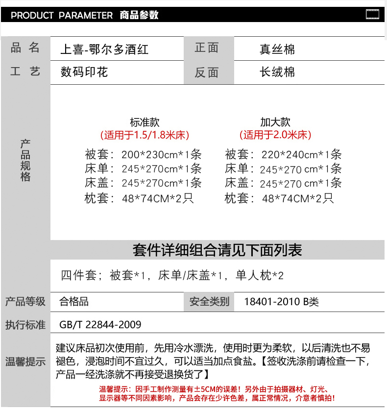 [{"sp_id":11,"sp_name":"\u989c\u8272","sp_format":2,"sp_list":[{"sp_value_id":1663,"sp_value_name":"\u4e0a\u559c-\u9102\u5c14\u591a\u9152\u7ea2","sp_value_image":{"id":999,"path":"https:\/\/img3.91jf.com\/ghelp\/2026\/20260302\/20260302130505_792740.jpg"},"sp_value_video":{"id":0,"img":"","path":"","time":0,"download_num":0,"play_num":0},"price":"999.00","storage":3000,"weight":"3.000","is_check_weight":0,"plus_price":"","sp_sort":0}]},{"sp_id":10,"sp_name":"\u5c3a\u5bf8","sp_format":1,"sp_list":[{"sp_value_id":41,"sp_value_name":"1.5m\u5e8a\u5355\u6b3e\u56db\u4ef6\u5957","sp_value_image":{"id":0,"path":""},"sp_value_video":{"id":0,"img":"","path":"","time":0,"download_num":0,"play_num":0},"price":"999.00","storage":500,"weight":"3.000","is_check_weight":0,"plus_price":"","sp_sort":5},{"sp_value_id":42,"sp_value_name":"1.8m\u5e8a\u5355\u6b3e\u56db\u4ef6\u5957","sp_value_image":{"id":0,"path":""},"sp_value_video":{"id":0,"img":"","path":"","time":0,"download_num":0,"play_num":0},"price":"999.00","storage":500,"weight":"3.000","is_check_weight":0,"plus_price":"","sp_sort":6},{"sp_value_id":43,"sp_value_name":"2.0m\u5e8a\u5355\u6b3e\u56db\u4ef6\u5957","sp_value_image":{"id":0,"path":""},"sp_value_video":{"id":0,"img":"","path":"","time":0,"download_num":0,"play_num":0},"price":"999.00","storage":500,"weight":"3.000","is_check_weight":0,"plus_price":"","sp_sort":7},{"sp_value_id":44,"sp_value_name":"1.5m\u5e8a\u76d6\u6b3e\u56db\u4ef6\u5957","sp_value_image":{"id":0,"path":""},"sp_value_video":{"id":0,"img":"","path":"","time":0,"download_num":0,"play_num":0},"price":"999.00","storage":500,"weight":"3.000","is_check_weight":0,"plus_price":"","sp_sort":8},{"sp_value_id":45,"sp_value_name":"1.8m\u5e8a\u76d6\u6b3e\u56db\u4ef6\u5957","sp_value_image":{"id":0,"path":""},"sp_value_video":{"id":0,"img":"","path":"","time":0,"download_num":0,"play_num":0},"price":"999.00","storage":500,"weight":"3.000","is_check_weight":0,"plus_price":"","sp_sort":9},{"sp_value_id":736,"sp_value_name":"2.0m\u5e8a\u76d6\u6b3e\u56db\u4ef6\u5957","sp_value_image":{"id":0,"path":""},"sp_value_video":{"id":0,"img":"","path":"","time":0,"download_num":0,"play_num":0},"price":"999.00","storage":500,"weight":"3.000","is_check_weight":0,"plus_price":"","sp_sort":10}]}]