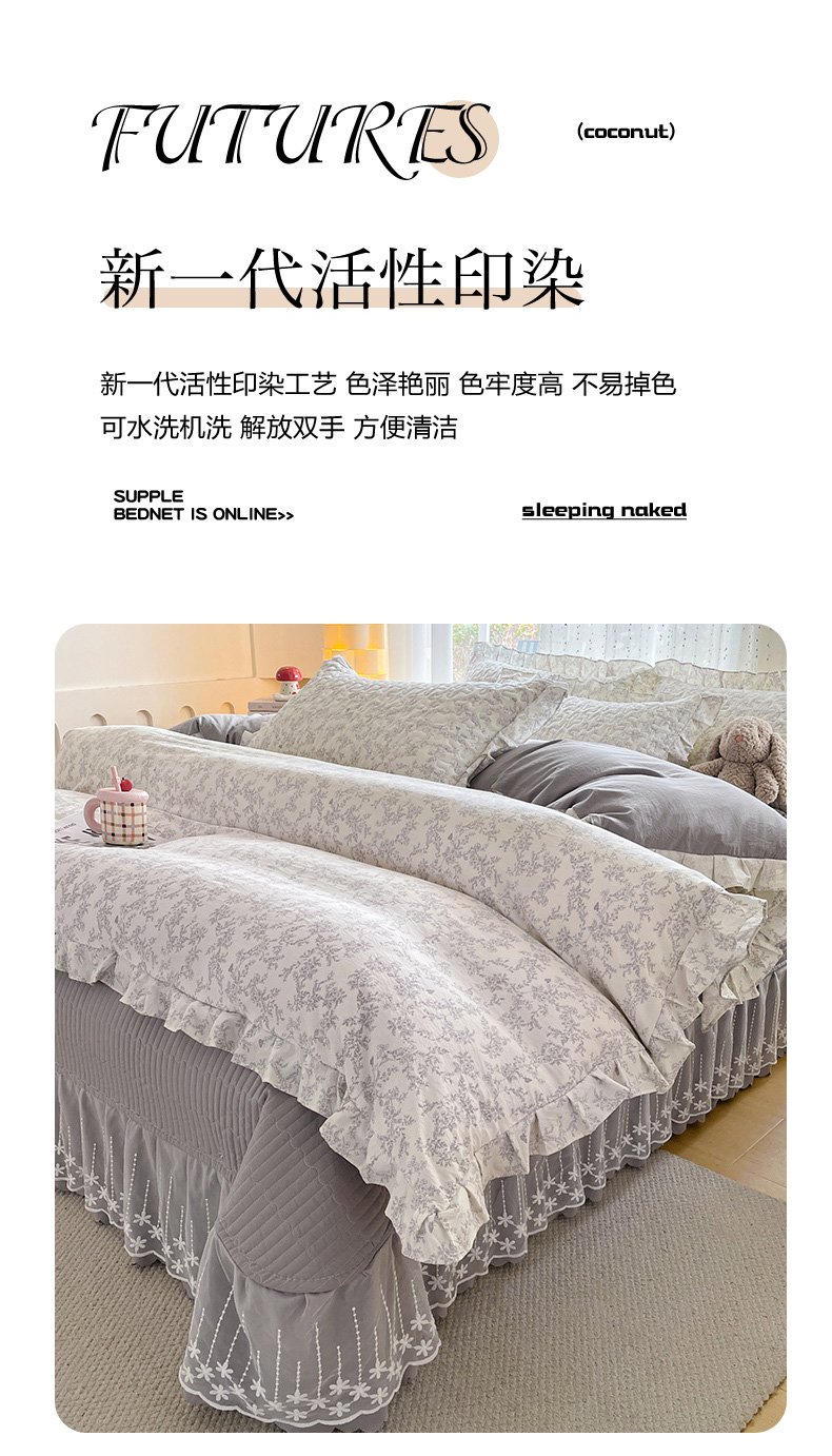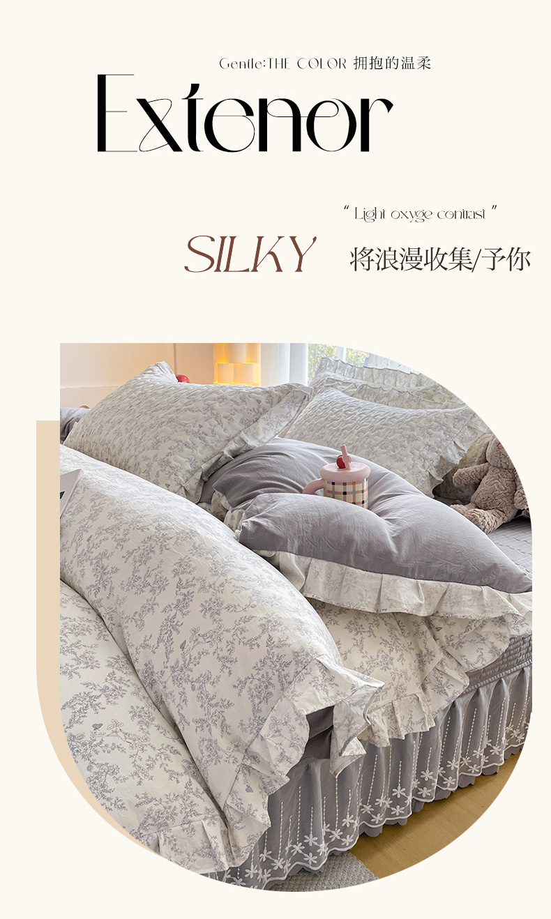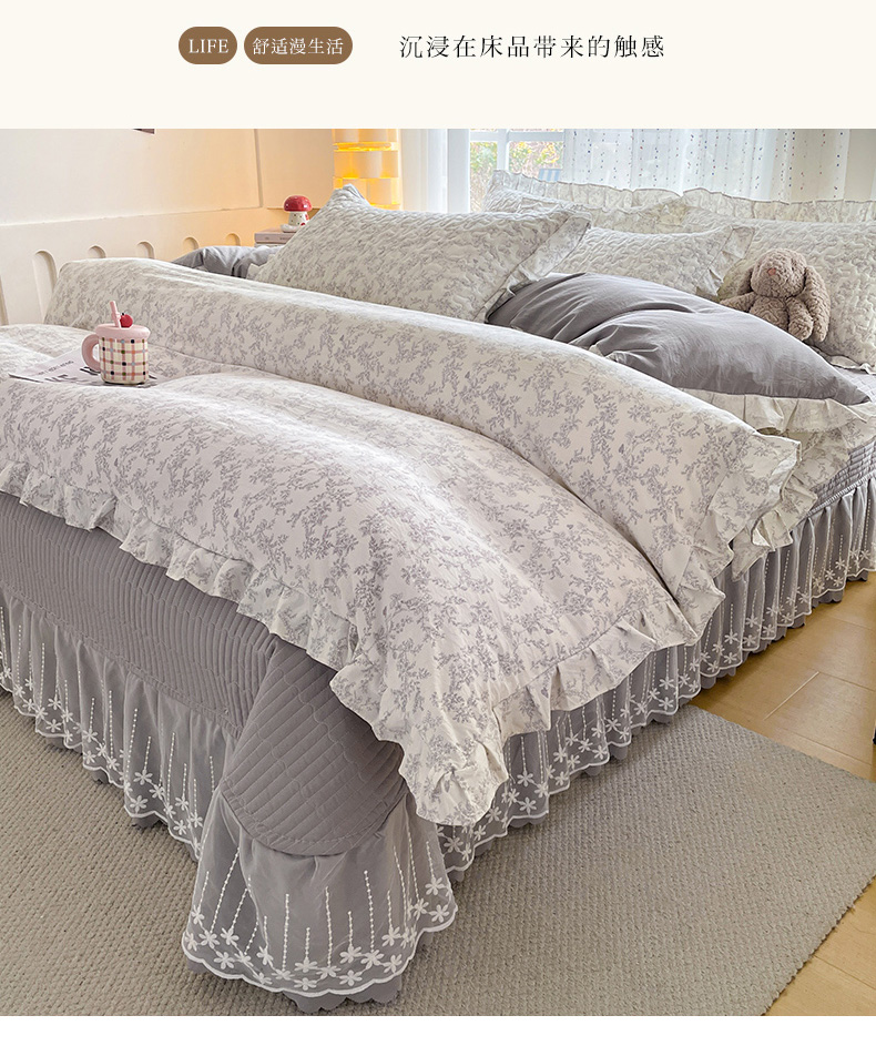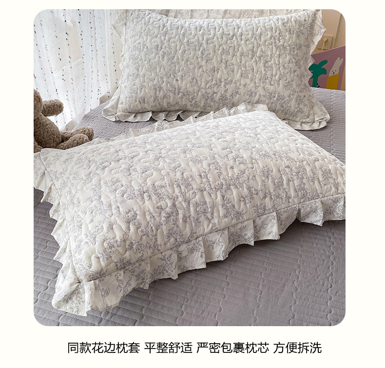 当前位置: 91家纺网 > 商品网购 > 床品套件 > 四件套 > 其它四件套 > 艺慕家纺 2026新款直播热款古法仿棉AB版水洗棉印花双层蕾丝花边床盖四件套 AB版-素影