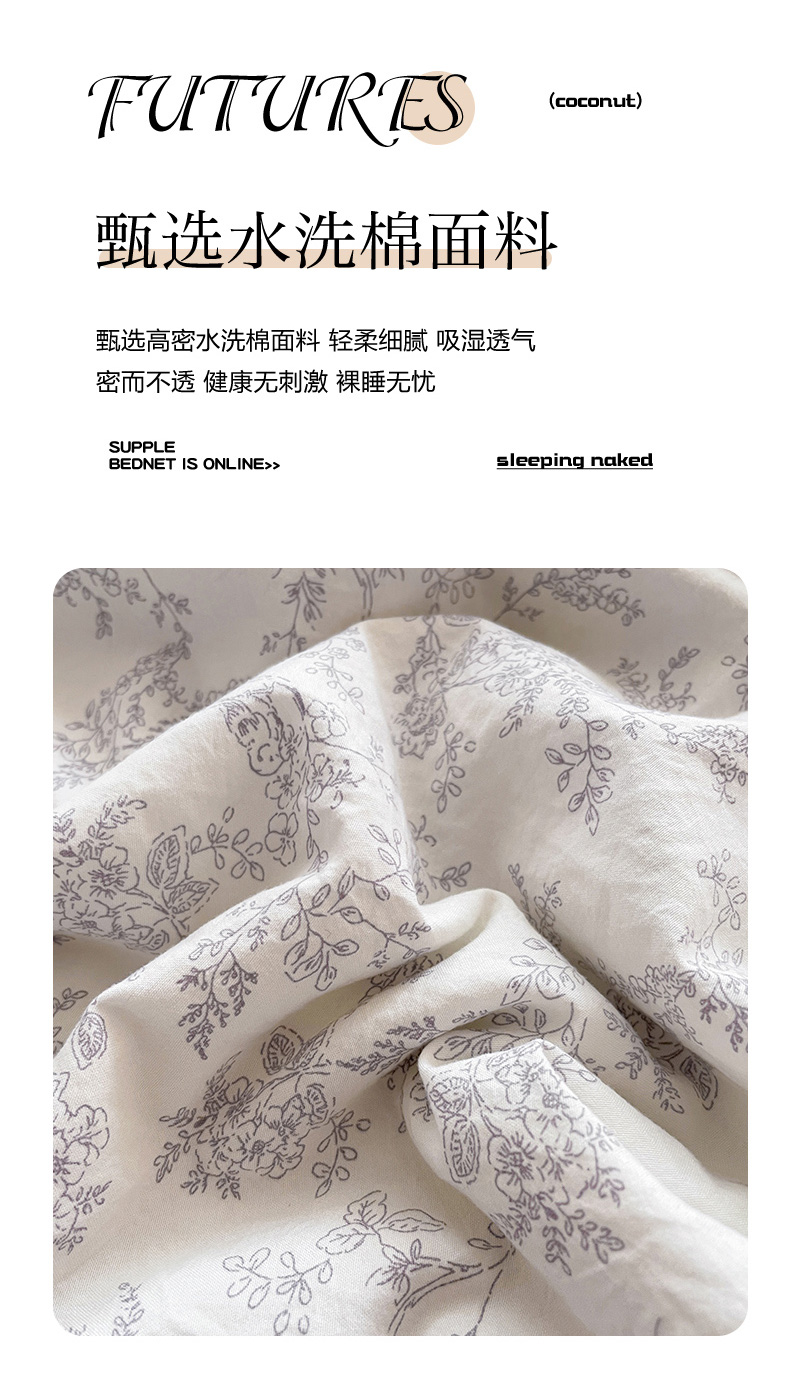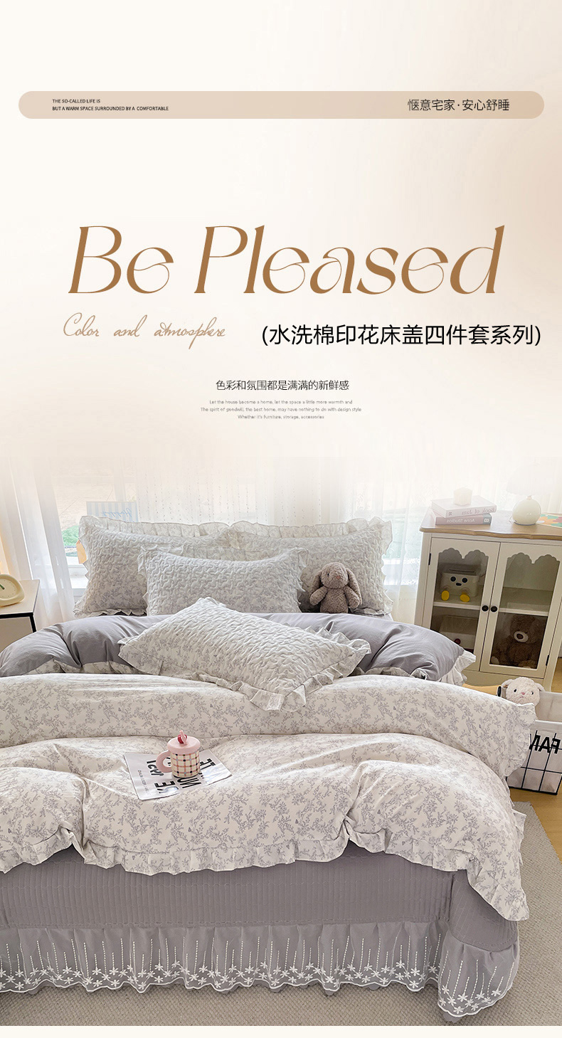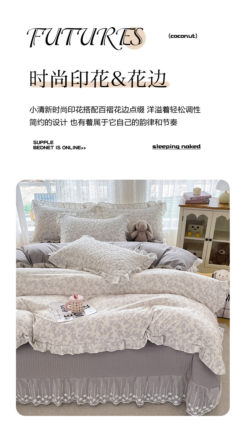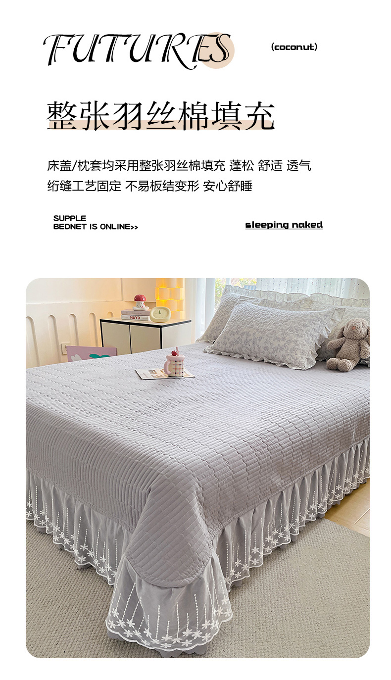 当前位置: 91家纺网 > 商品网购 > 床品套件 > 四件套 > 其它四件套 > 艺慕家纺 2026新款直播热款古法仿棉AB版水洗棉印花双层蕾丝花边床盖四件套 AB版-素影