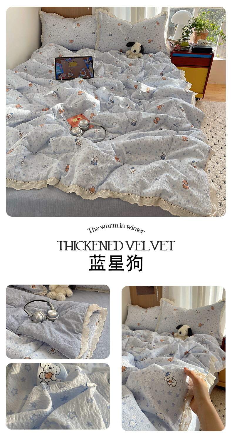 • 91家纺网 家纺一手货源 找家纺 宝士康家纺 2026新款10A抗菌提花色织花边单夏被/夏被四件套/空调被 奶芙小狗