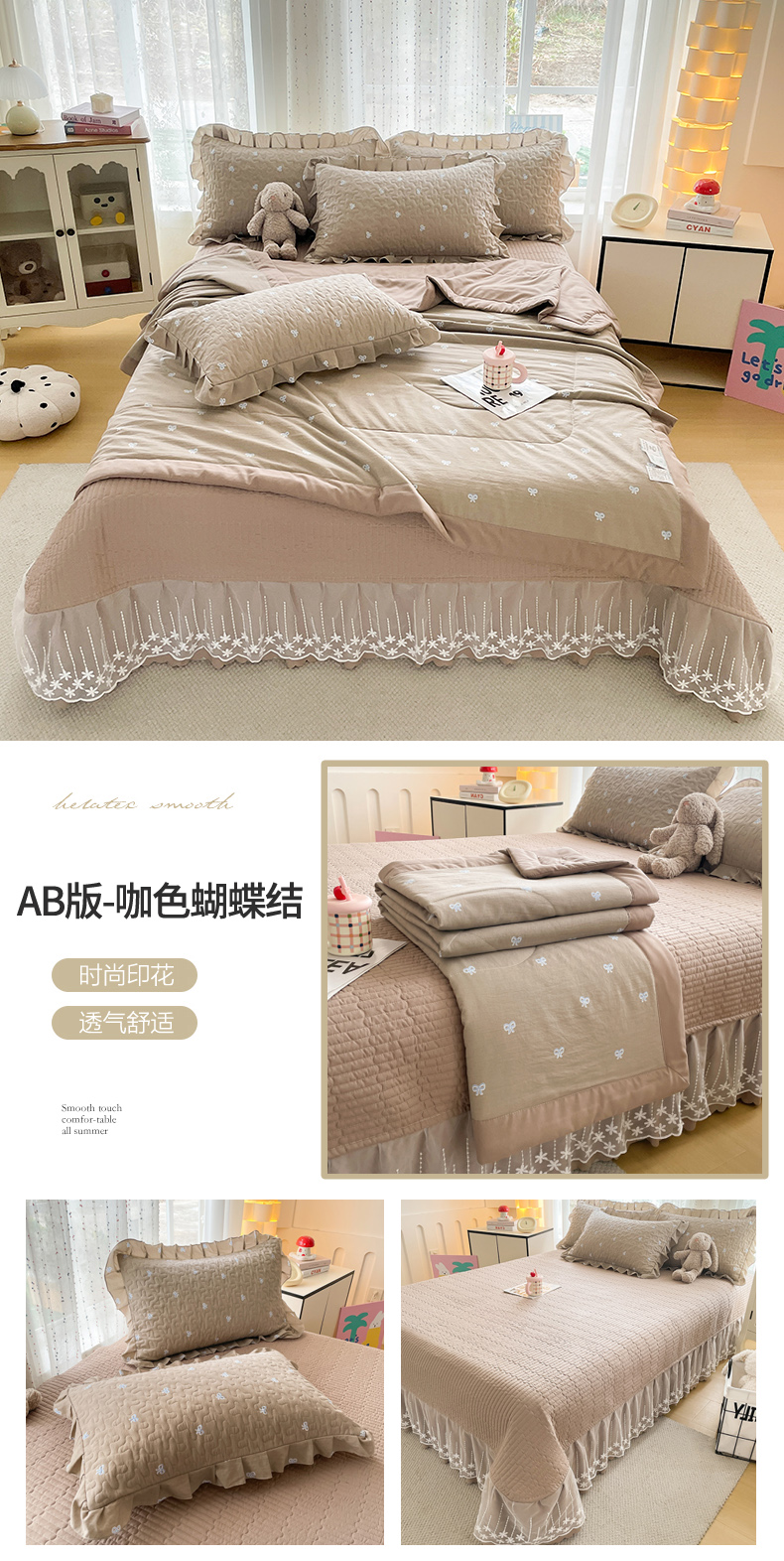 当前位置: 91家纺网 > 商品网购 > 床品套件 > 四件套 > 其它四件套 > 艺慕家纺 2026新款直播热款古法仿棉AB版水洗棉印花双层蕾丝花边夏被床盖四件套 AB版-咖色蝴蝶结