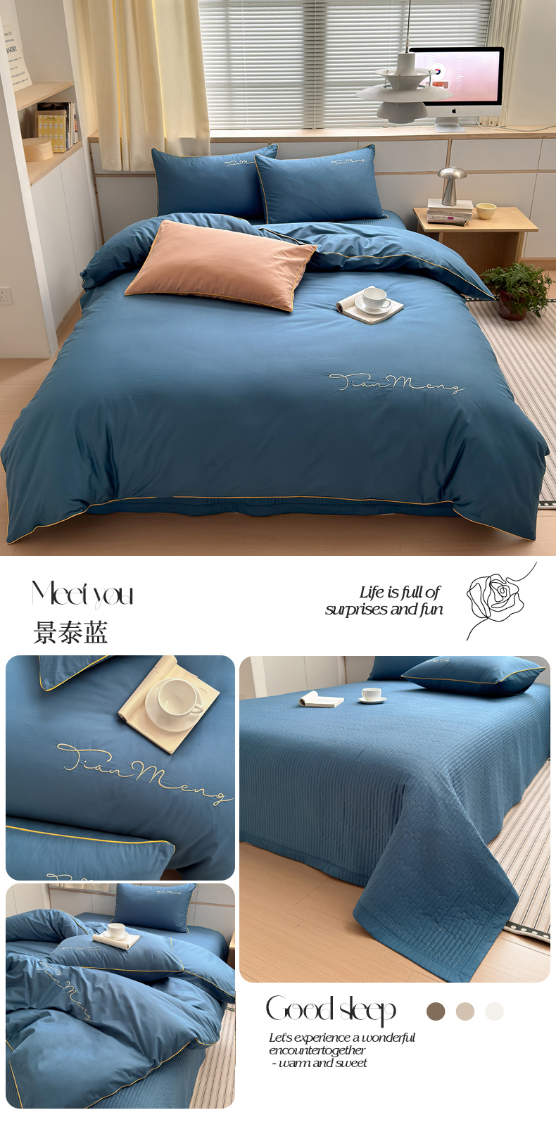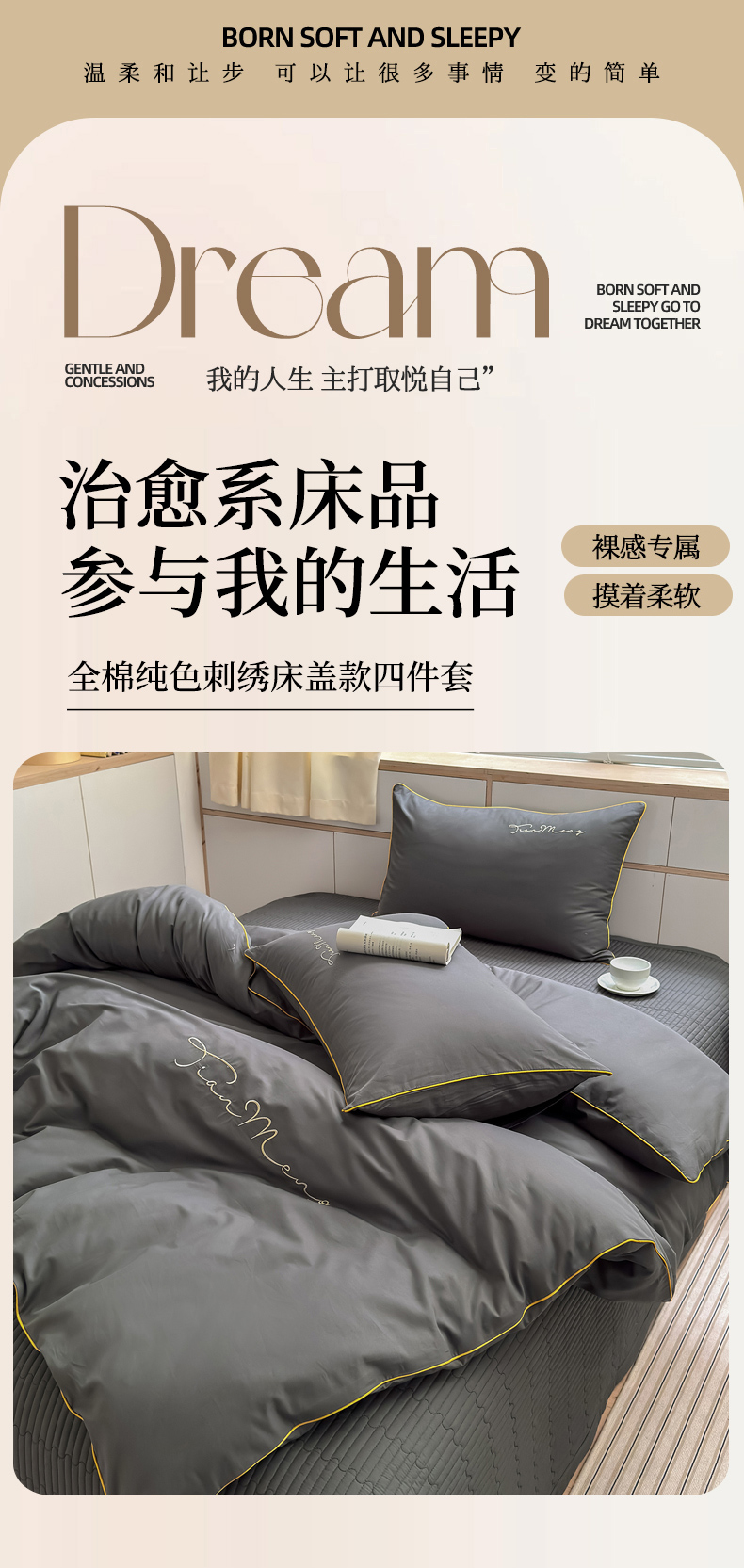 (总)Sweet dreams甜梦 2026新款全棉纯棉刺绣嵌绳床盖四件套,贝壳粉,豆蔻绿,古典灰,景泰蓝,莫兰迪,水蜜粉,组合图仅供展示-不可下单