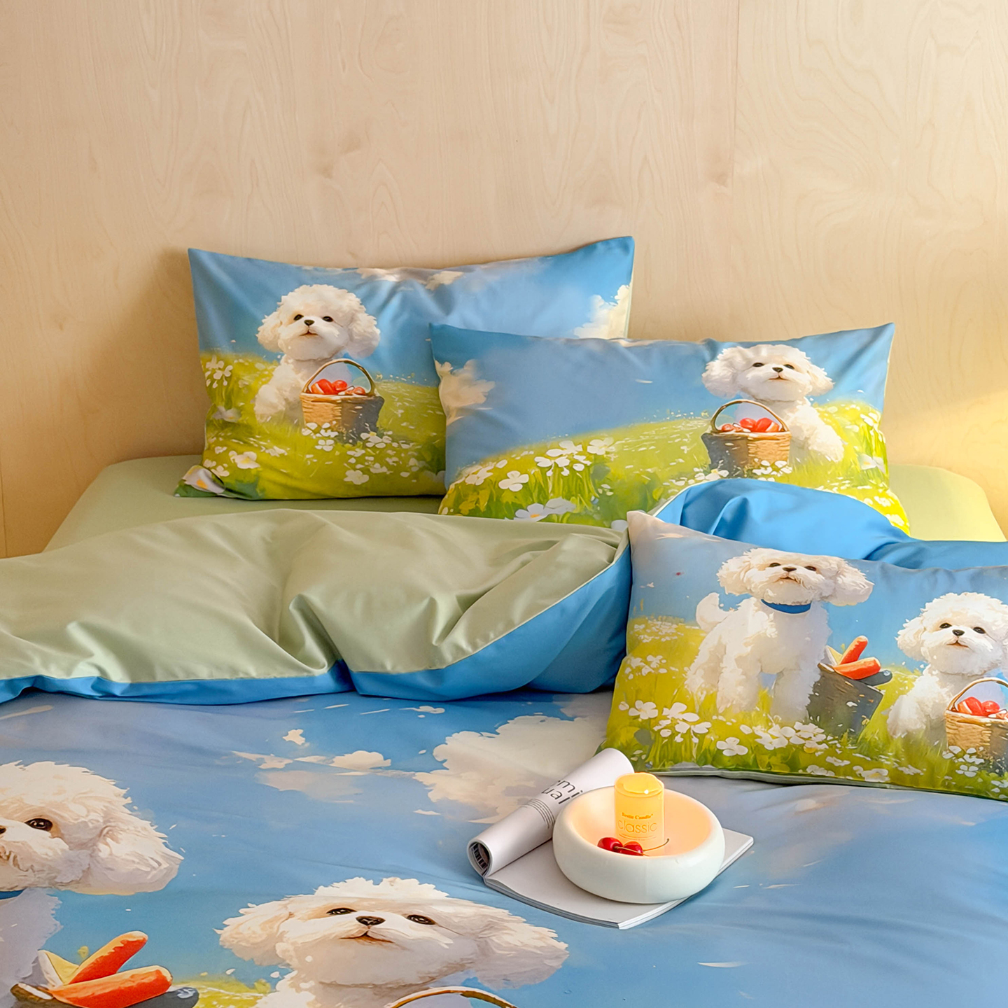 商品名称:西西家居 2026新款100s数码印花款长绒棉四件套-春日治愈款 花园小狗