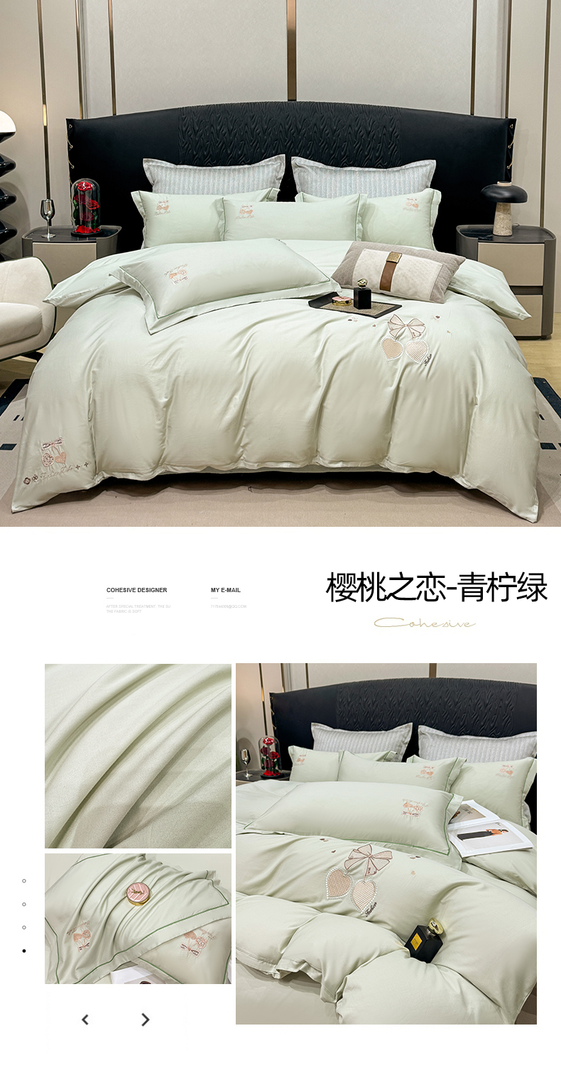 商品名称:昊翔家纺 2026全棉纯棉刺绣花四件套40支长绒棉100% 棉礼盒包装 樱桃之恋-青柠绿