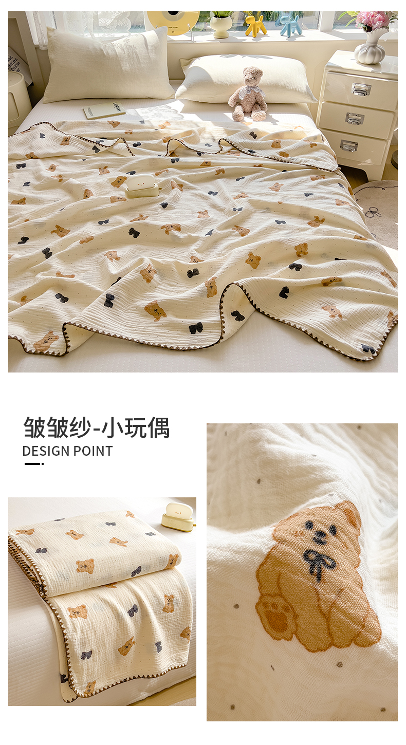 商品名称:布凡家居 2026新款全棉纯棉双层纱布毯夏被毯盖毯双层纱浴巾毯 皱皱纱-小玩偶