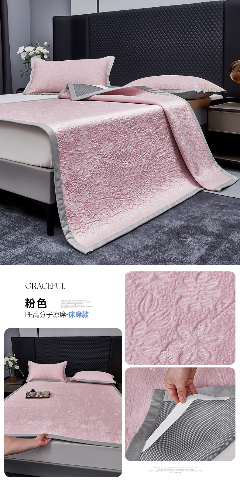 商品名称:库里梦家纺 2026新款轻奢高克重复合PE高分子凉席床笠三件套-简卉 简卉-粉色床笠款