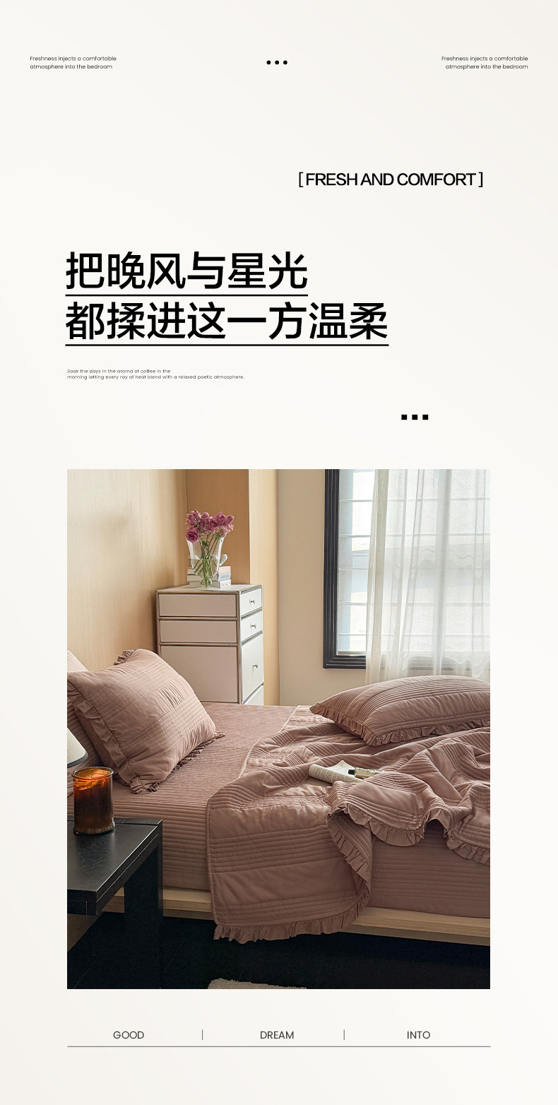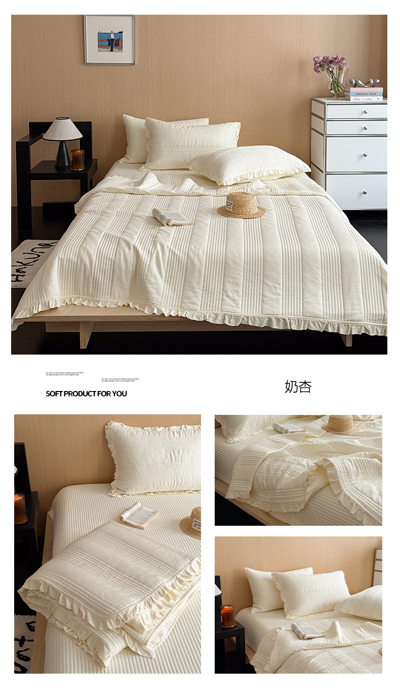 (总)漫调家纺 2026春夏新品双面棉麻法式荷叶边高温水洗夏被可配夏被四件套床单床盖四件套(夏被四件套咨询微信),粉雾花甸,蓝雾花影,奶杏枝蔓,青枝野果,组合