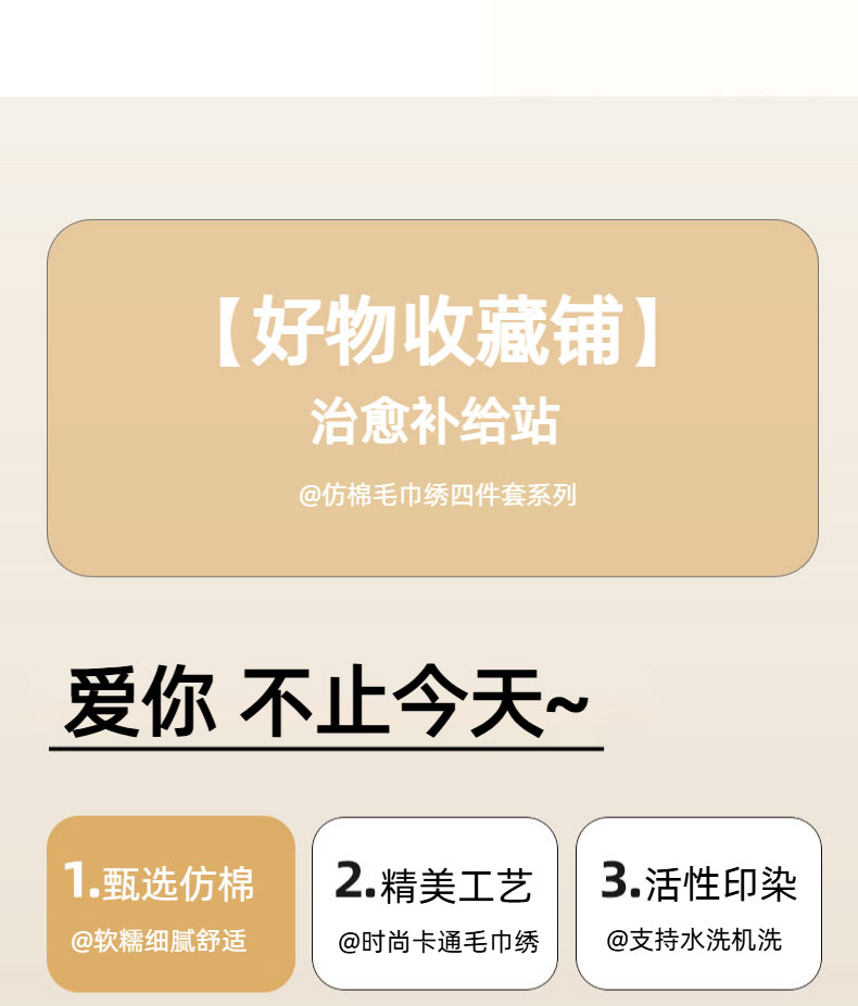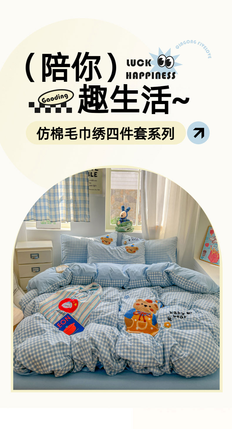 (总)一比一家纺 2026新款仿棉毛巾绣四件套,趴趴小狗,豹纹kitty,粉花兔仔,粉紫熊猫,蓝格小熊,米色熊猫,星星苹果,紫心少女,棕格布布