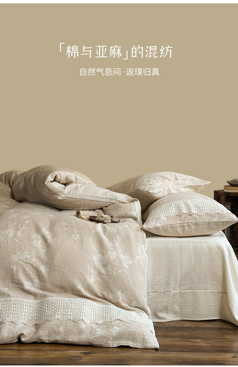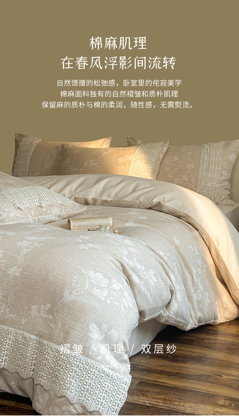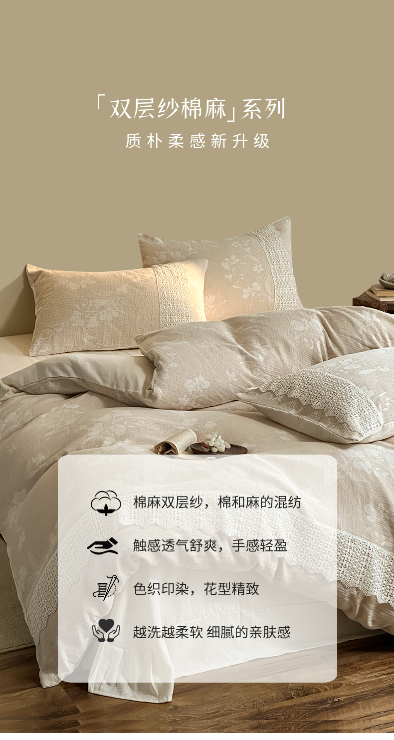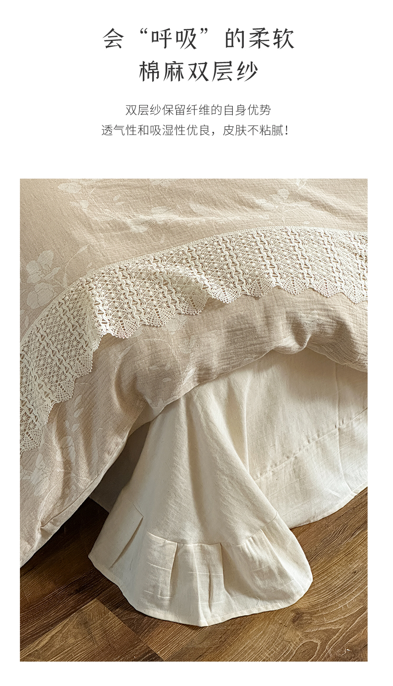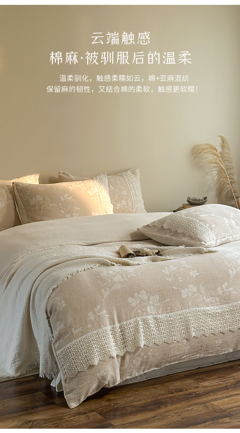 当前位置: 91家纺网 > 商品网购 > 床品套件 > 四件套 > 棉麻四件套 > (总)爱丽丝 2026新款棉麻双层纱四件套-素枝木兮花边款