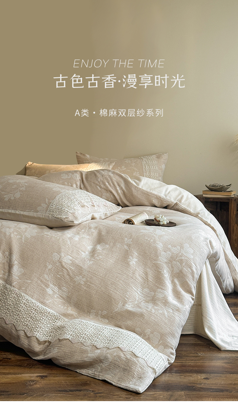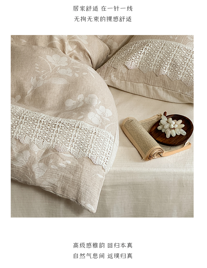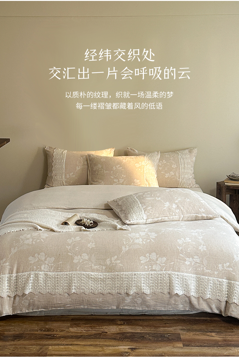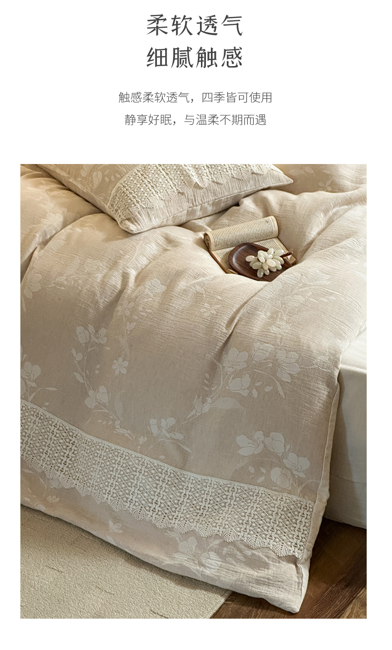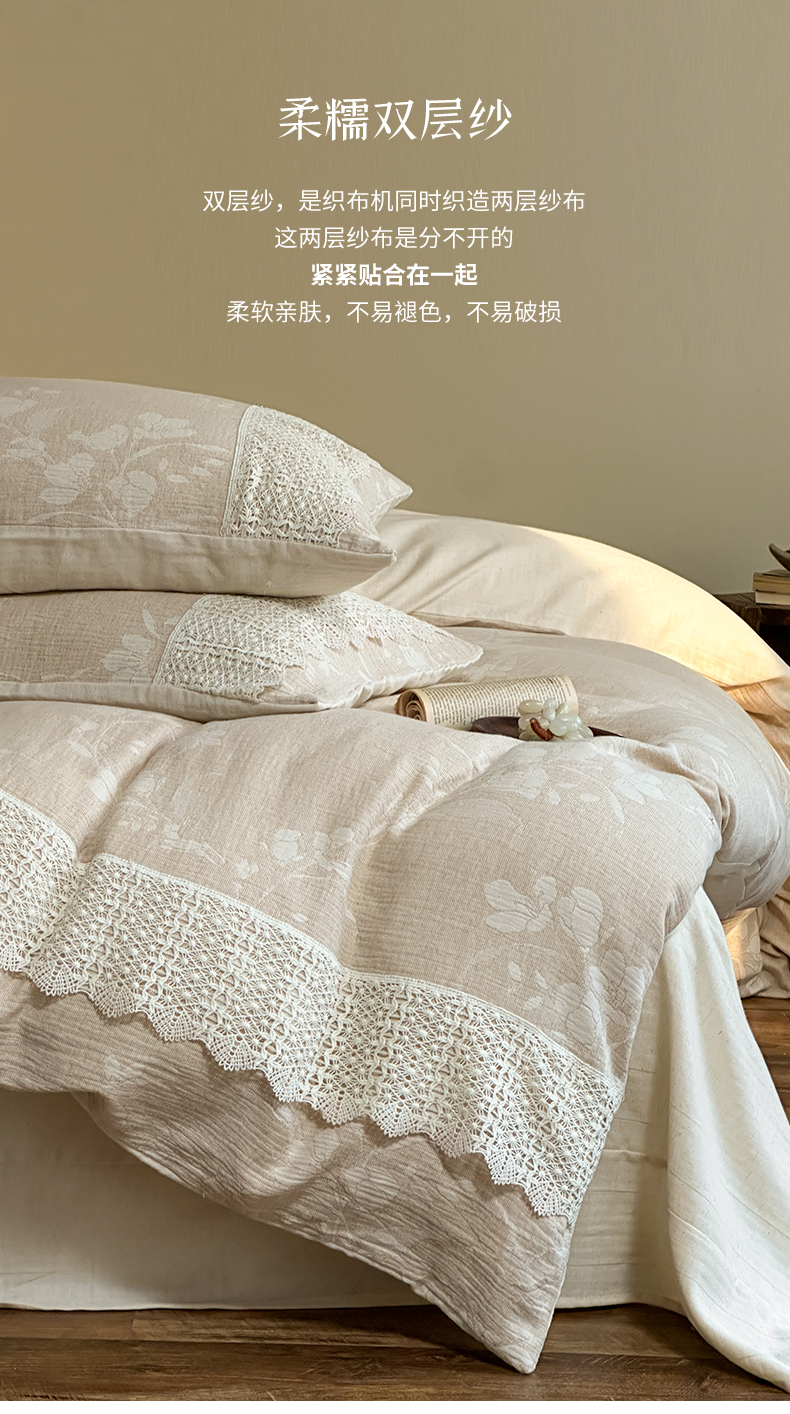 当前位置: 91家纺网 > 商品网购 > 床品套件 > 四件套 > 棉麻四件套 > (总)爱丽丝 2026新款棉麻双层纱四件套-素枝木兮花边款