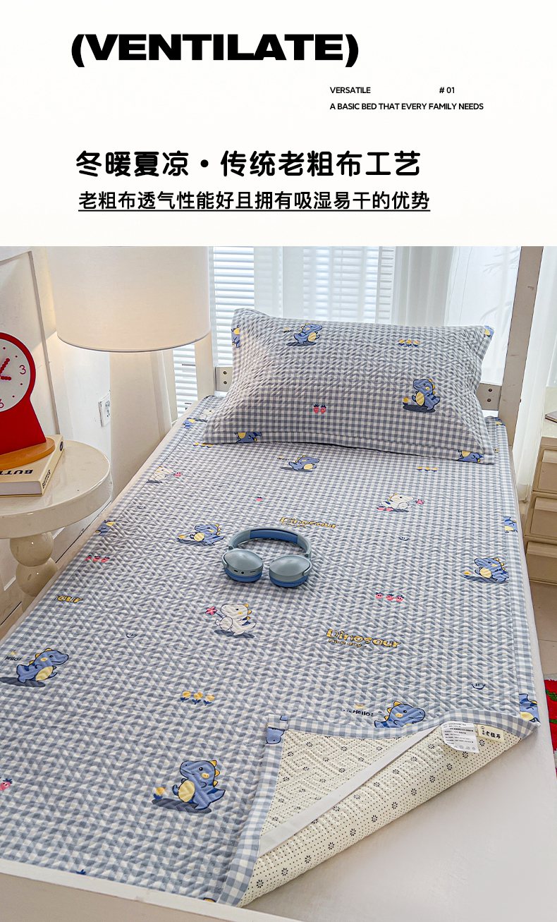 • 91家纺网 家纺一手货源 找家纺 忆生活家纺 2026新款学生床全棉老粗布软凉席夹棉床盖 蓝格龙宝