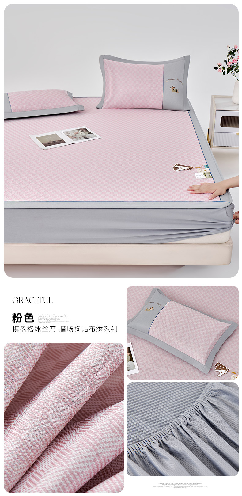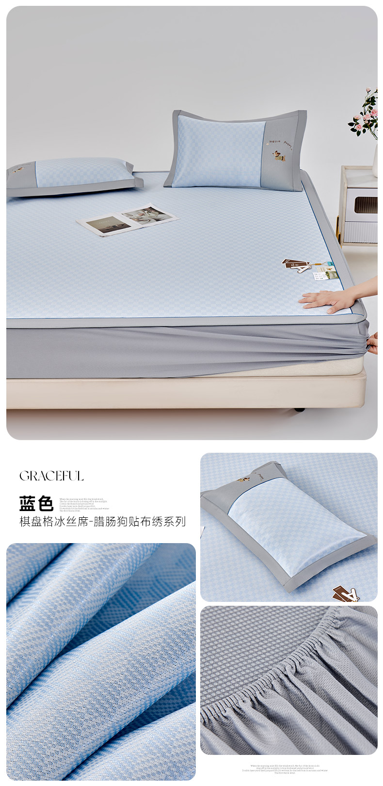 商品名称:(总)小牛席业 2026新款棋盘格冰丝席(腊肠狗贴布绣)凉席三件套-床笠款
