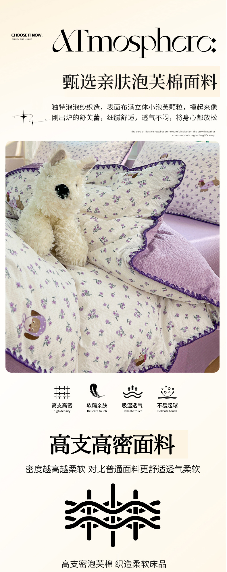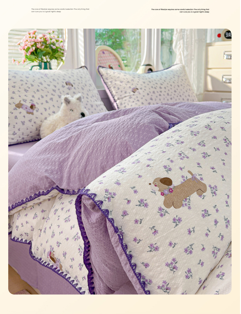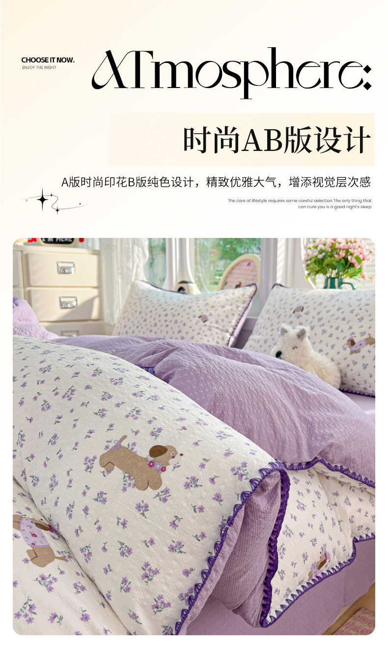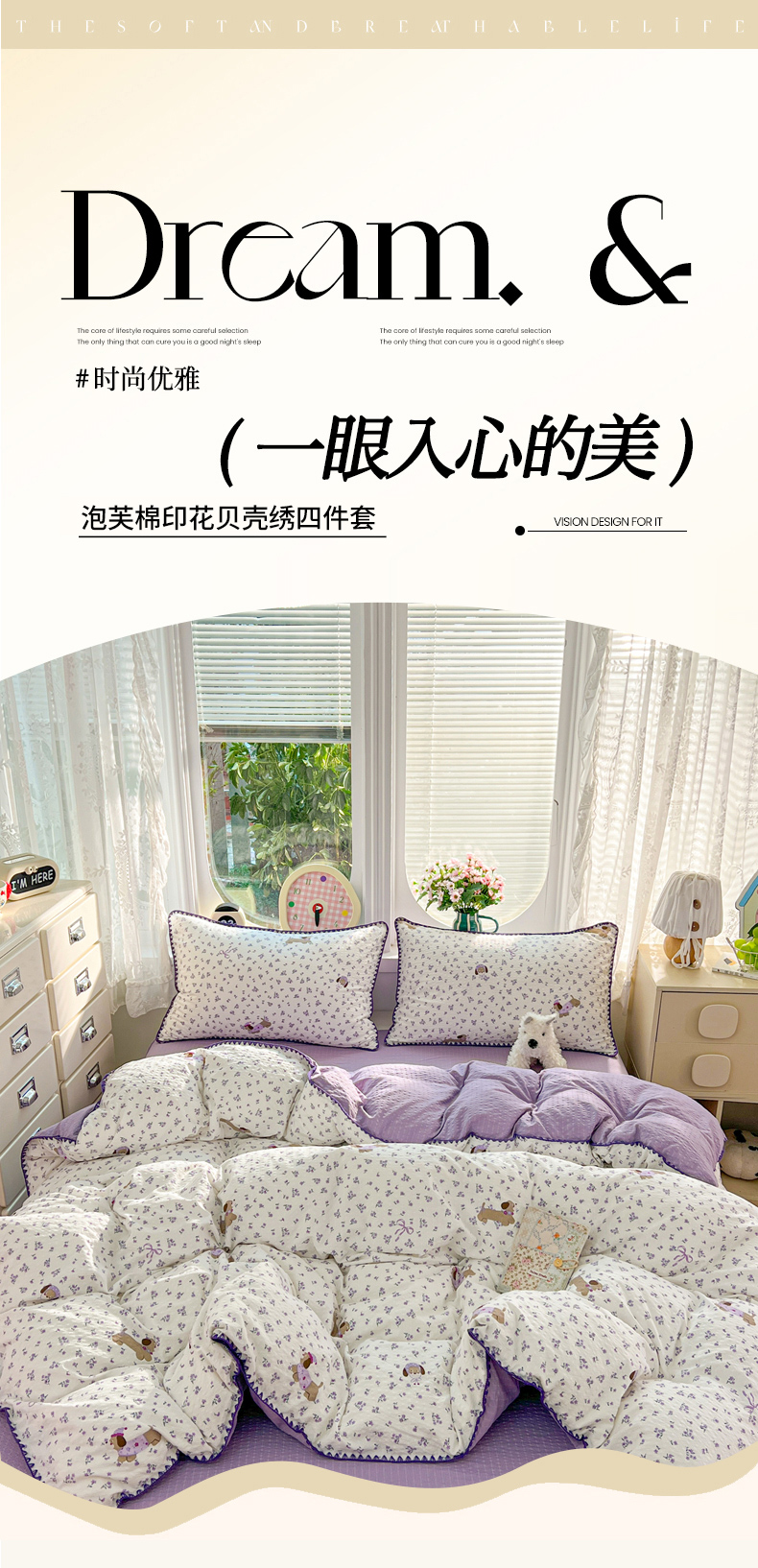 当前位置: 91家纺网 > 商品网购 > 床品套件 > 四件套 > 其它四件套 > 恒尚居 2026新款泡芙纱四件套贝壳绣边床盖套件单被套床单床笠 【紫调小狗】贝壳边