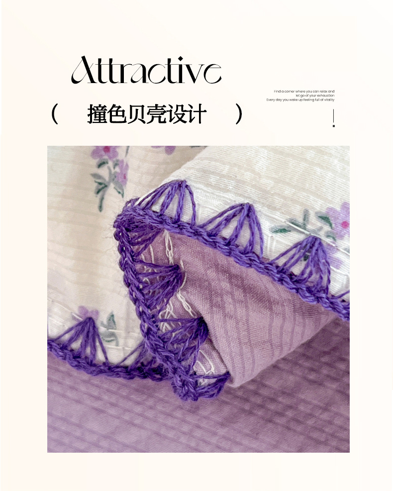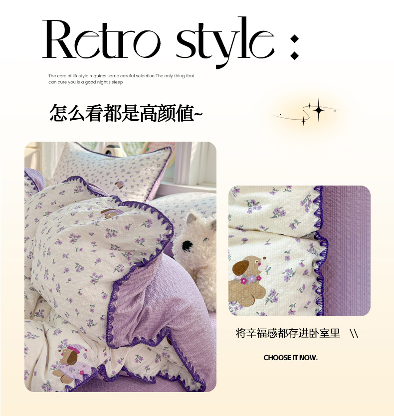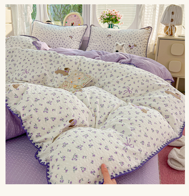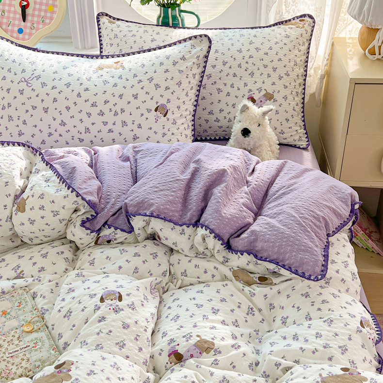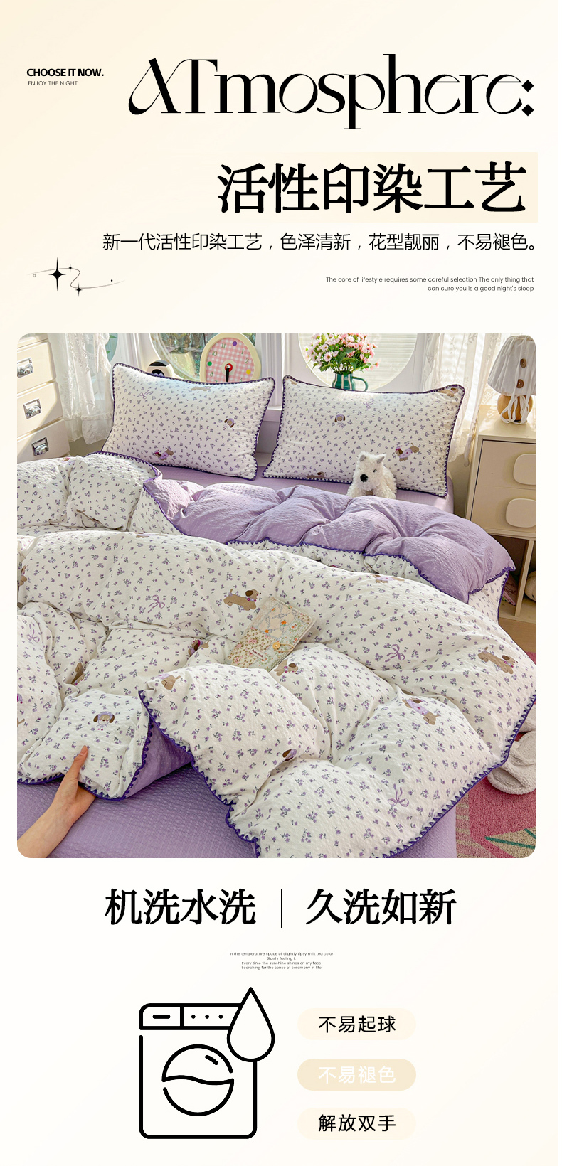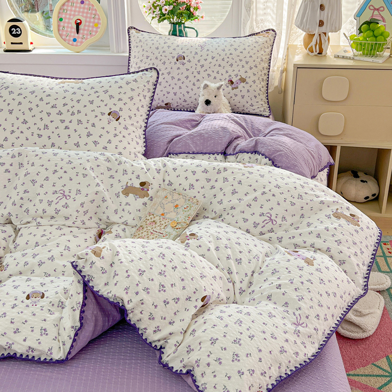 当前位置: 91家纺网 > 商品网购 > 床品套件 > 四件套 > 其它四件套 > 恒尚居 2026新款泡芙纱四件套贝壳绣边床盖套件单被套床单床笠 【紫调小狗】贝壳边
