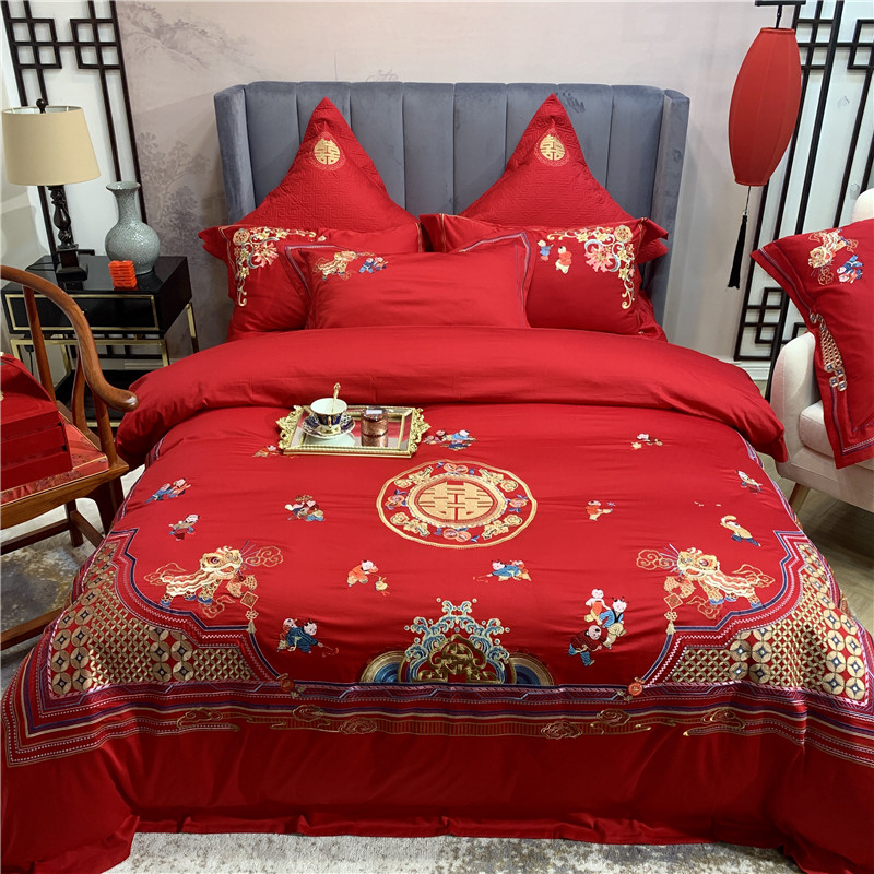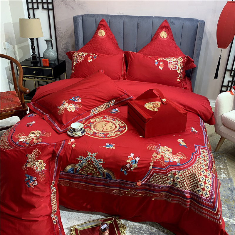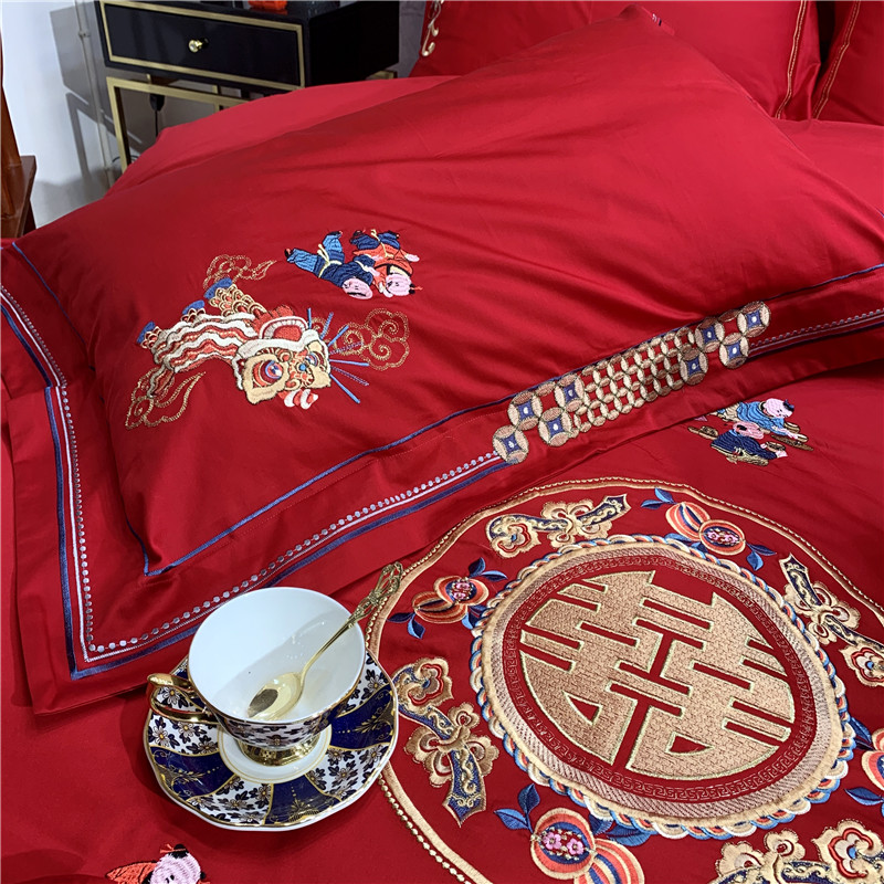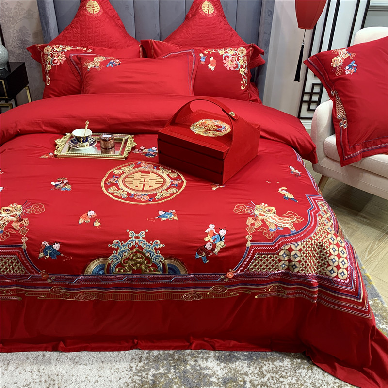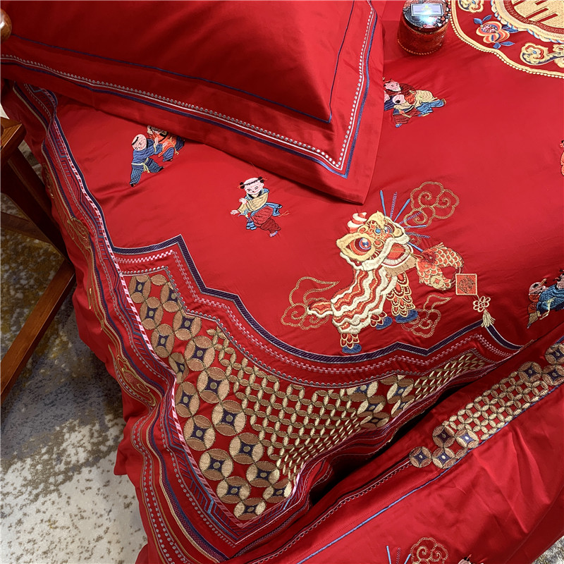橘滋 2021新款高定婚嫁AB版全棉提花四件套 麒麟送子