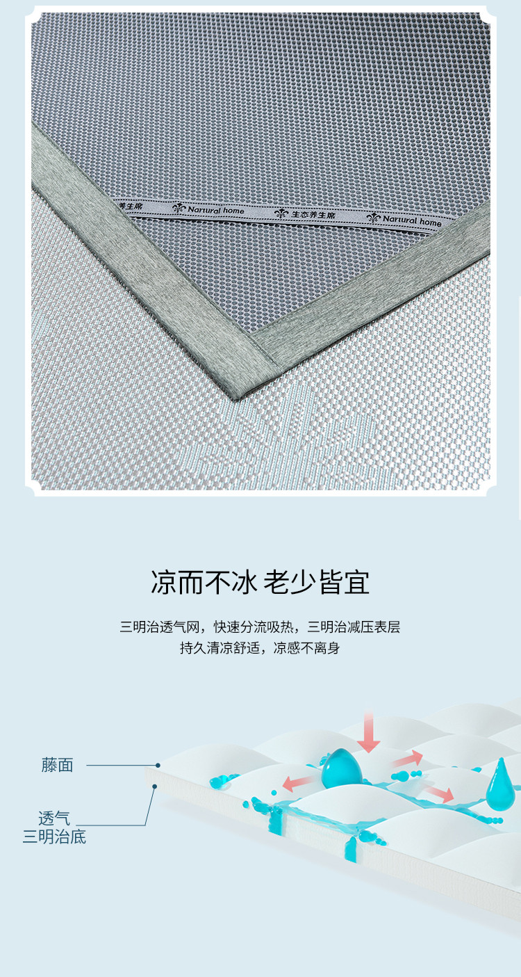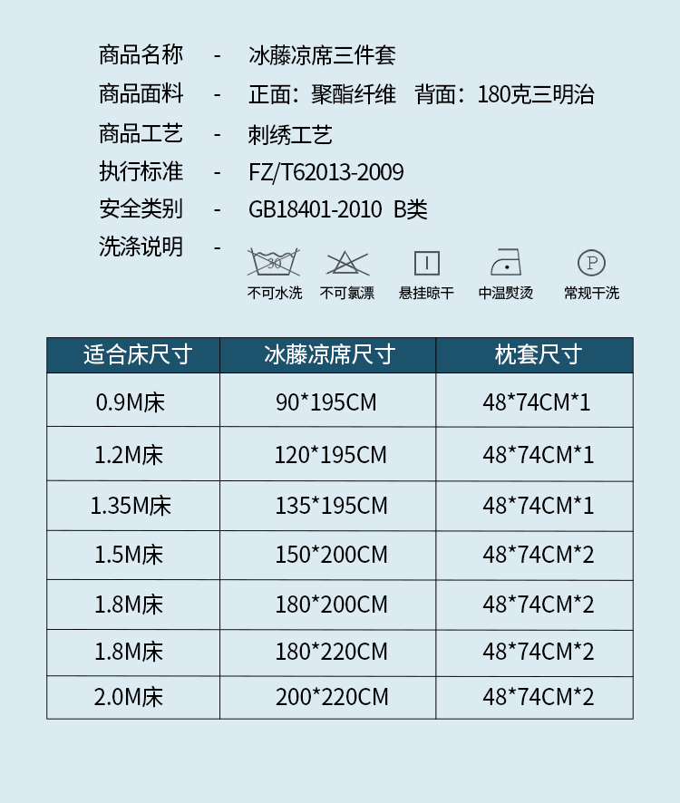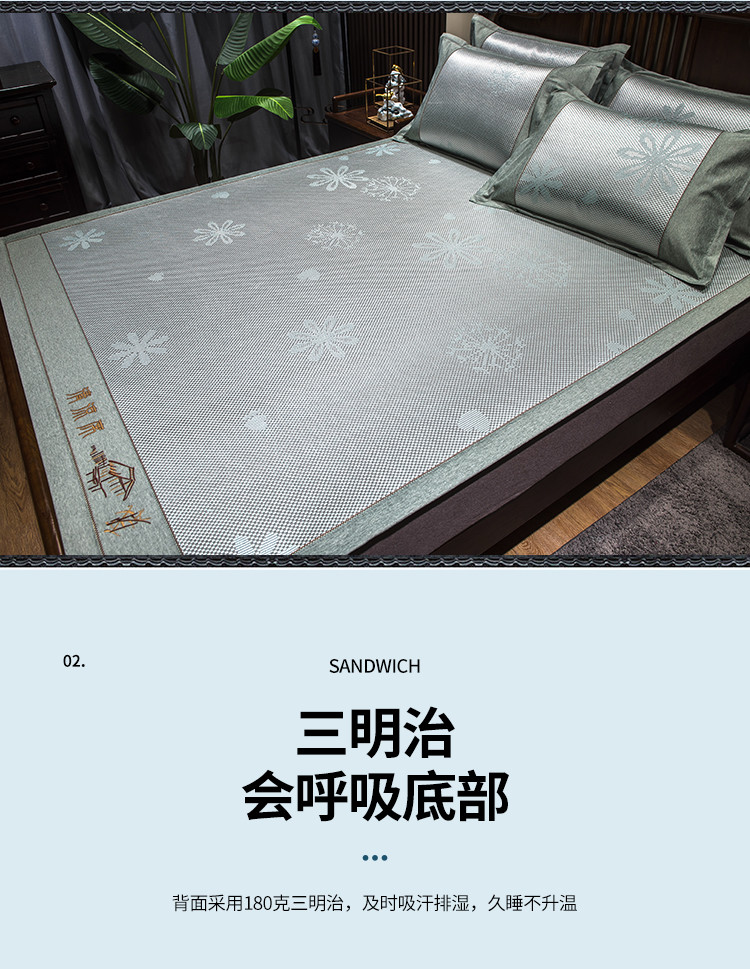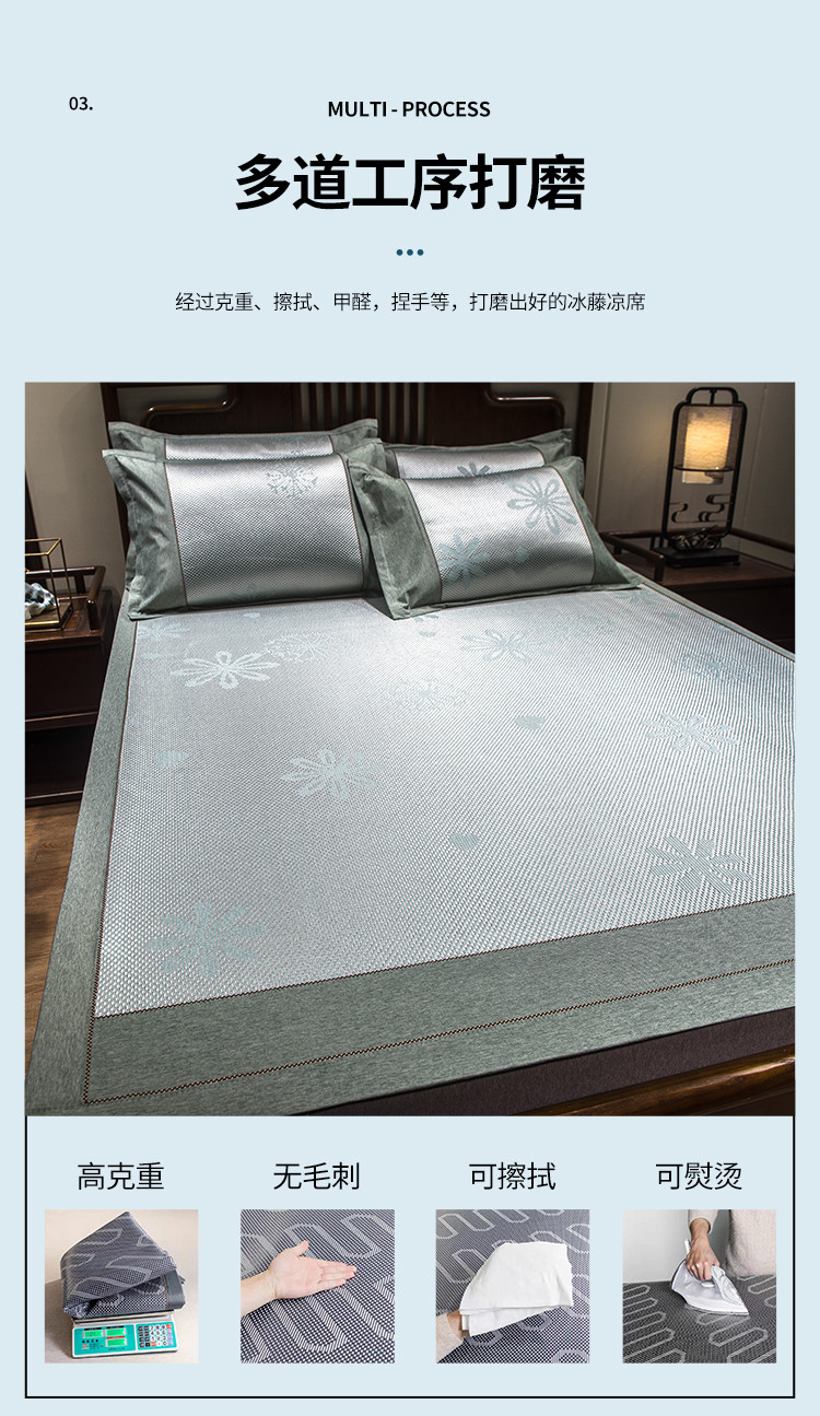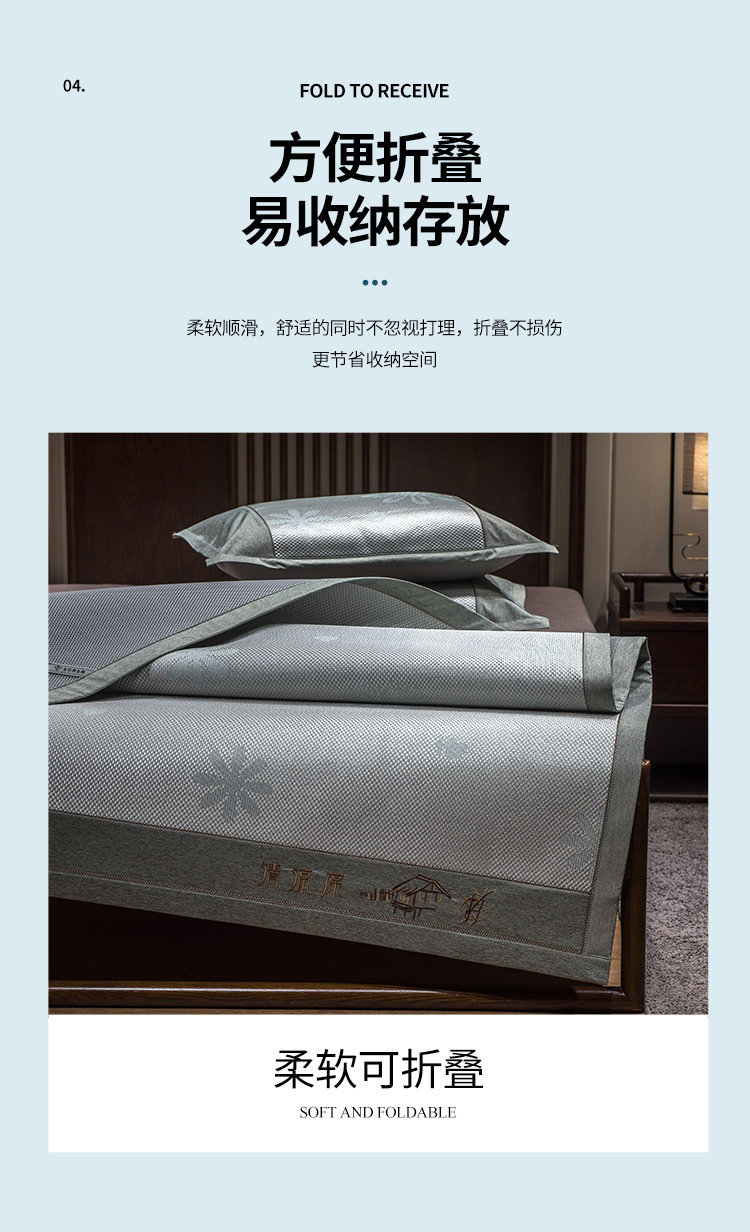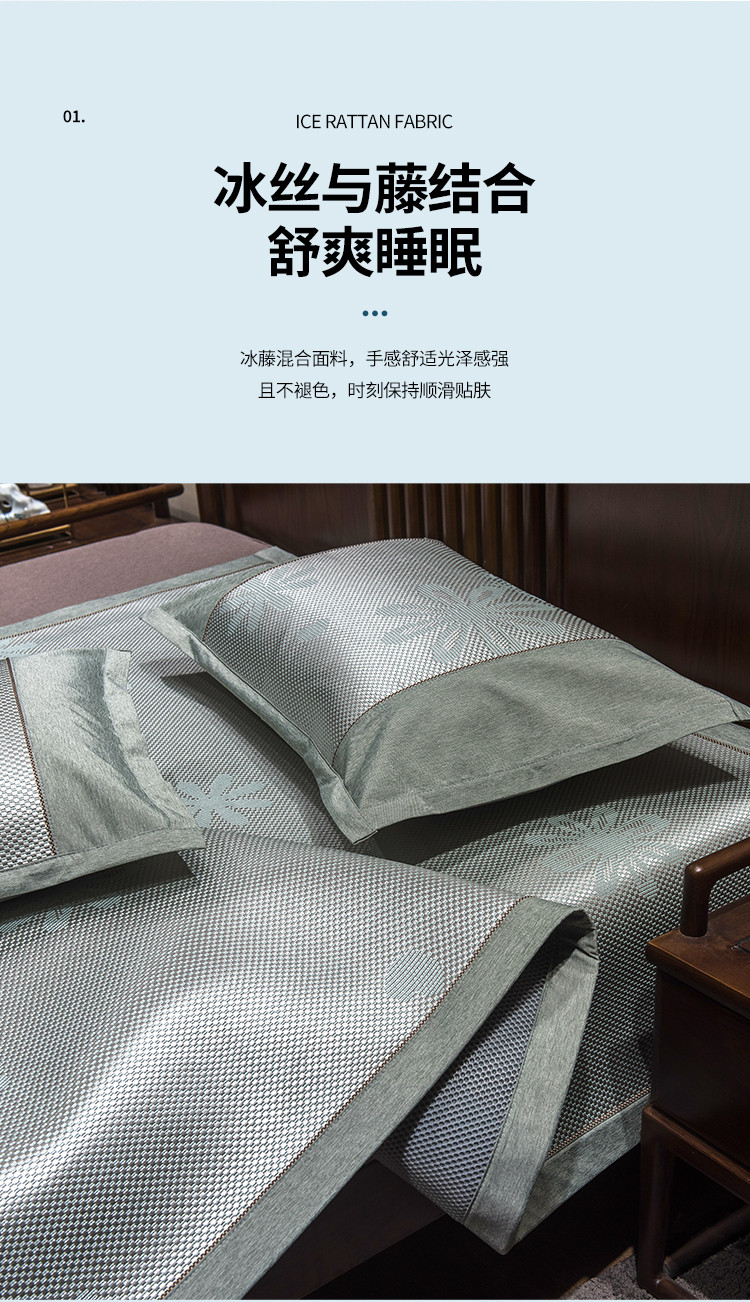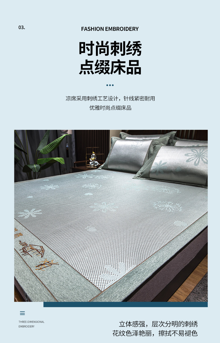 当前位置: 91家纺网 > 商品网购 > 床上用品 > 凉席 > 藤席 > 全季家居 2021新款宽边绣花冰藤席三件套 飘雪-水绿