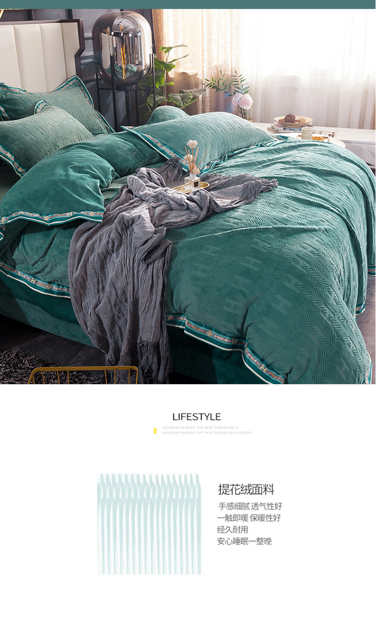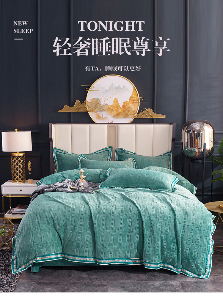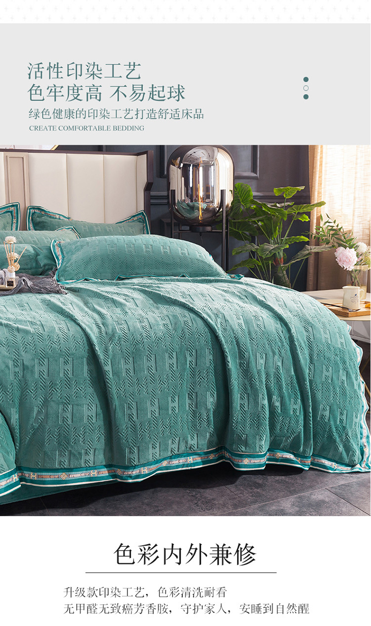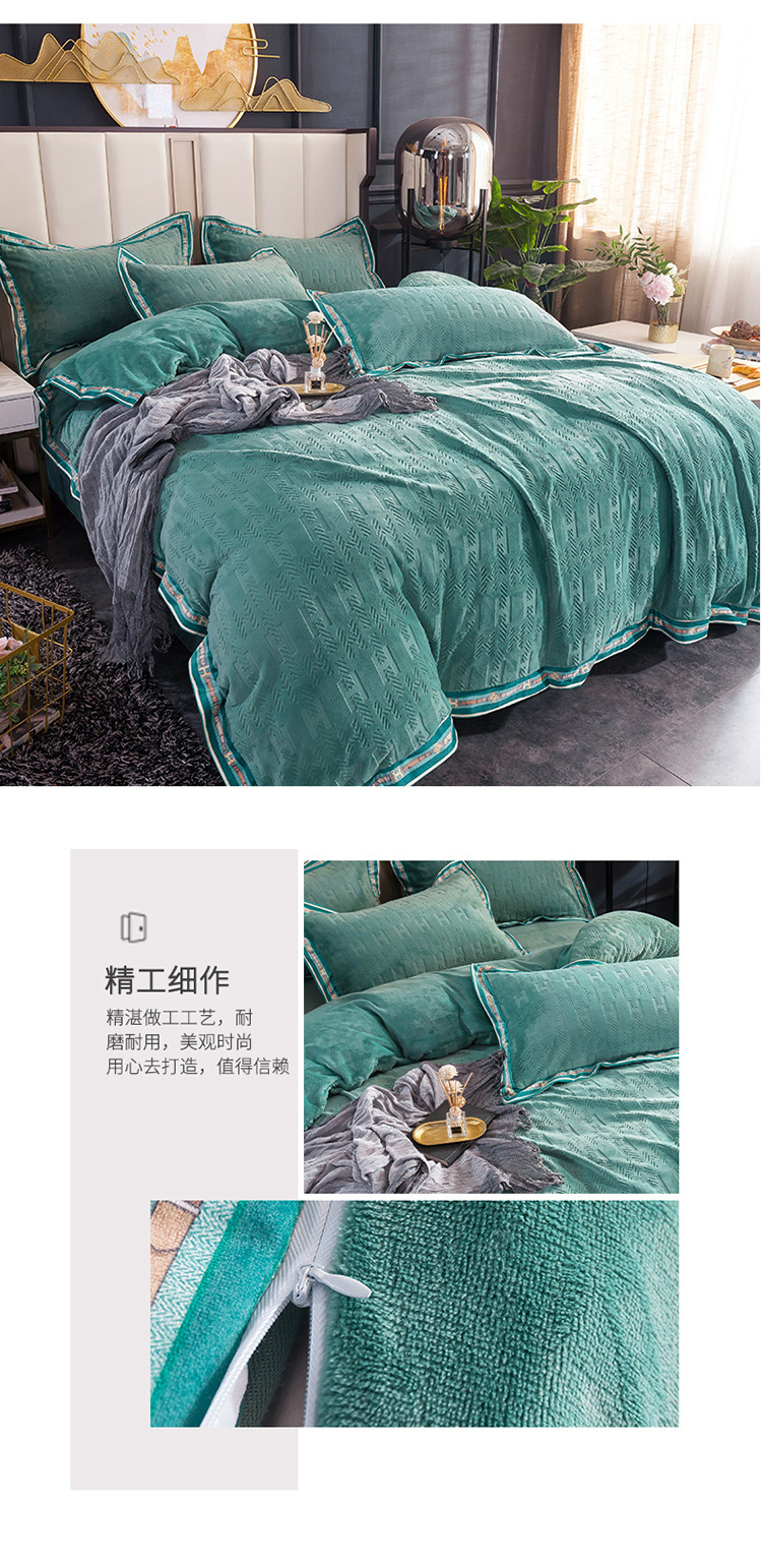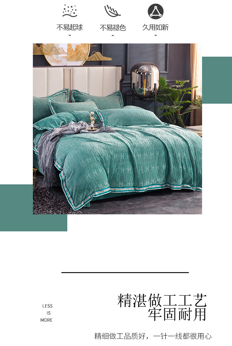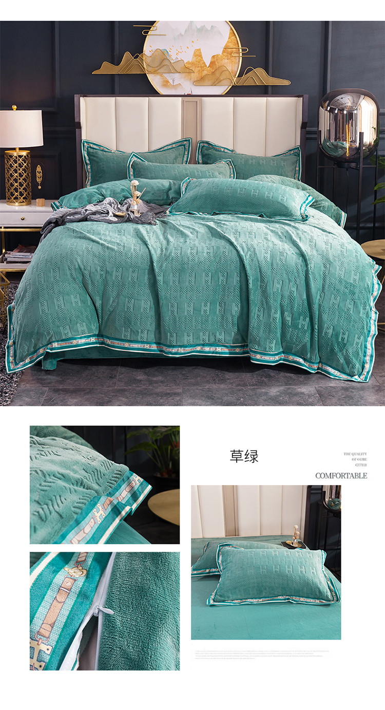 佳梦家纺轻奢提花绒四件套牛奶绒纯色消光压花宝宝绒被套 草绿