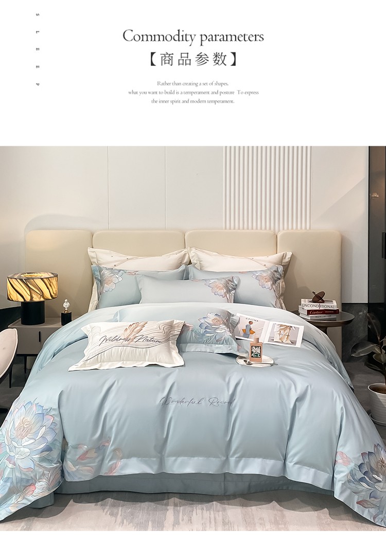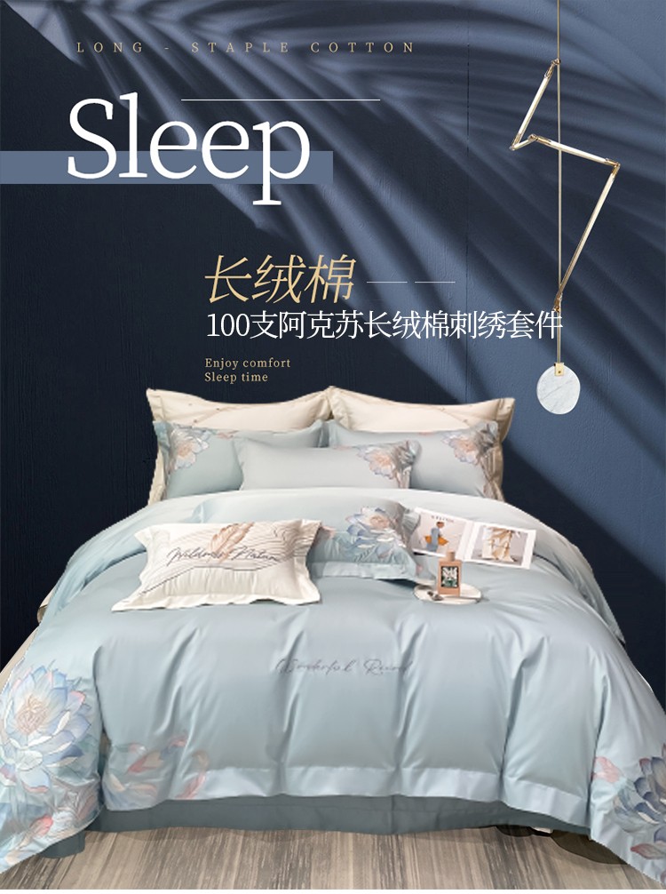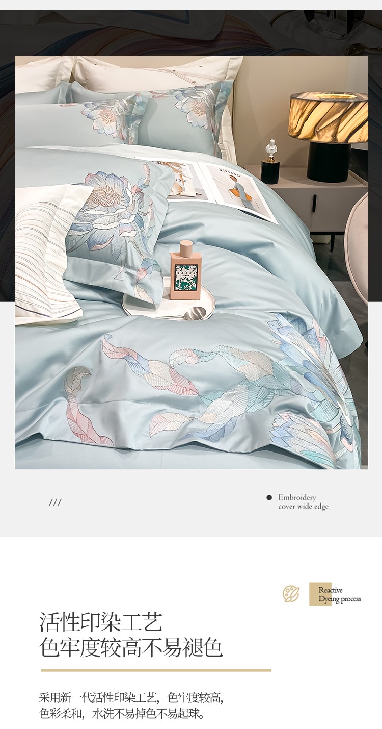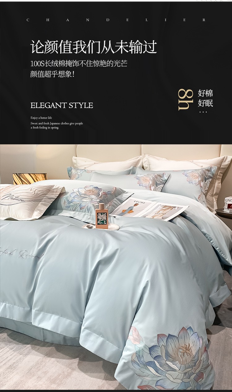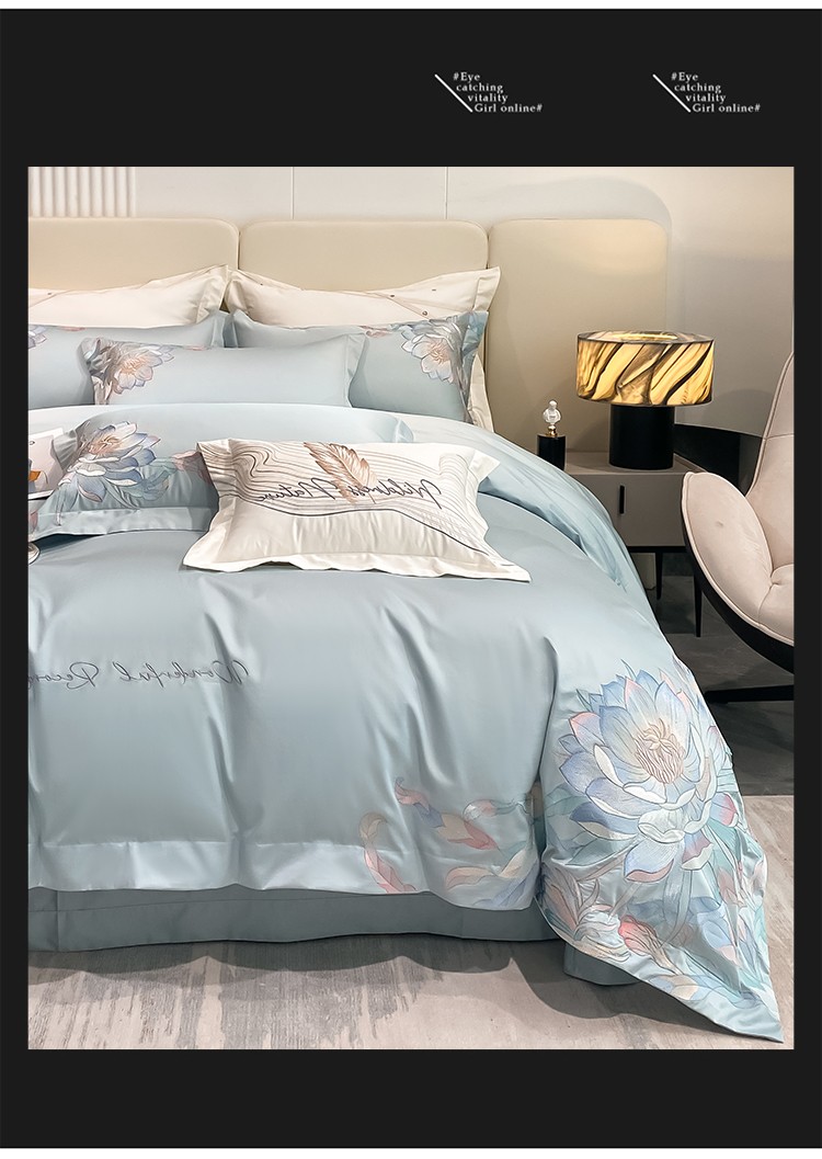 魅都 新100阿克苏长绒棉刺绣四件套荷塘月色天空蓝