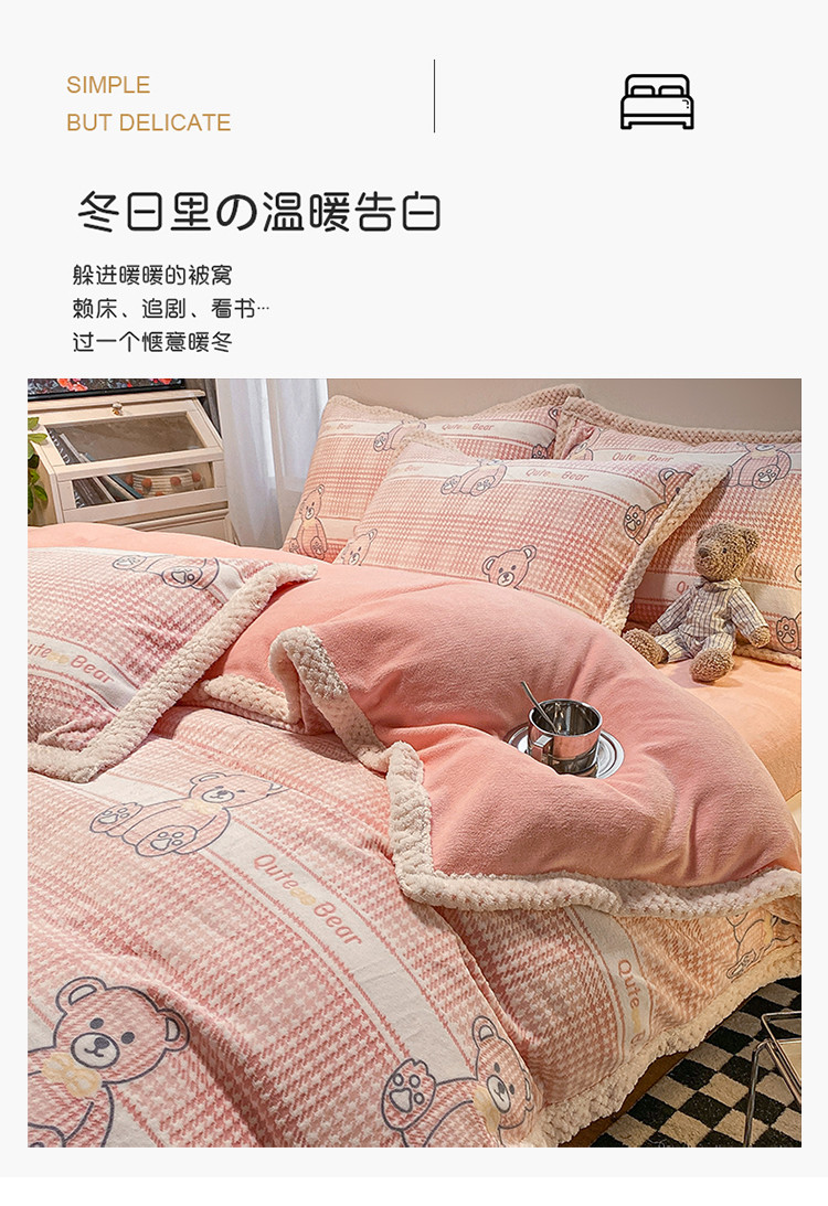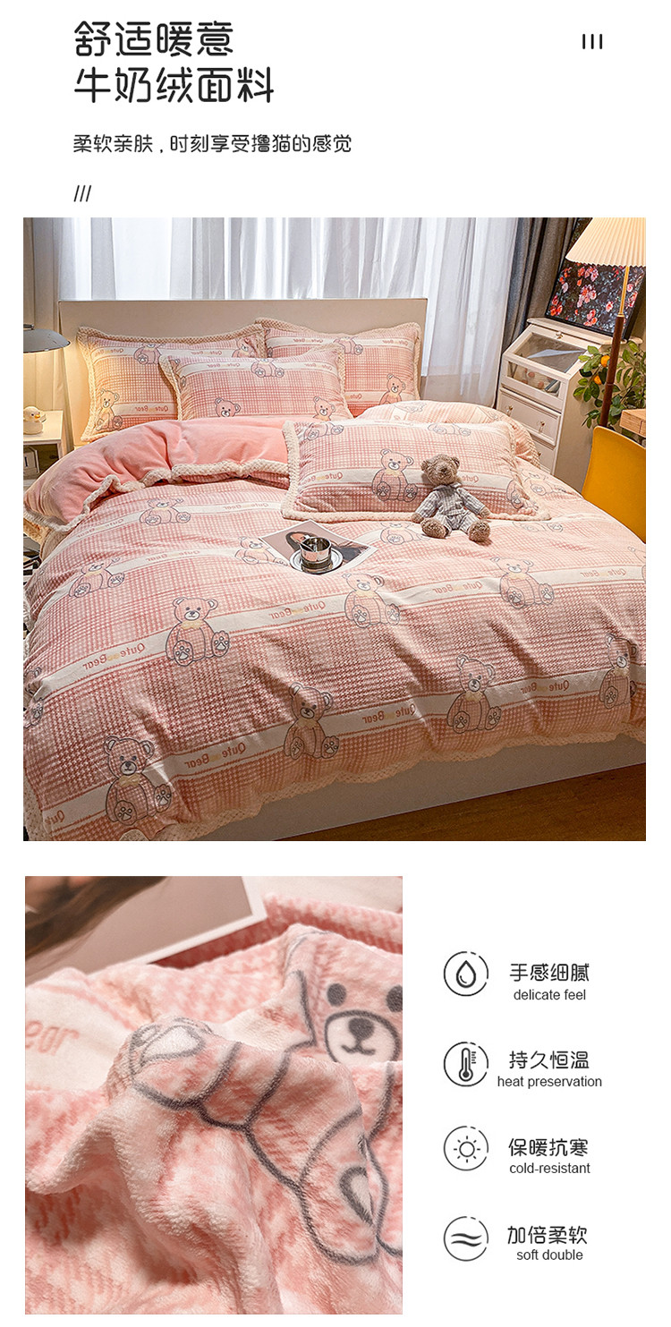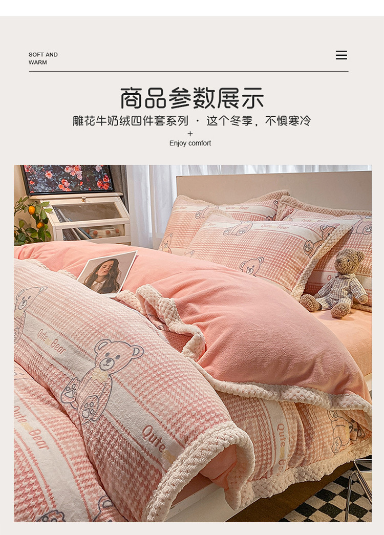 商品名称:花漾家居 2023秋冬雕花牛奶绒贝贝绒包边四件套 维尼小熊粉
