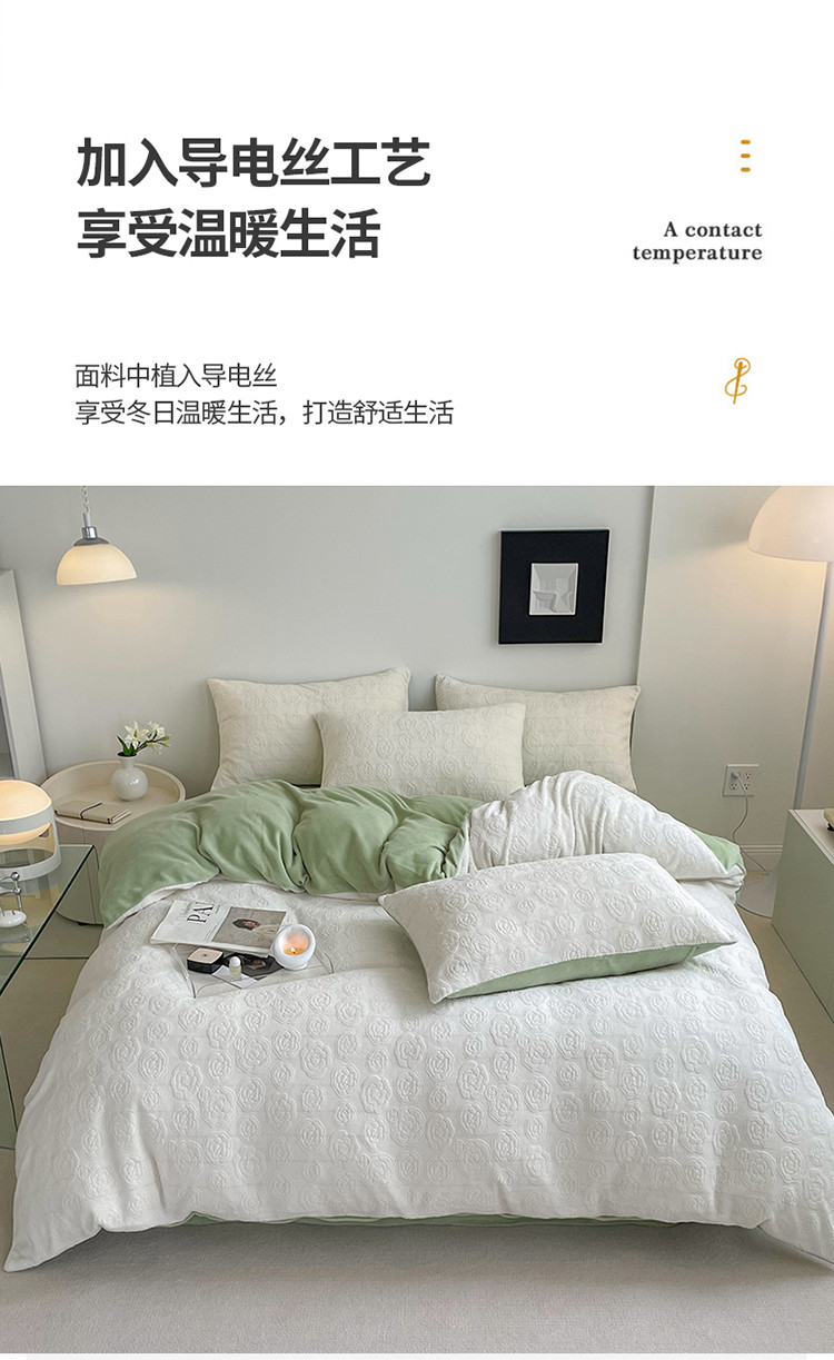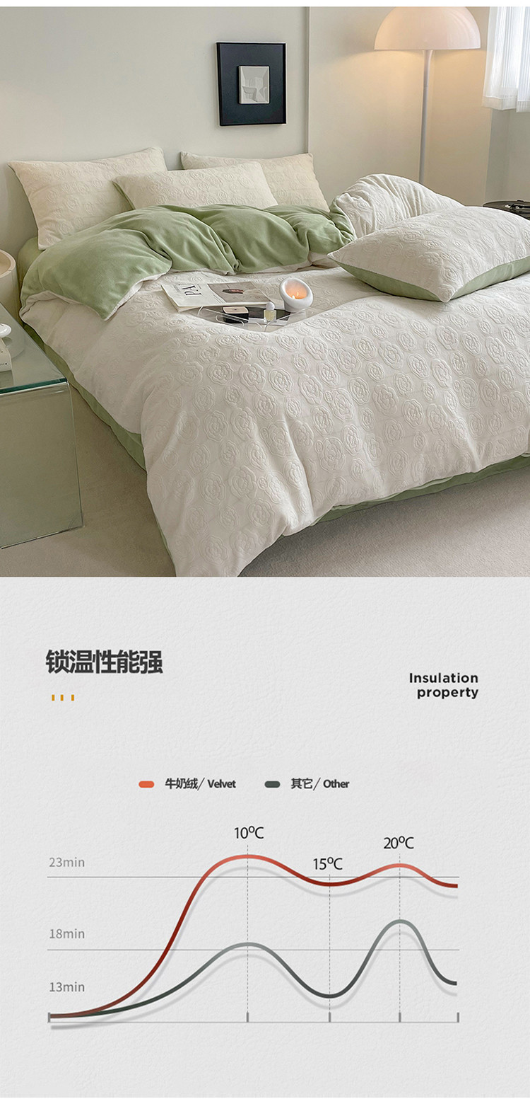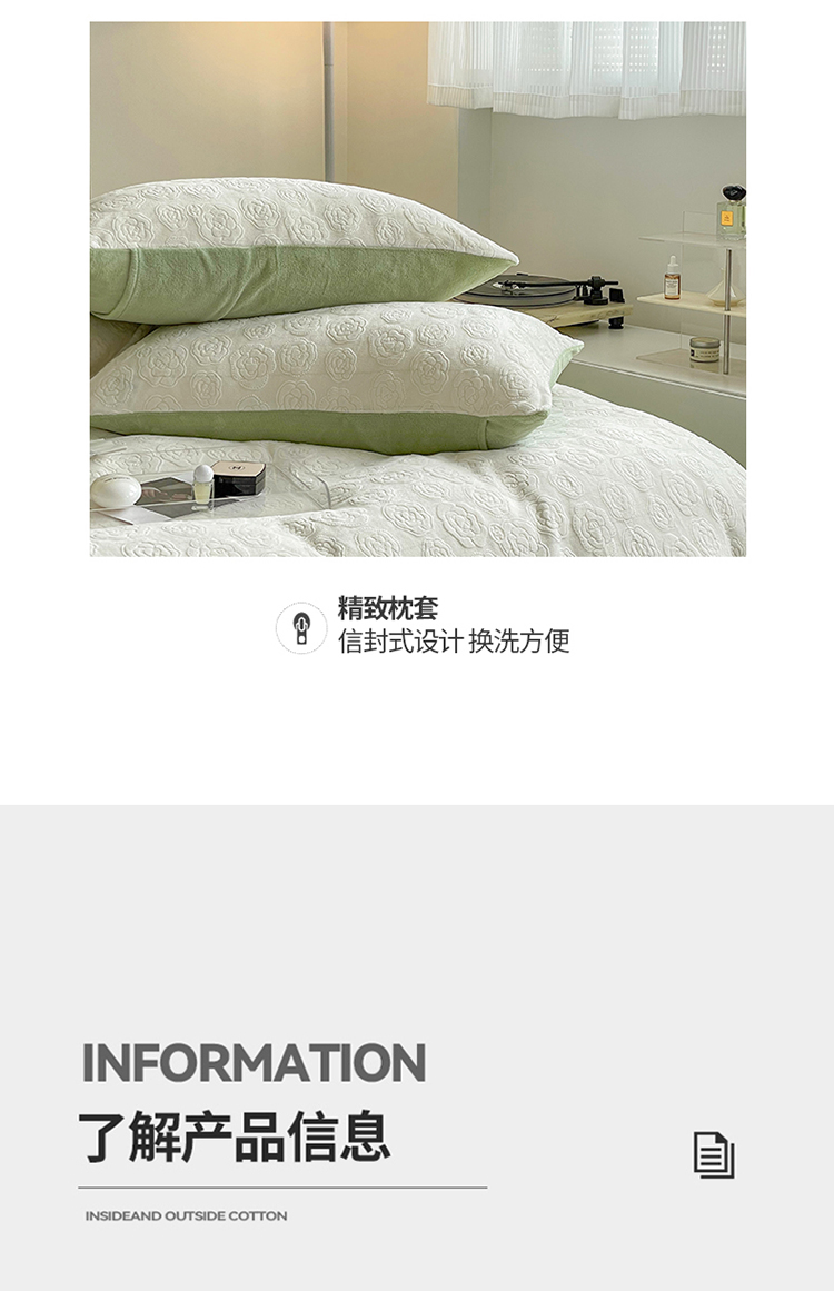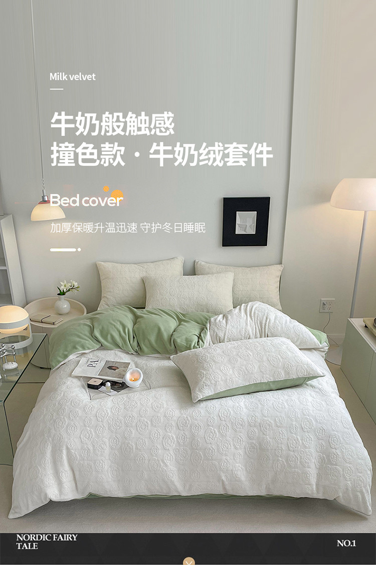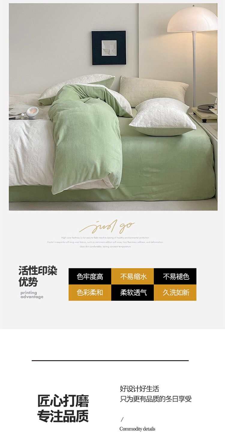 商品名称:潘朵拉 2023新款直播爆款撞色牛奶绒提花四件套山茶花-奶绿