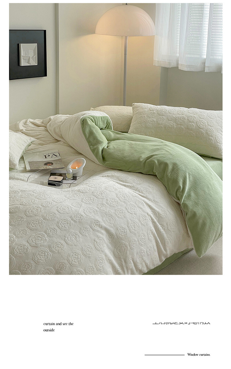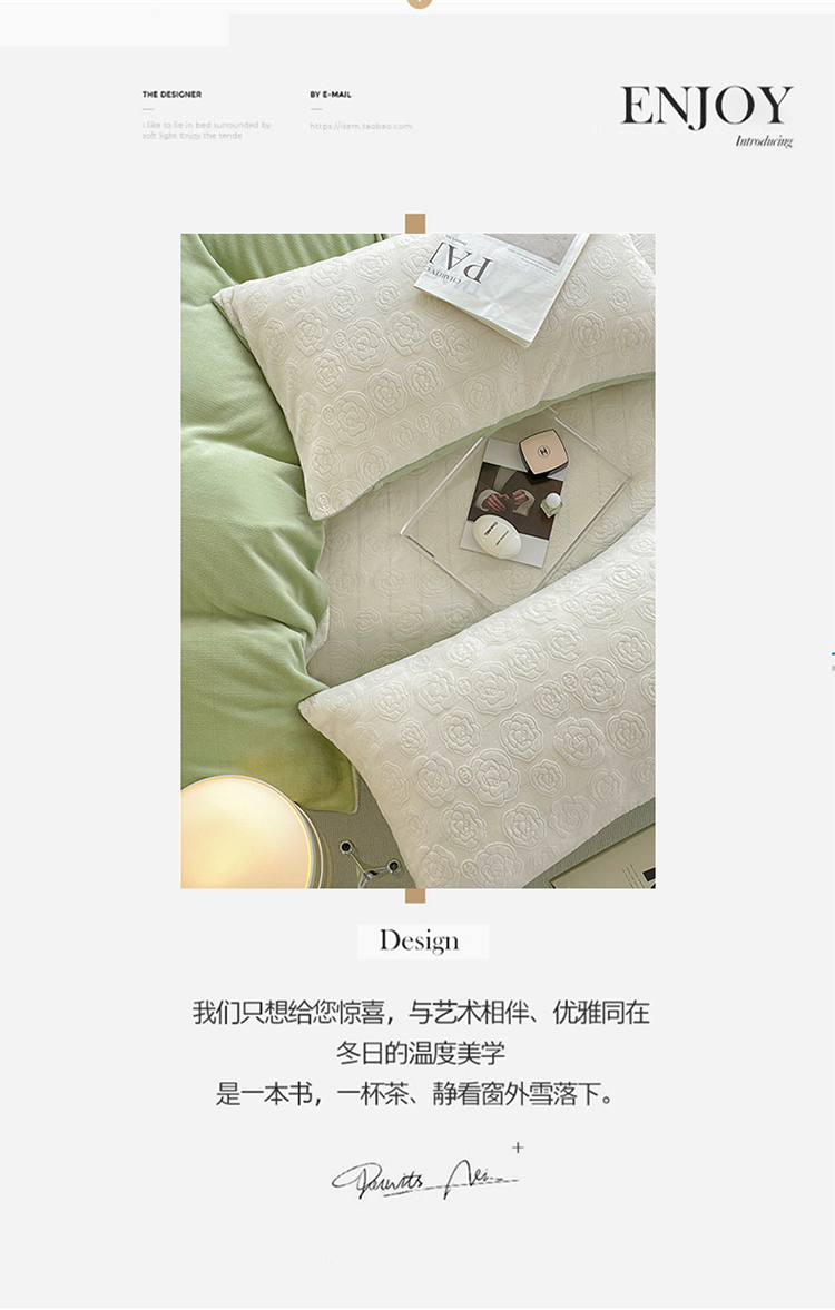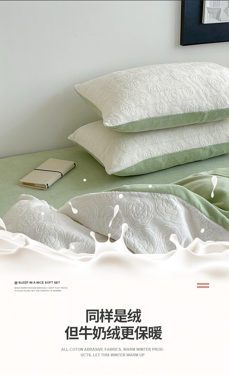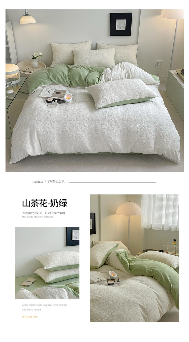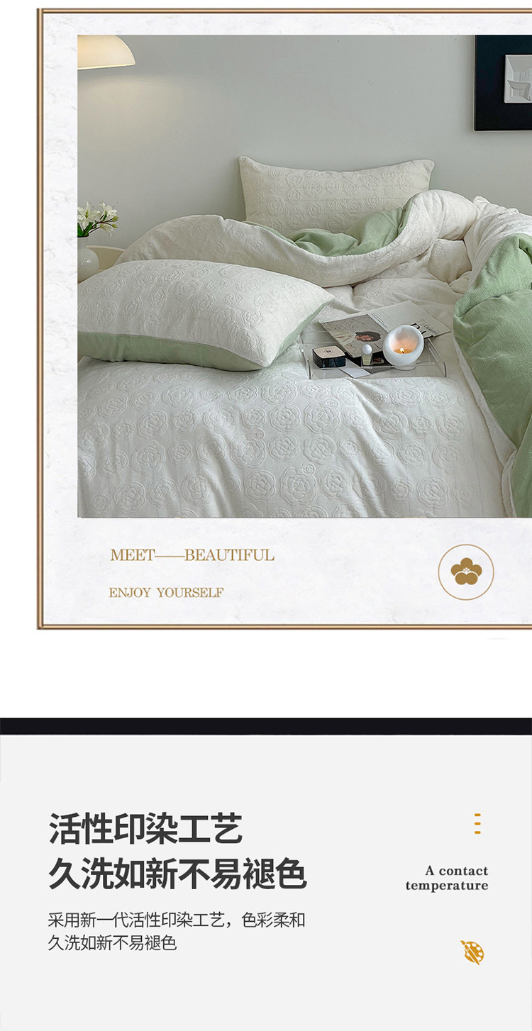 潘朵拉 2023新款直播爆款撞色牛奶绒提花四件套山茶花-奶绿