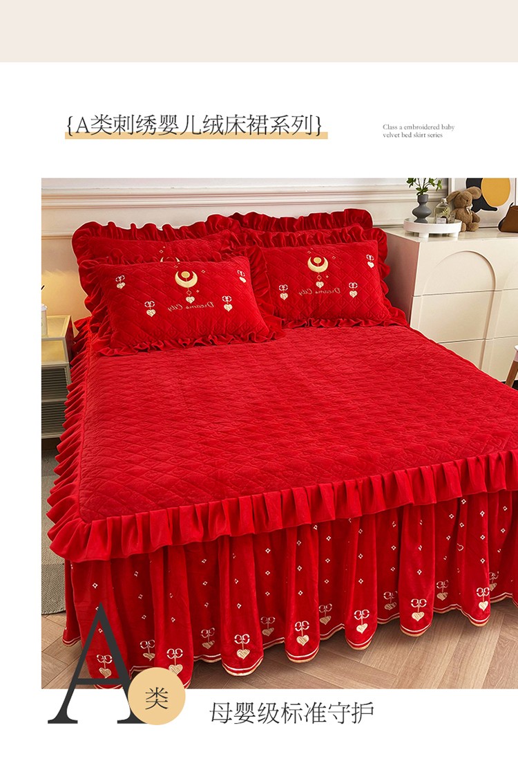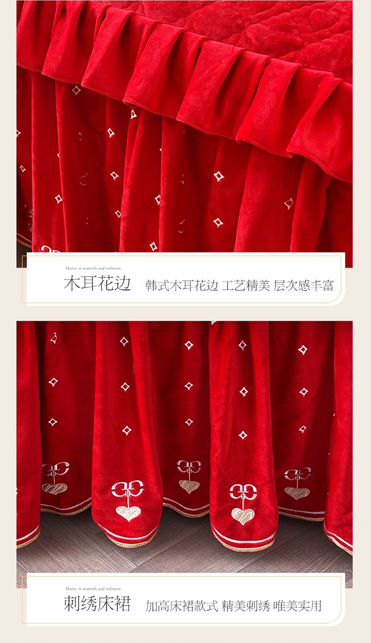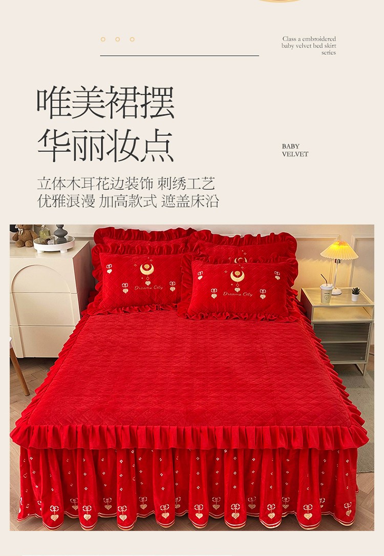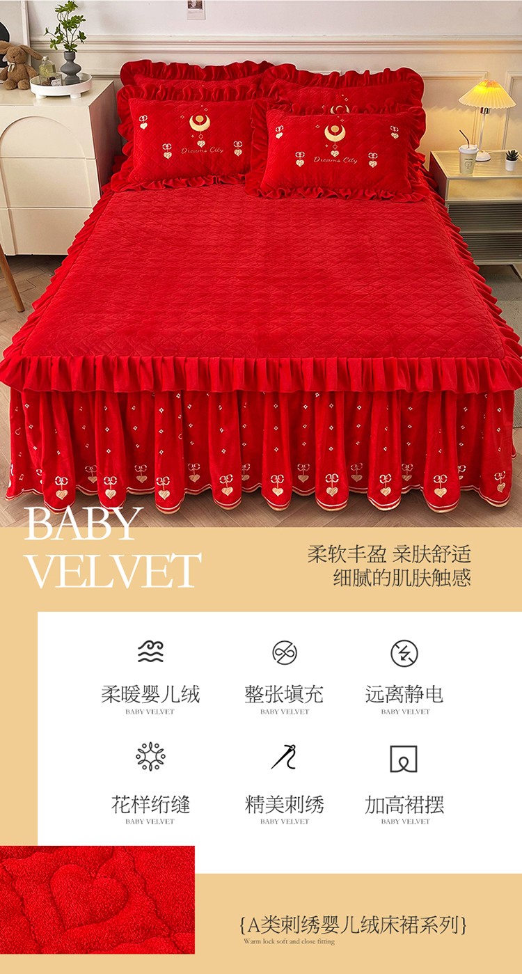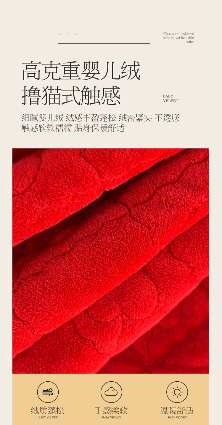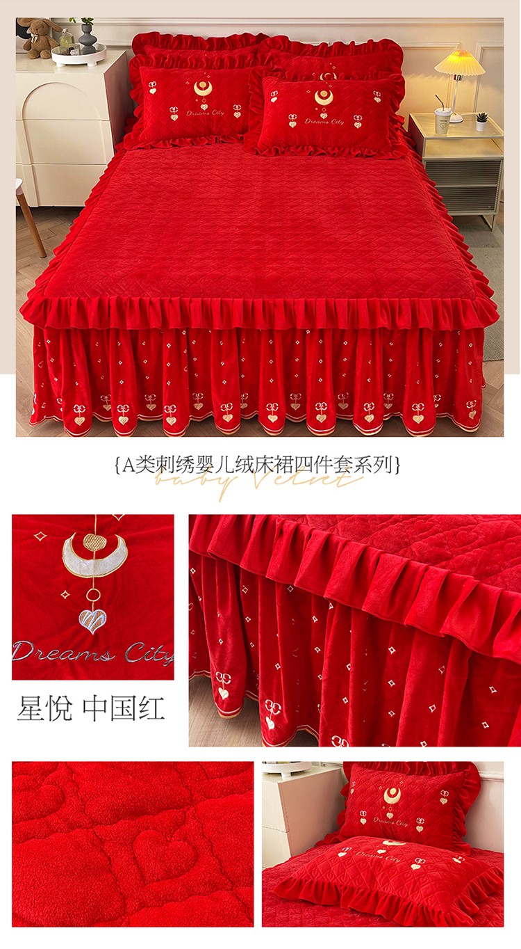 (总)宜凡家纺 2025新款婴儿绒压花全夹棉床裙四件套,韵雅-中国红,韵雅-黑天鹅