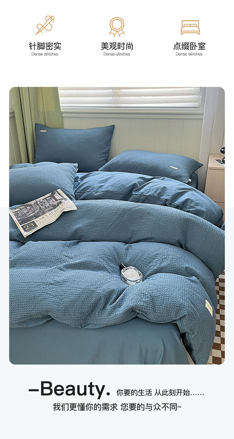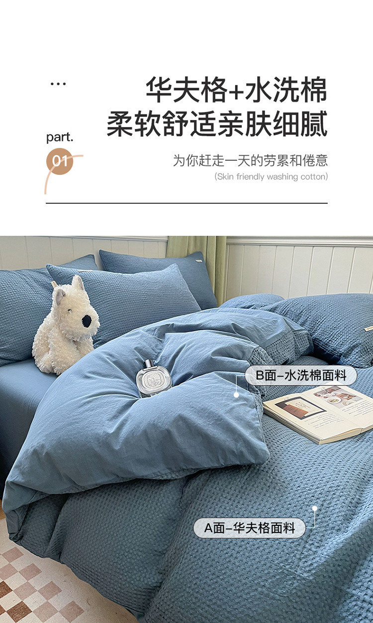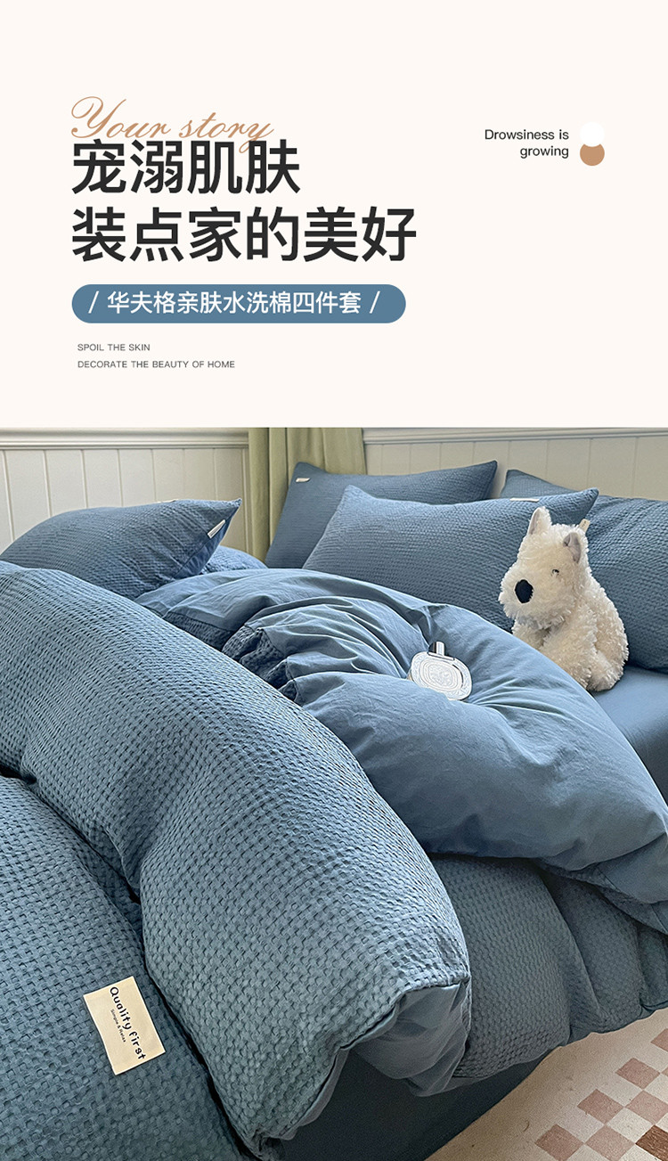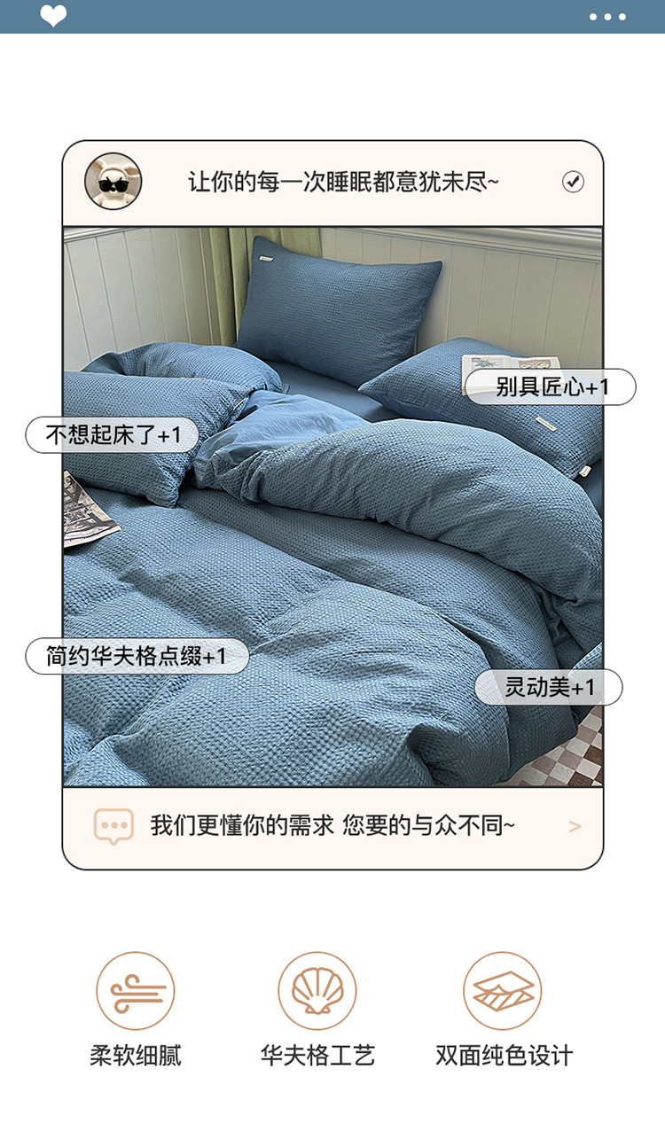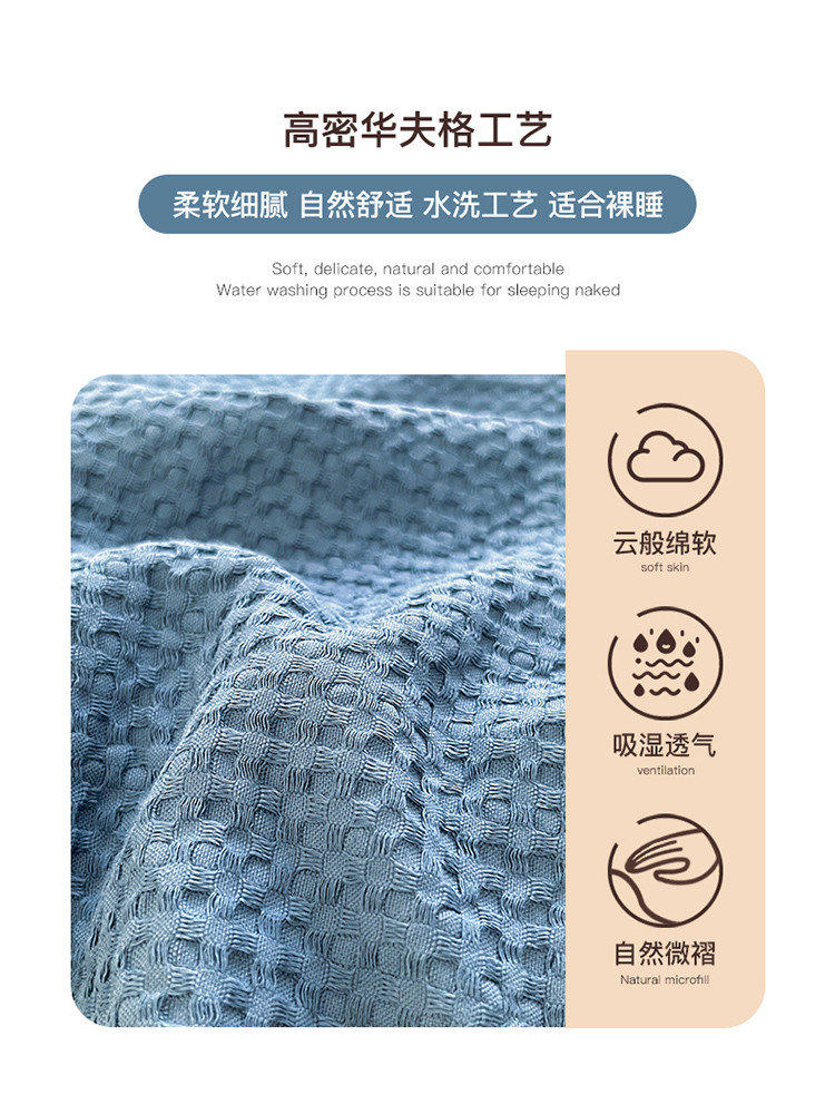 当前位置: 91家纺网 > 商品网购 > 床品套件 > 四件套 > 水洗棉四件套 > 丽美人 2023新款华夫格亲肤水洗棉四件套 华夫格-雾蓝