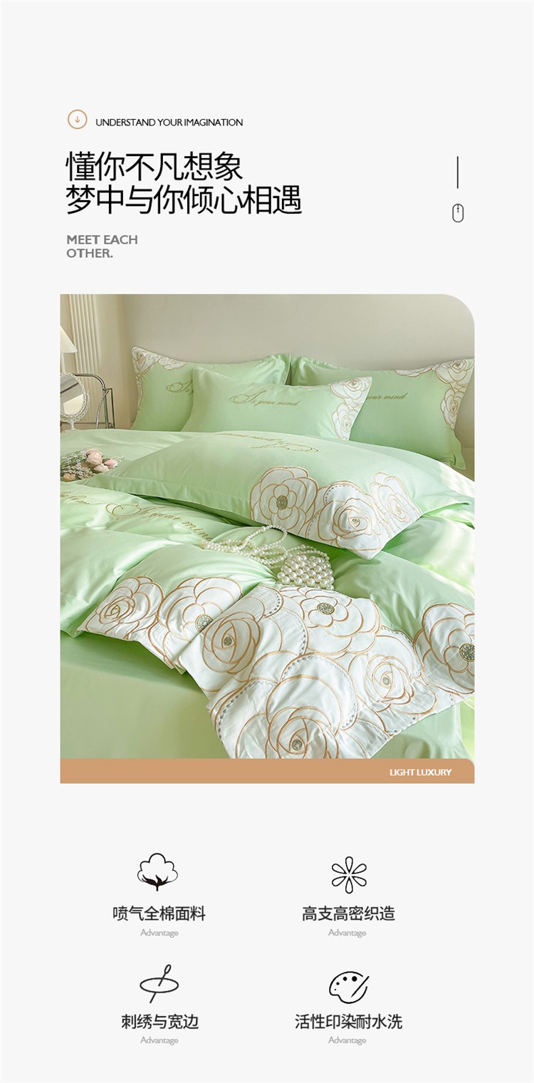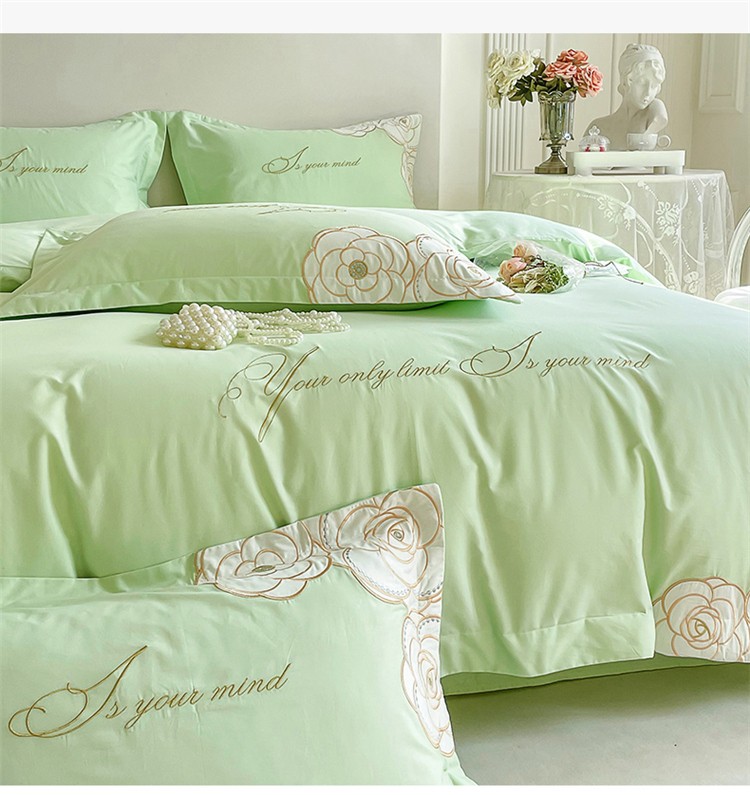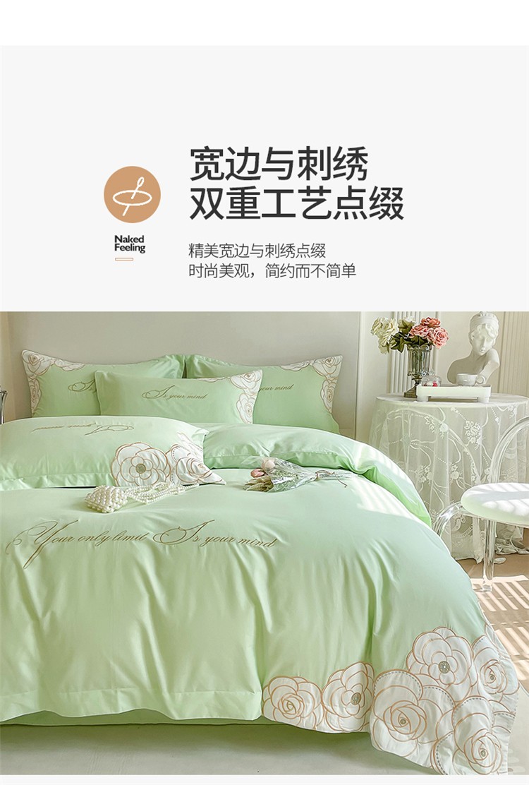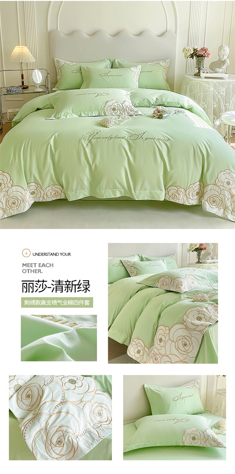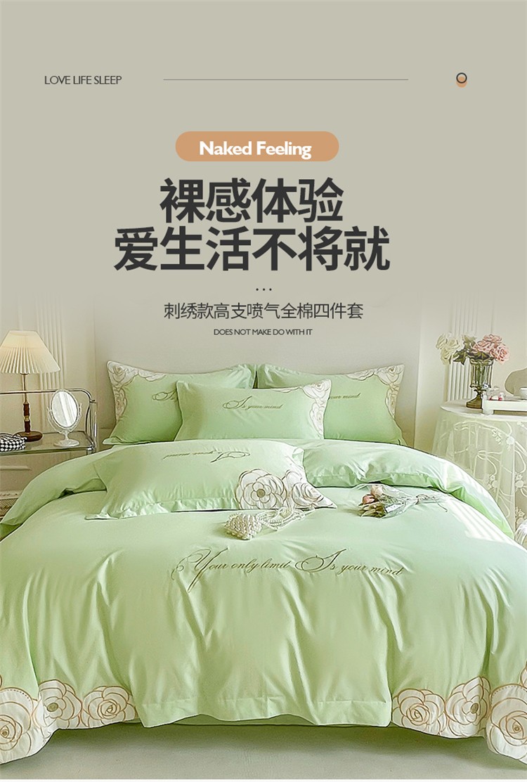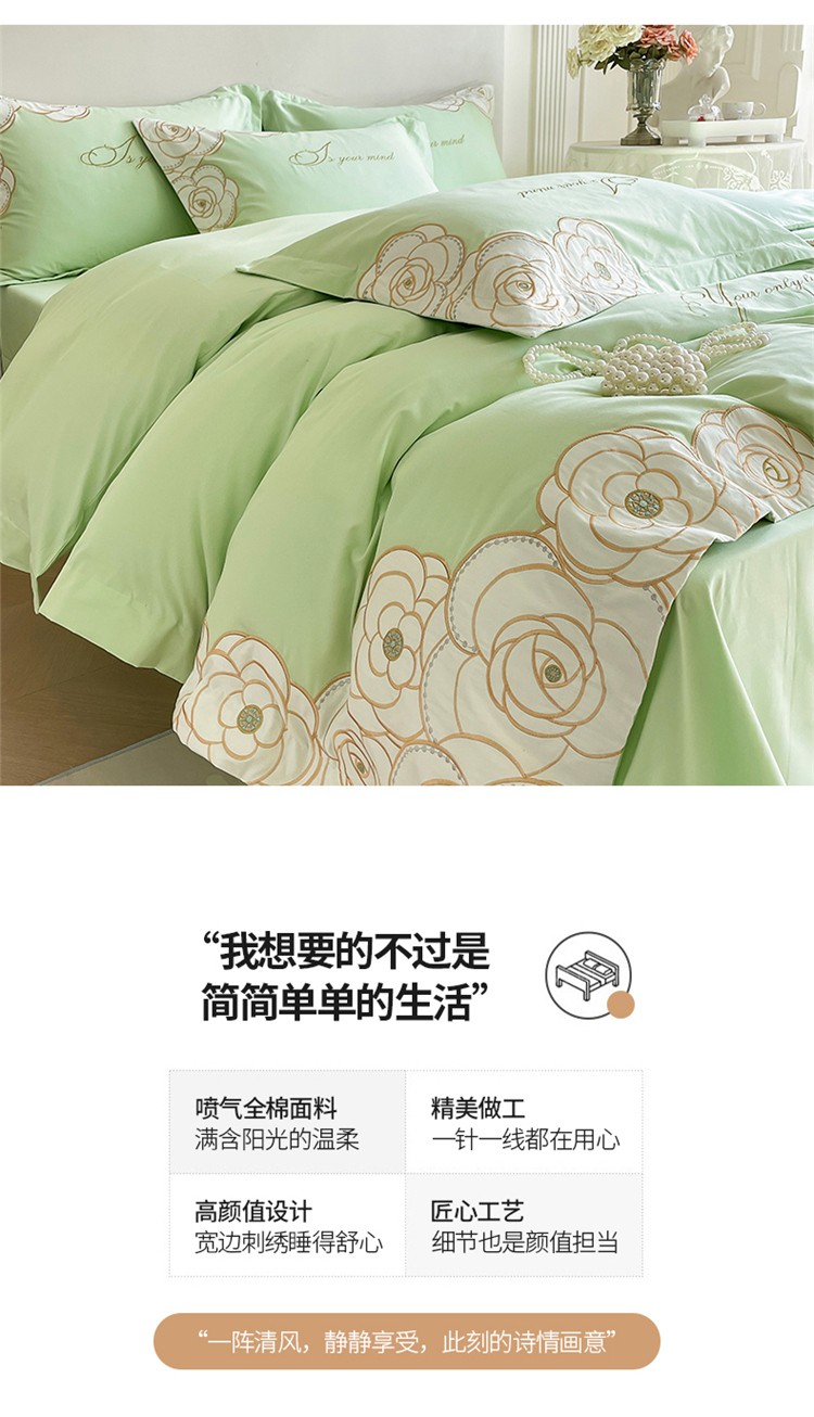 商品名称:懒猫2024新款高精密40支全棉喷气绣花四件套 -丽莎系列 丽莎-清新绿