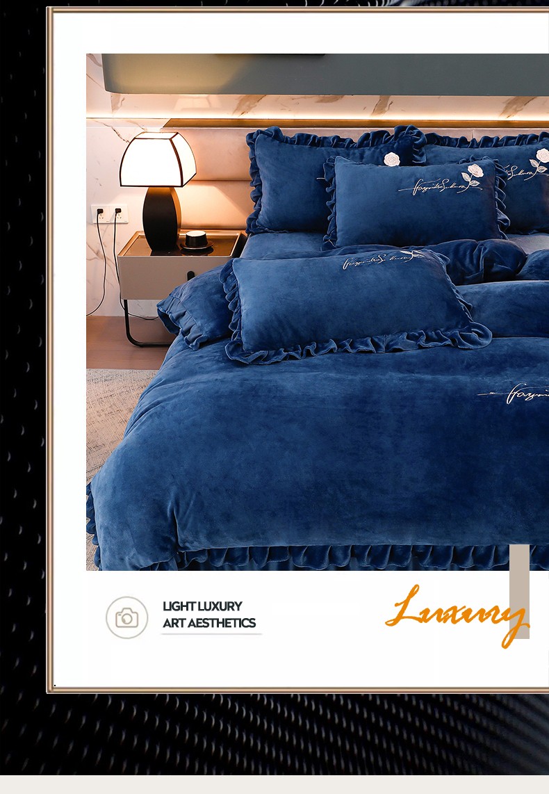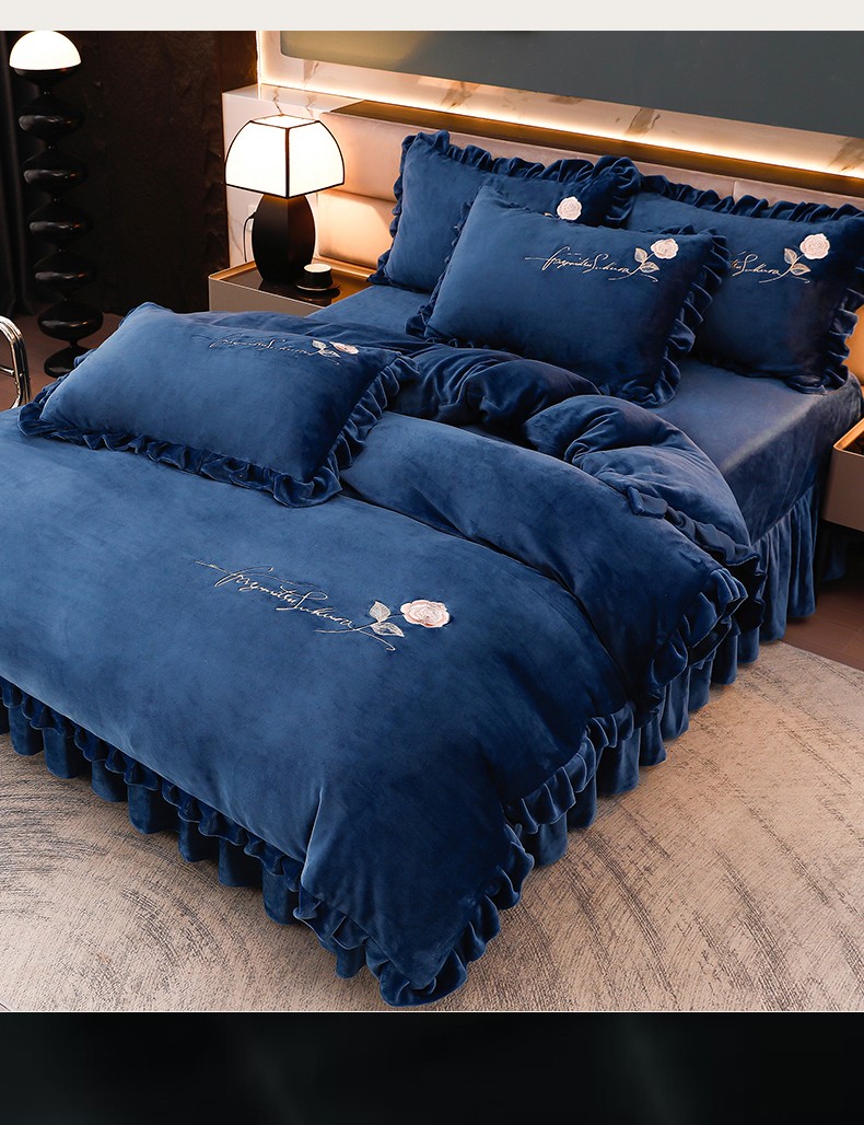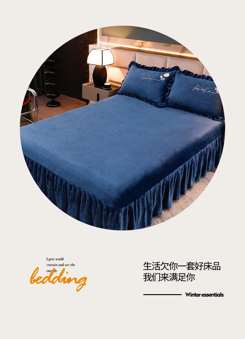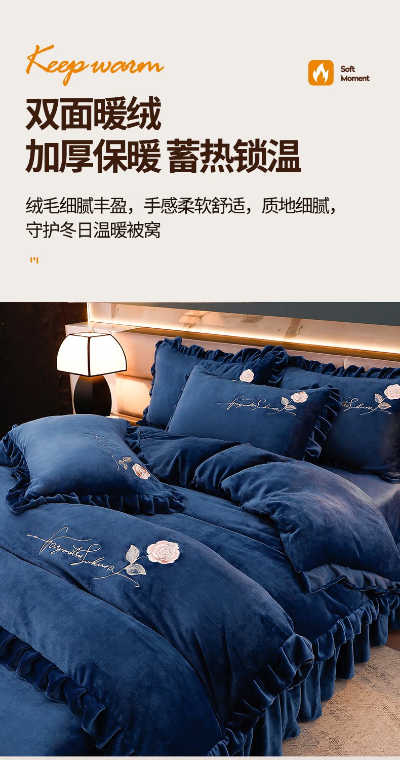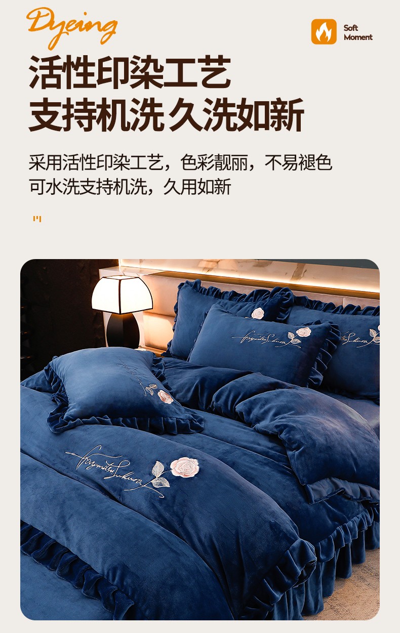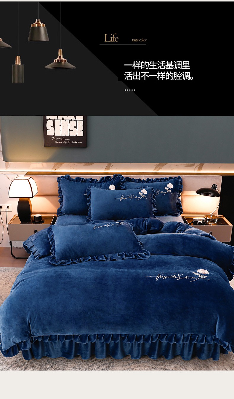 (总)绣女坊2023新款韩版花边床裙款牛奶绒宝宝绒四件套,宾利蓝,豆沙,灰色,酒红色,松花绿,紫色