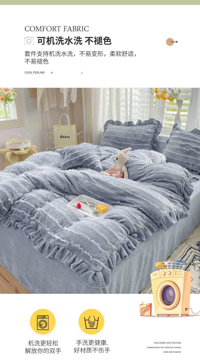(总)绒世界 2025新款四季款夹棉泡泡纱床裙床笠被套四件套系列,浅灰,豆绿,米白,慕蓝,玉色,紫色