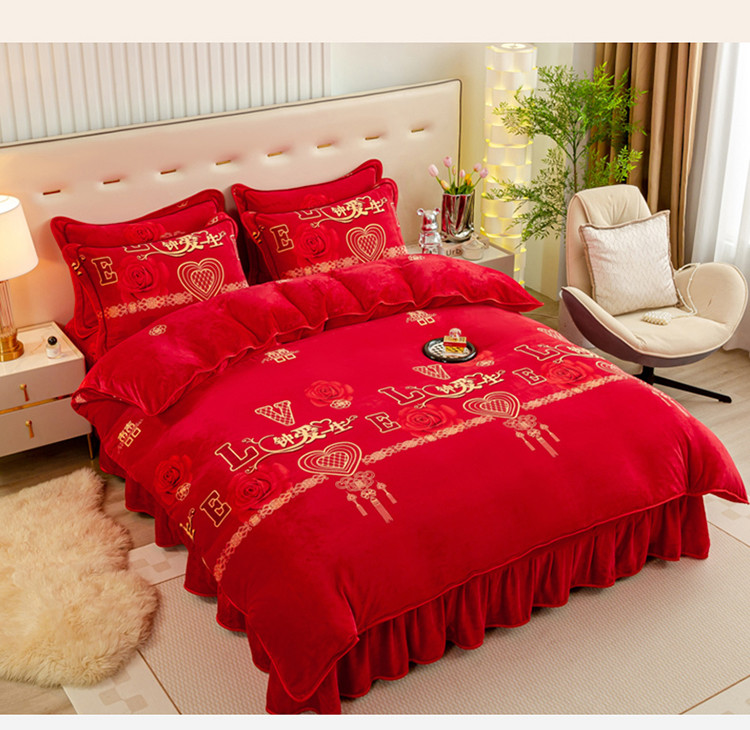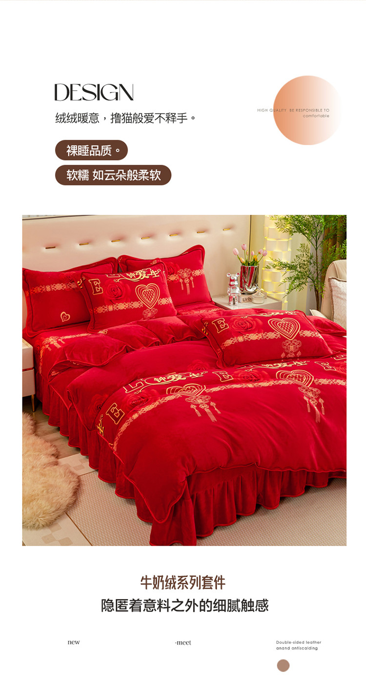 (总)博兰蒂 2025秋冬新款高克重纯色牛奶绒床裙款四件套,豆沙,粉玉,红色,灰色,橘色,咖色,蓝色,苹果绿,浅绿,紫色,墨紫
