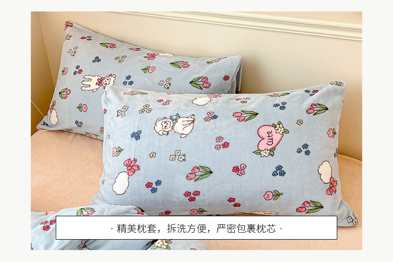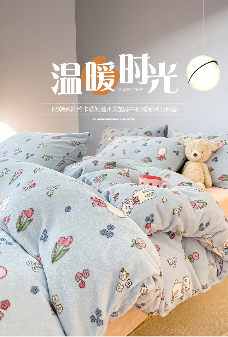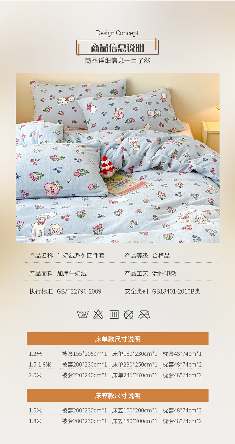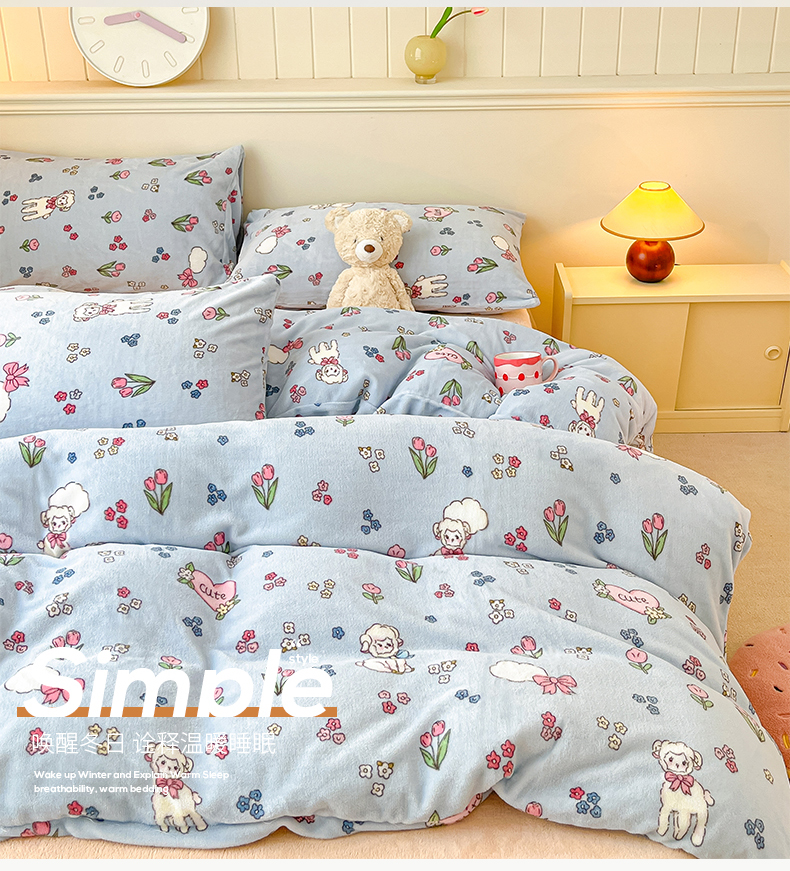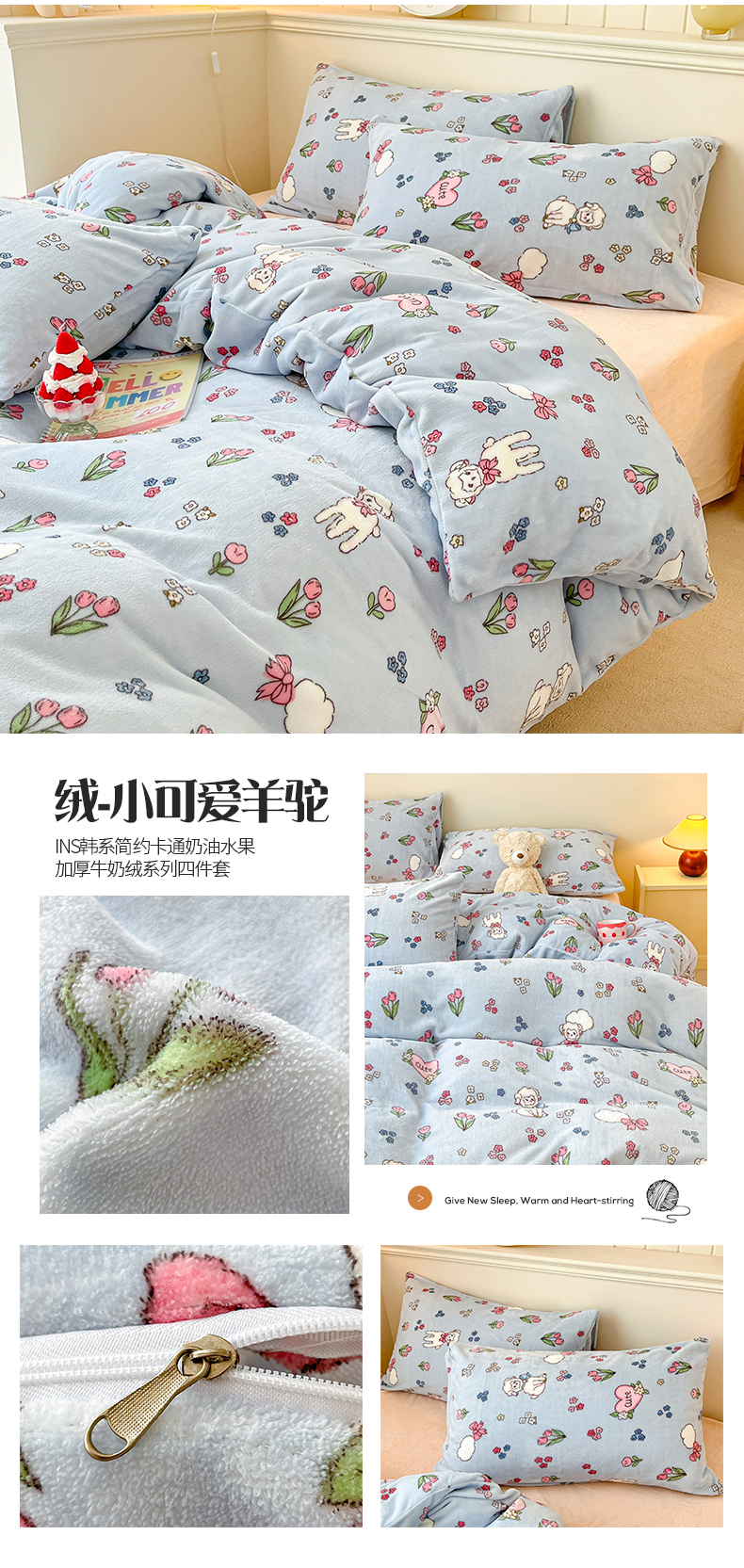 商品名称:桃子家居 2023新款ins韩系简约卡通奶油小清新加厚牛奶绒系列四件套 绒-小可爱羊驼