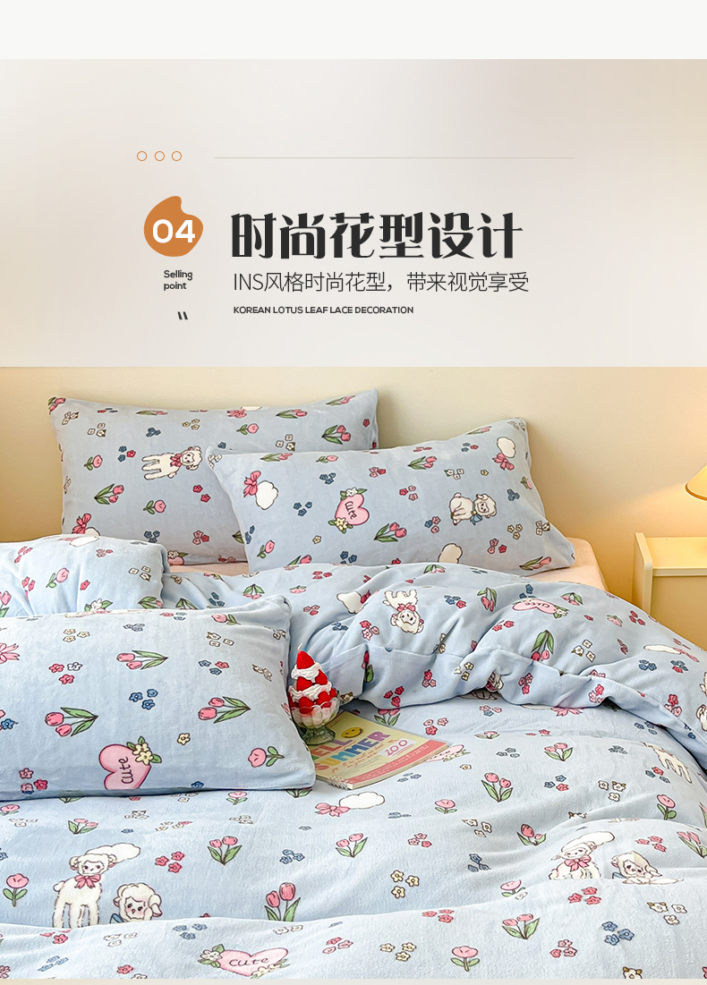 桃子家居 2023新款ins韩系简约卡通奶油小清新加厚牛奶绒系列四件套 绒-小可爱羊驼