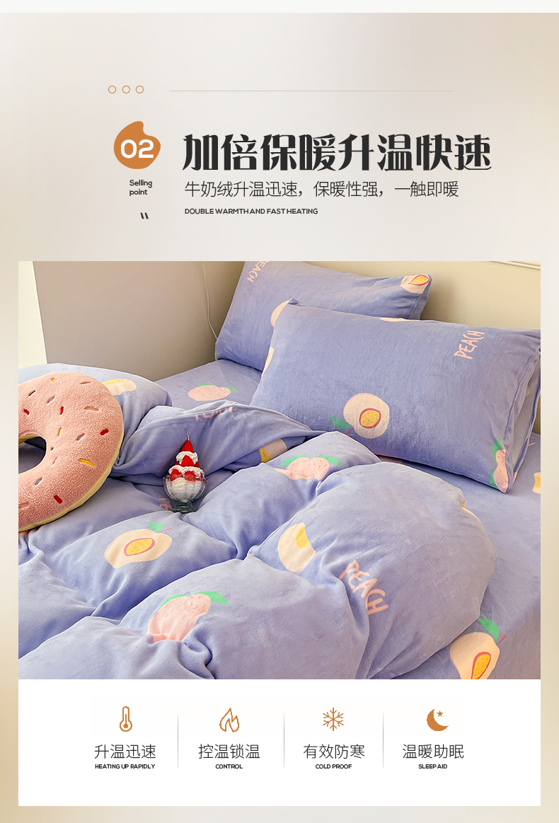 桃子家居 2023新款ins韩系简约卡通奶油小清新加厚牛奶绒系列四件套 绒-紫色桃子