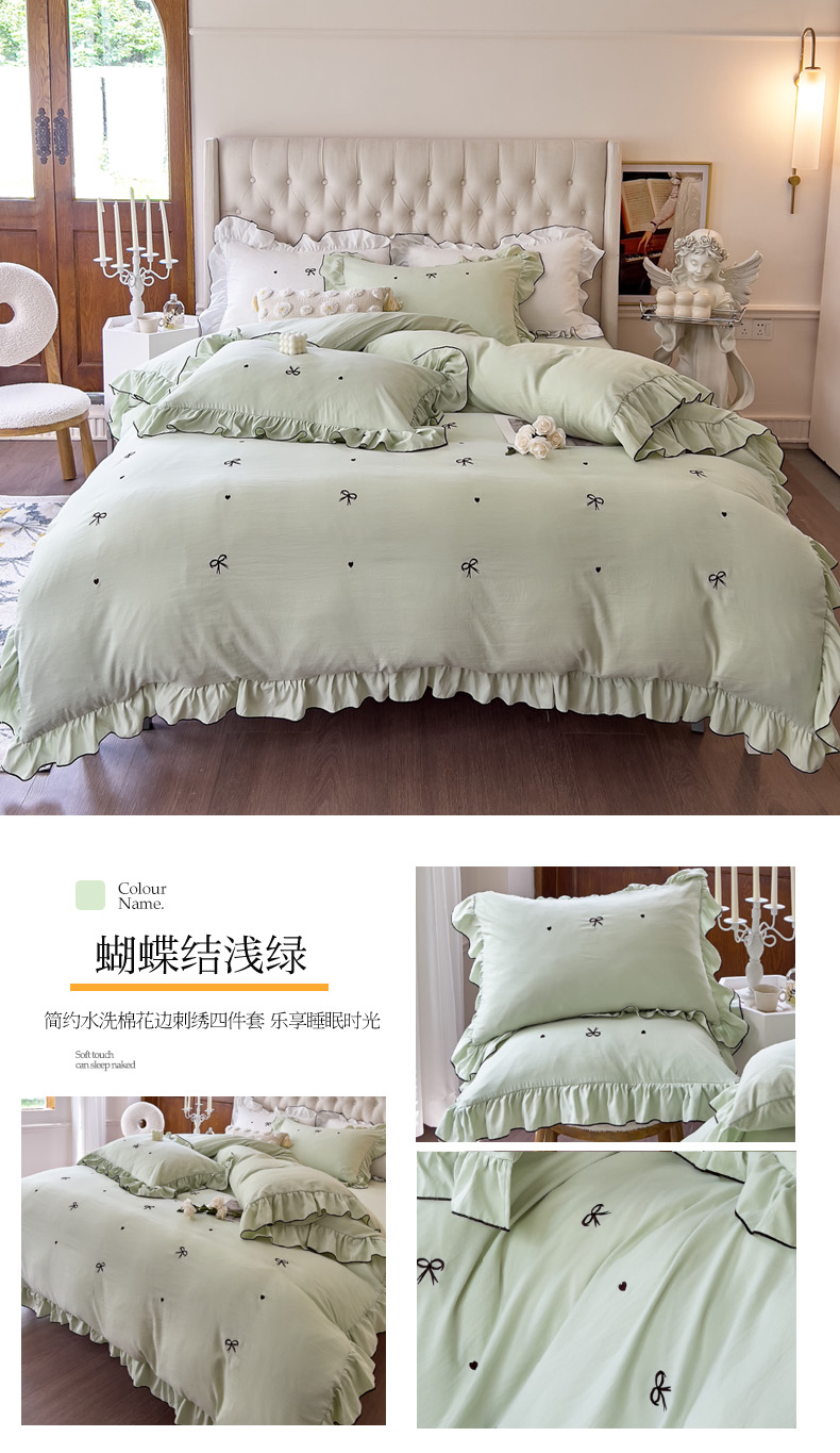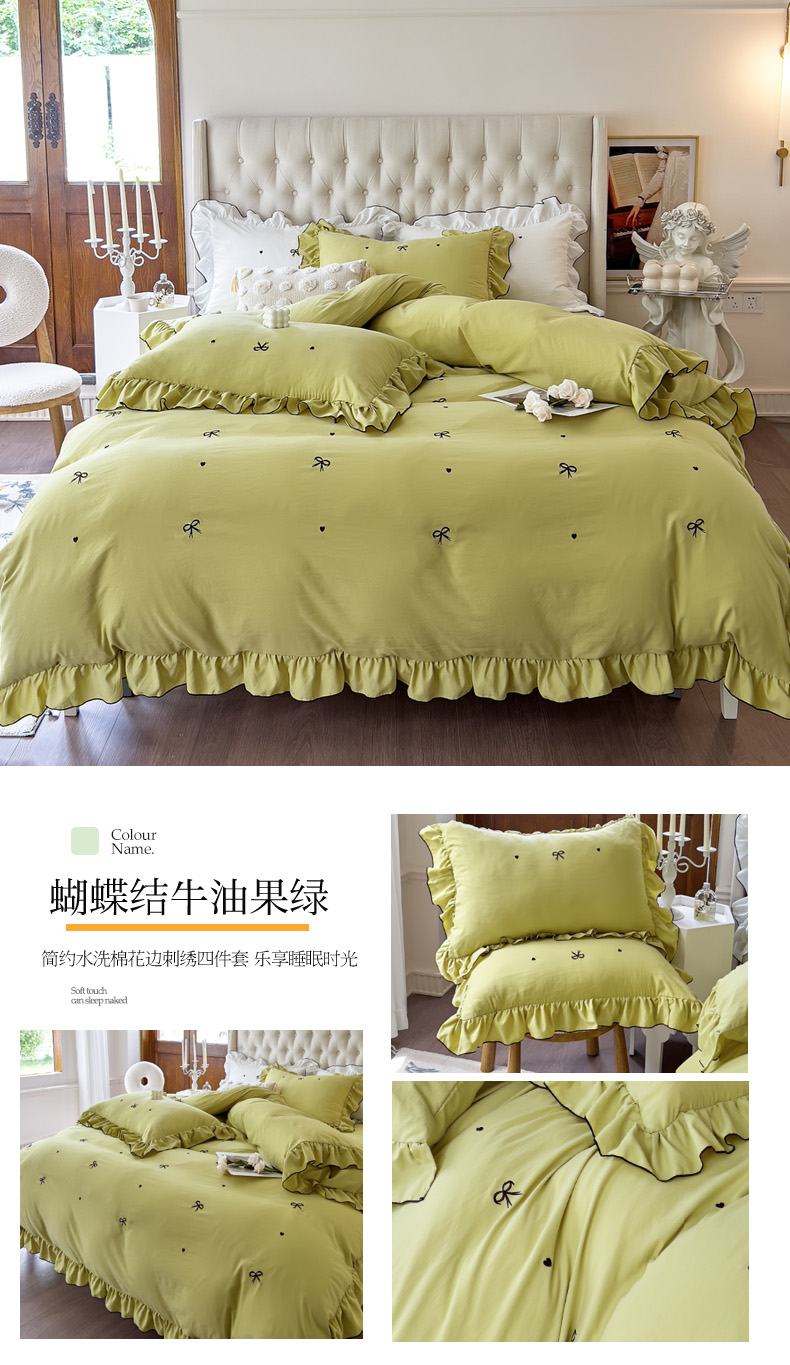 (总)梦可莱 2024新款亲肤刺绣荷叶边四件套-心灵迷恋,豆沙,奶油粉,奶油黄,牛油果绿,清新绿,香芋紫
