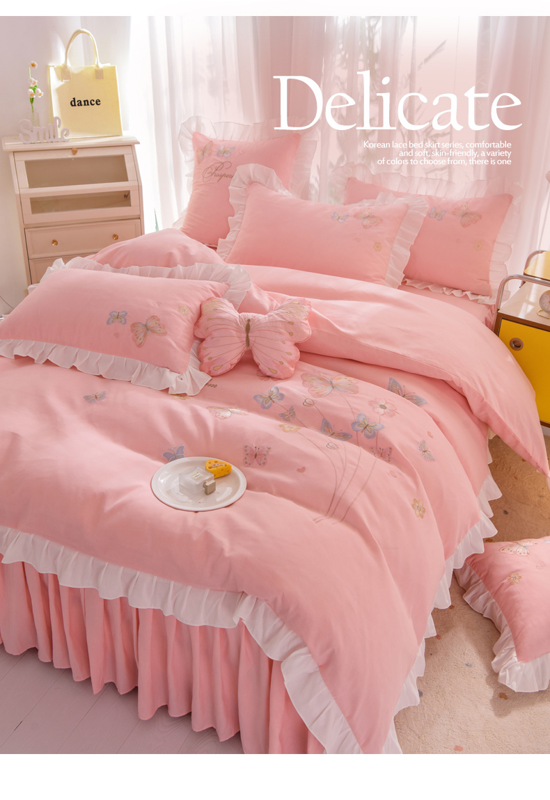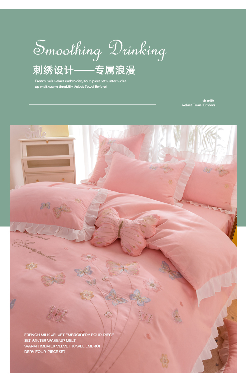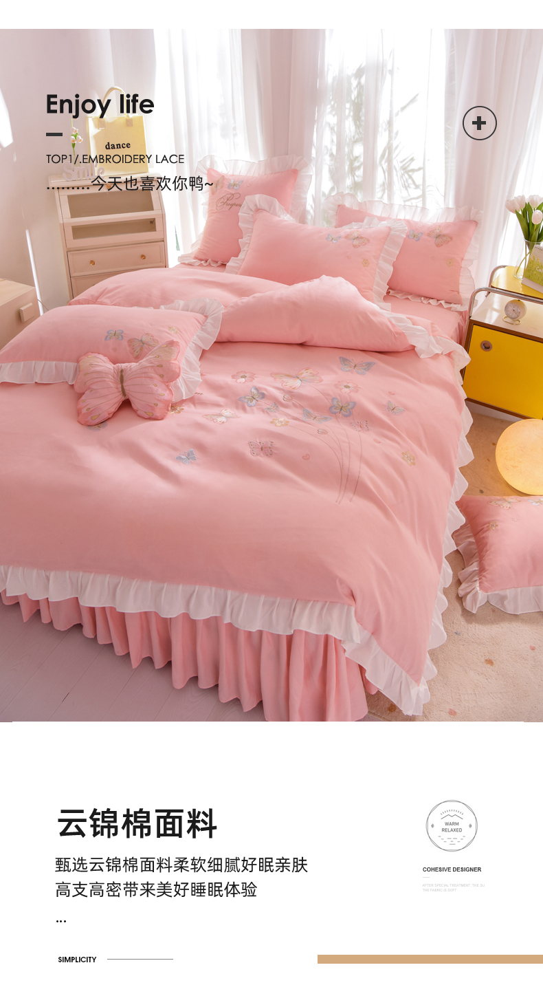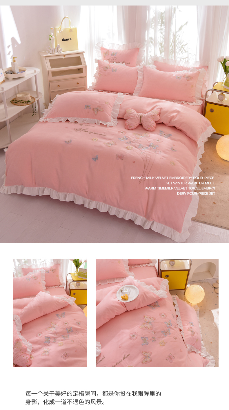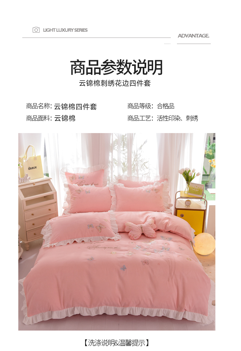 当前位置: 91家纺网 > 商品网购 > 床品套件 > 四件套 > 化纤活性四件套 > 丝印良品 2023新款秋冬保暖云锦棉刺绣花边春卉系列四件套 春卉-粉玉