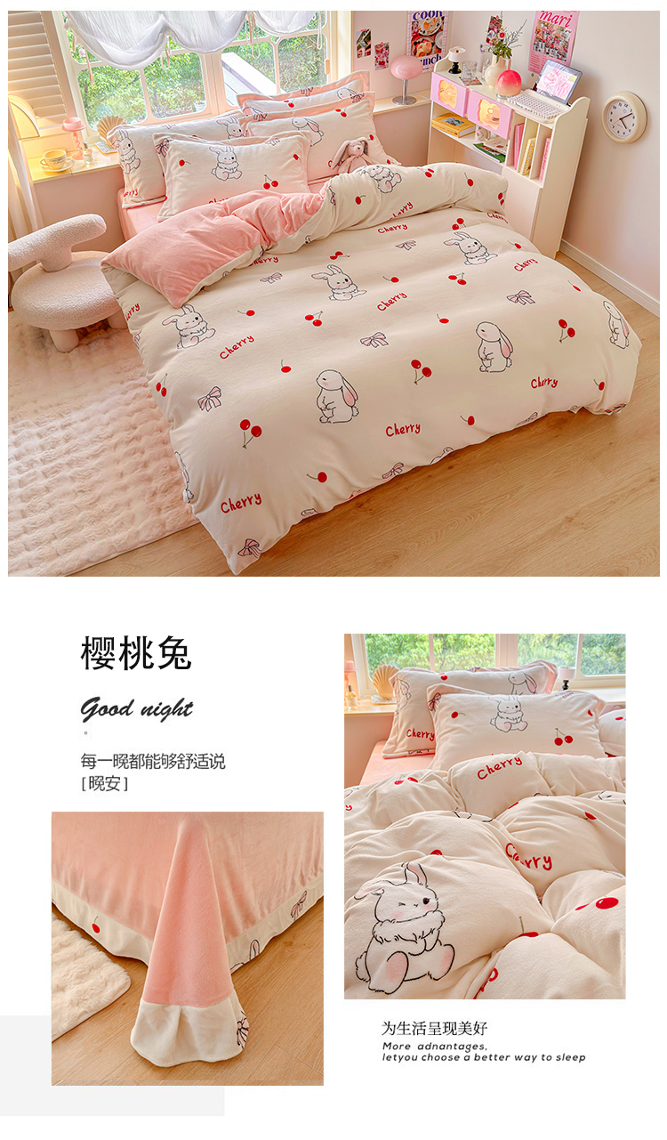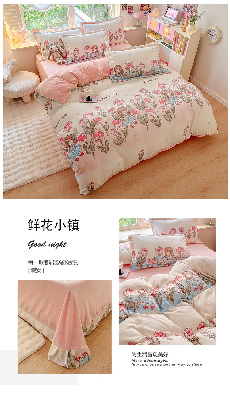 (总)呗旺鹿 2025新款卡通棉+绒牛奶绒棉绒四件套,心意满满,快乐魔法,闹钟麦田