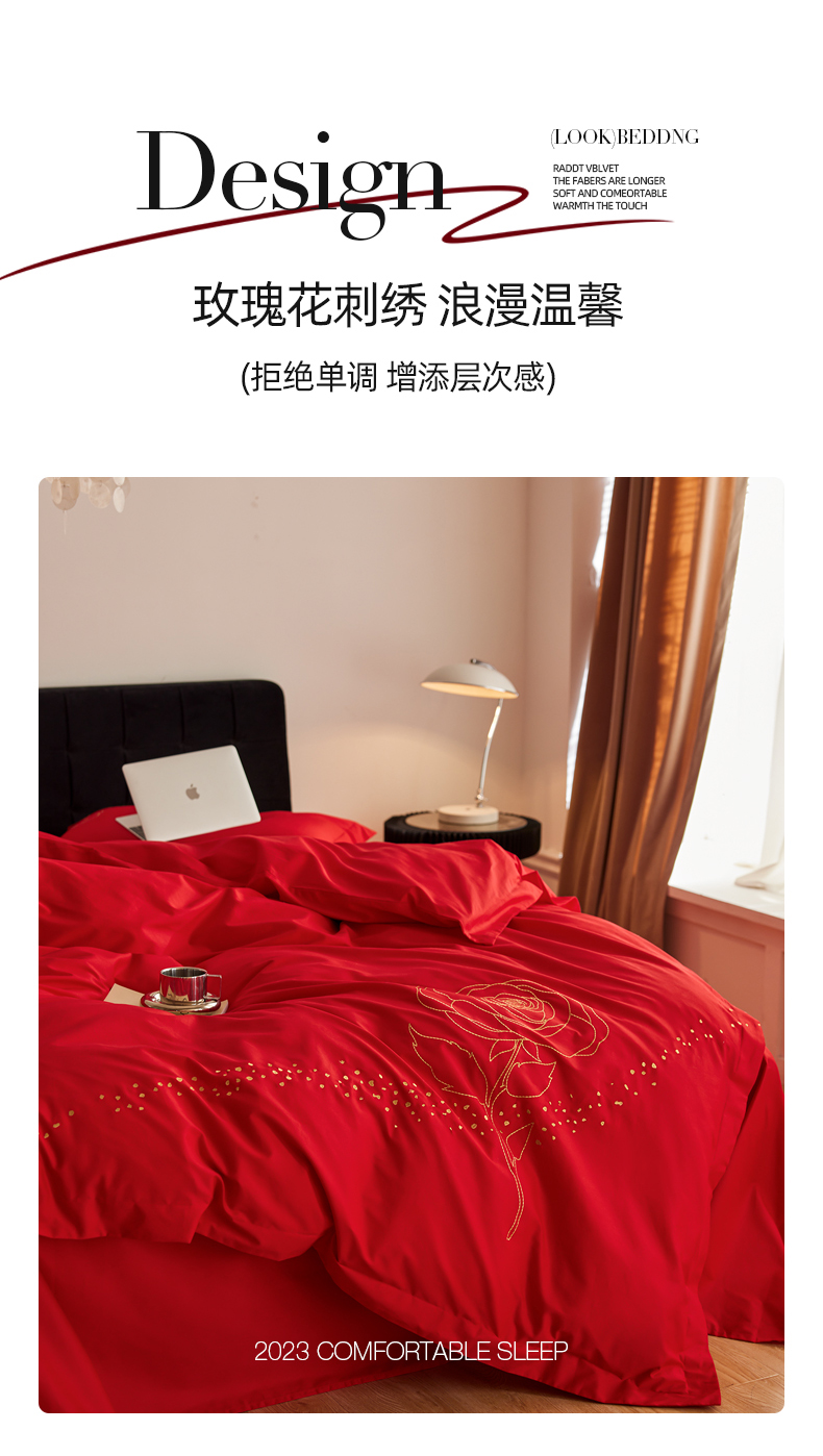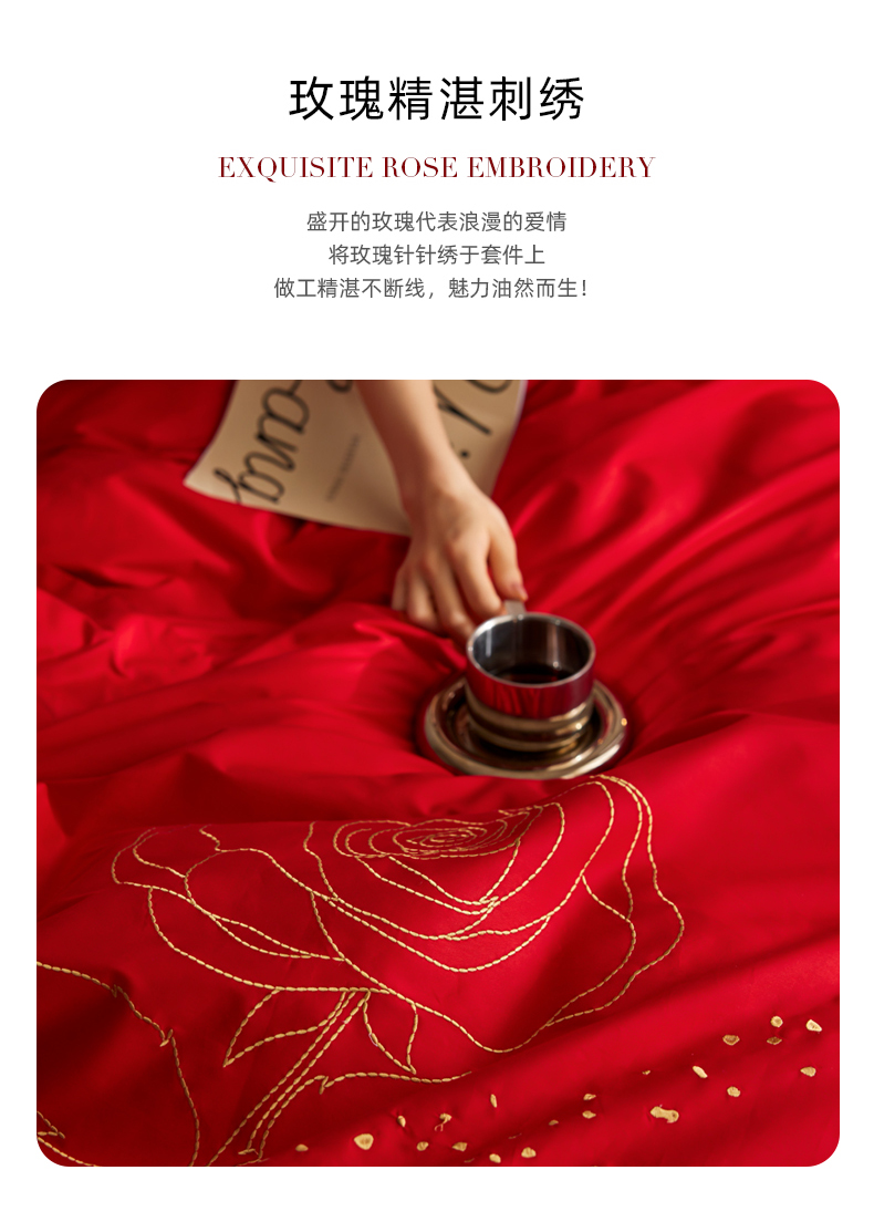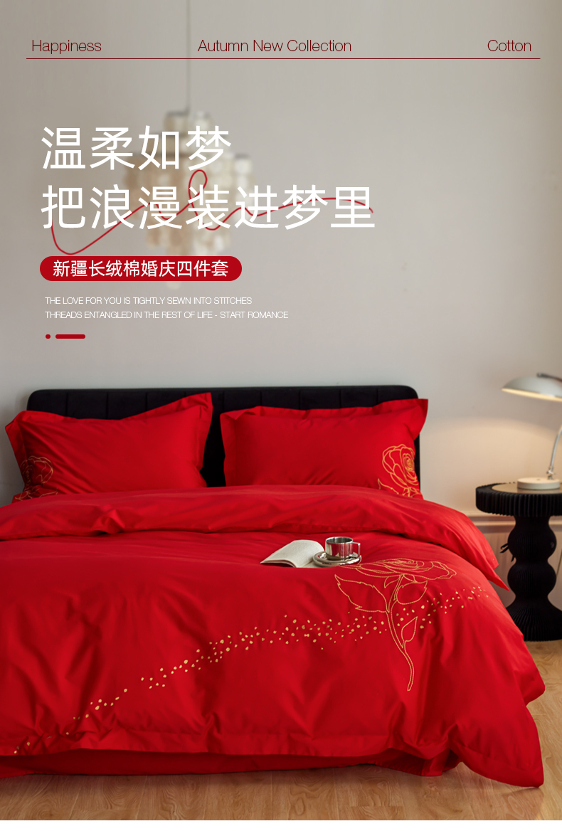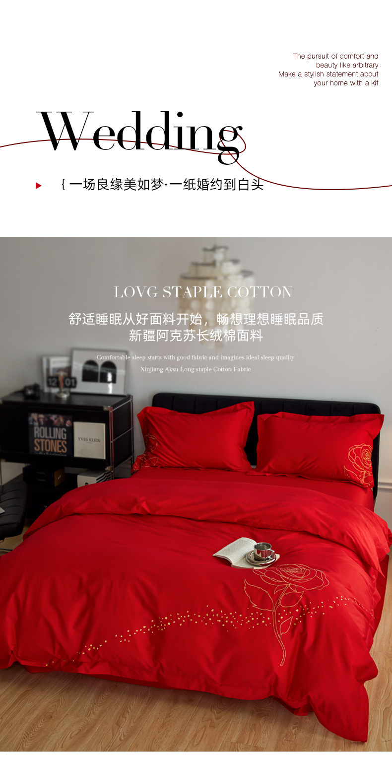 商品名称:千朵森 2024新款新疆长绒棉婚庆刺绣四件套-玫瑰 婚庆红