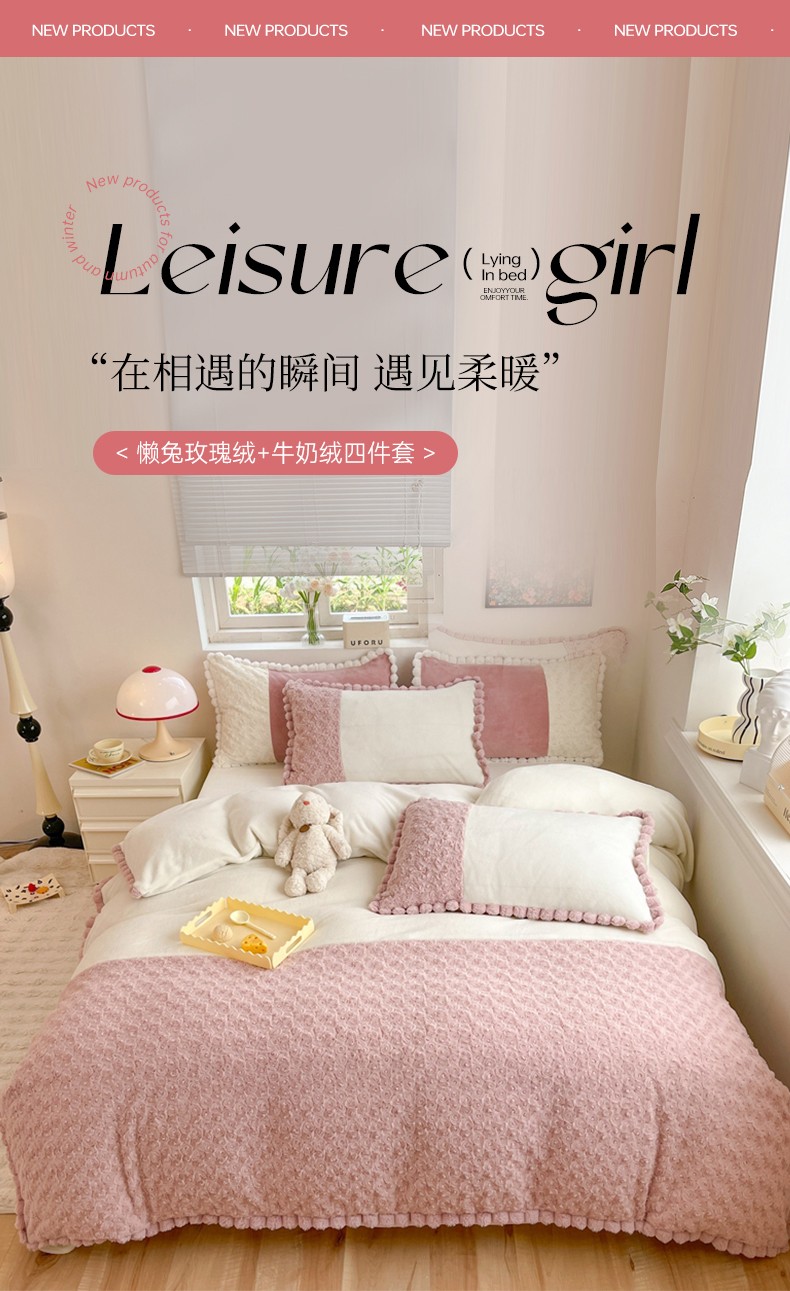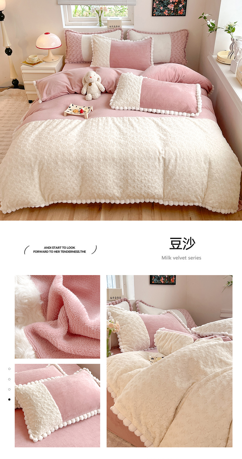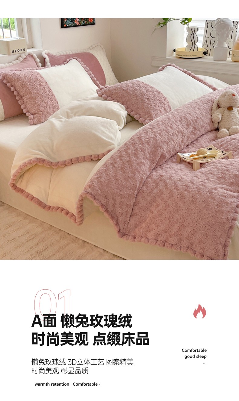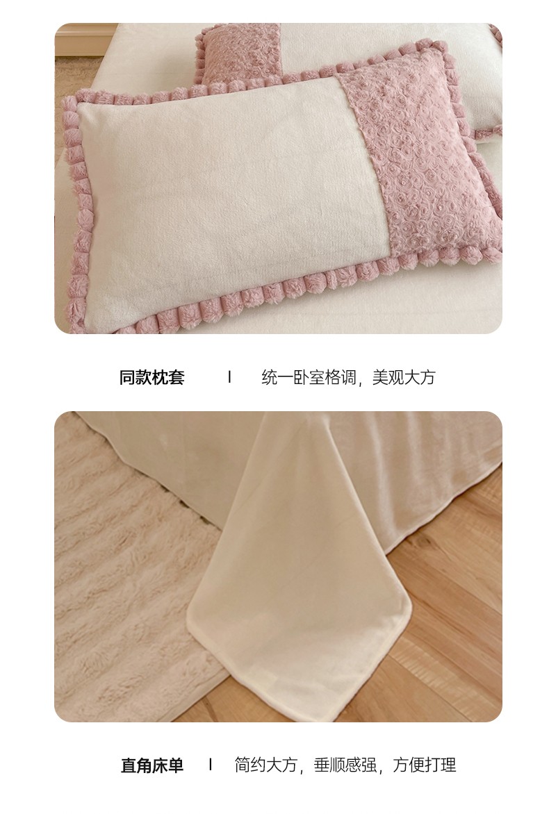 (总)艾米家居 2025秋冬新款浮雕牛奶绒花边四件套,白色,豆沙,粉色