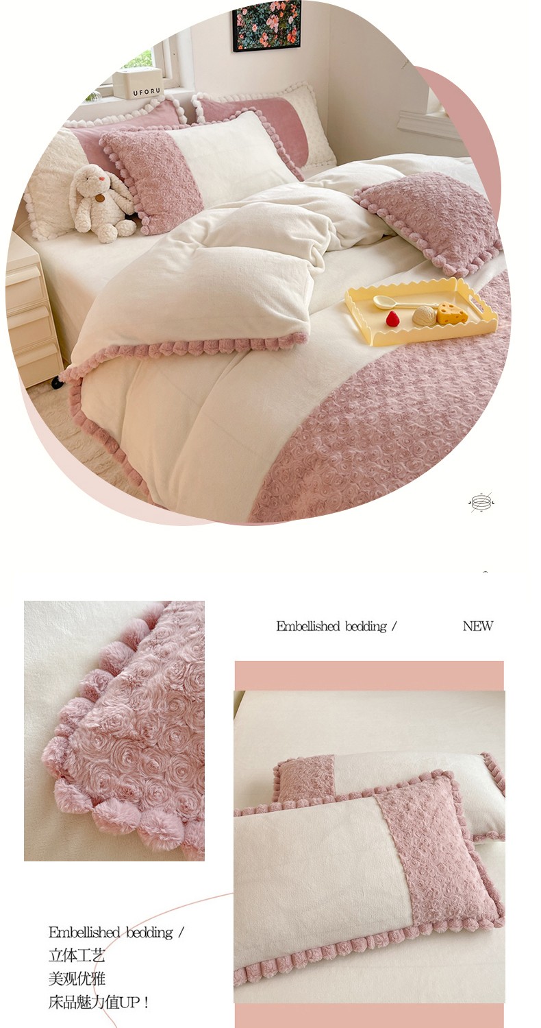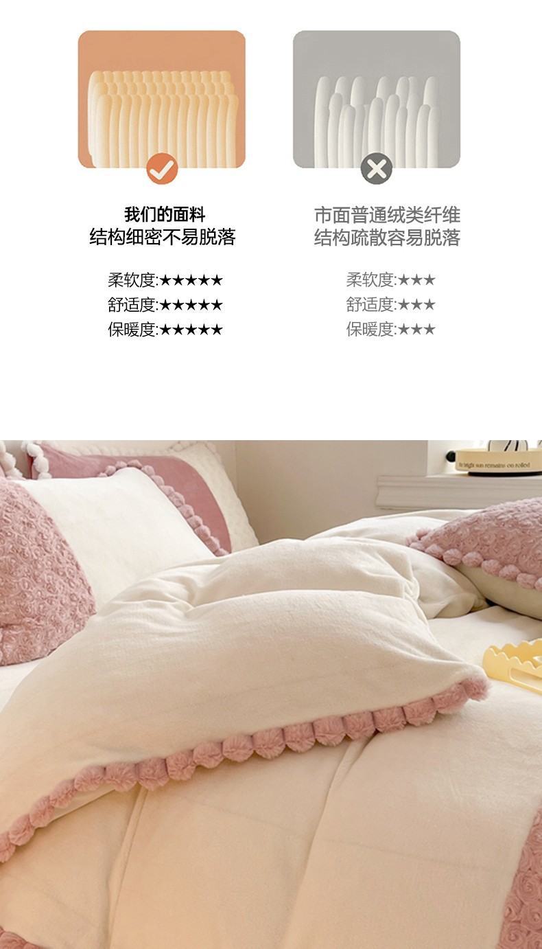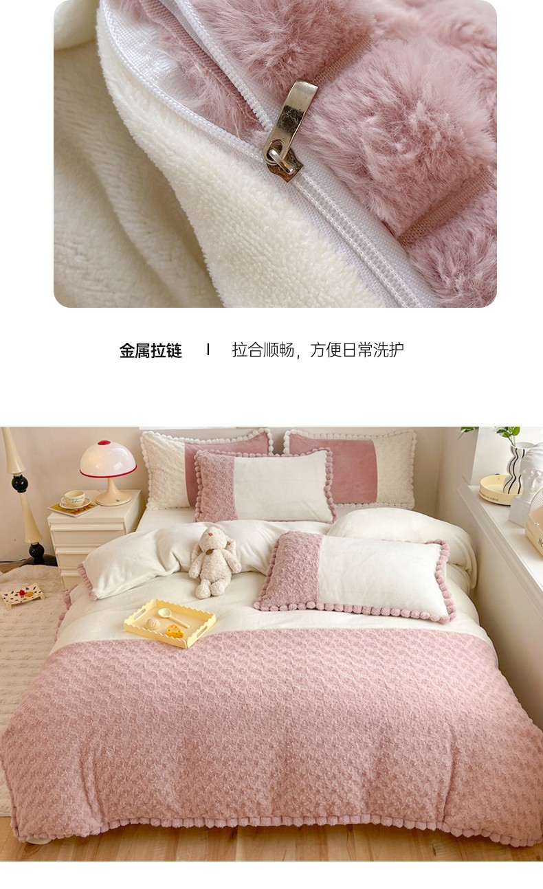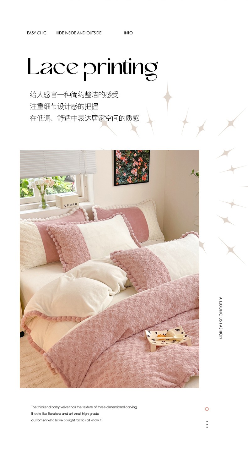 (总)艾米家居 2025秋冬新款浮雕牛奶绒花边四件套,白色,豆沙,粉色