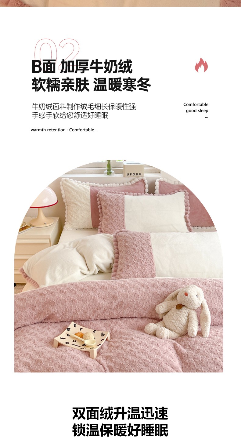 (总)艾米家居 2025秋冬新款牛奶绒泡泡印花花边四件套,豆沙条纹粉,蝴蝶花,太阳花